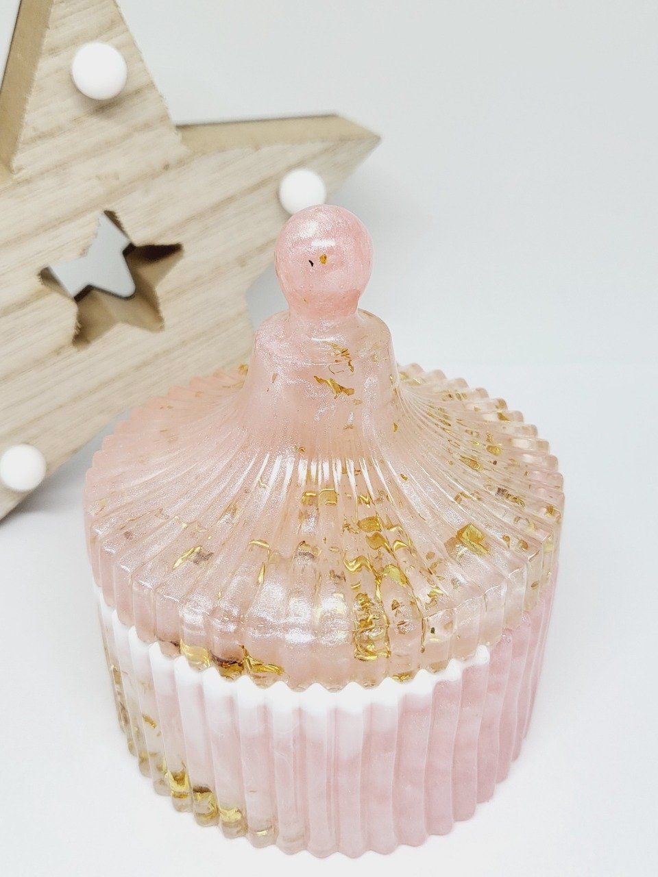 Boîte cirque, réalisée en résine époxy, de couleur rose poudrée, blanche nacrée et translucide avec des incrustations de feuilles dorées.