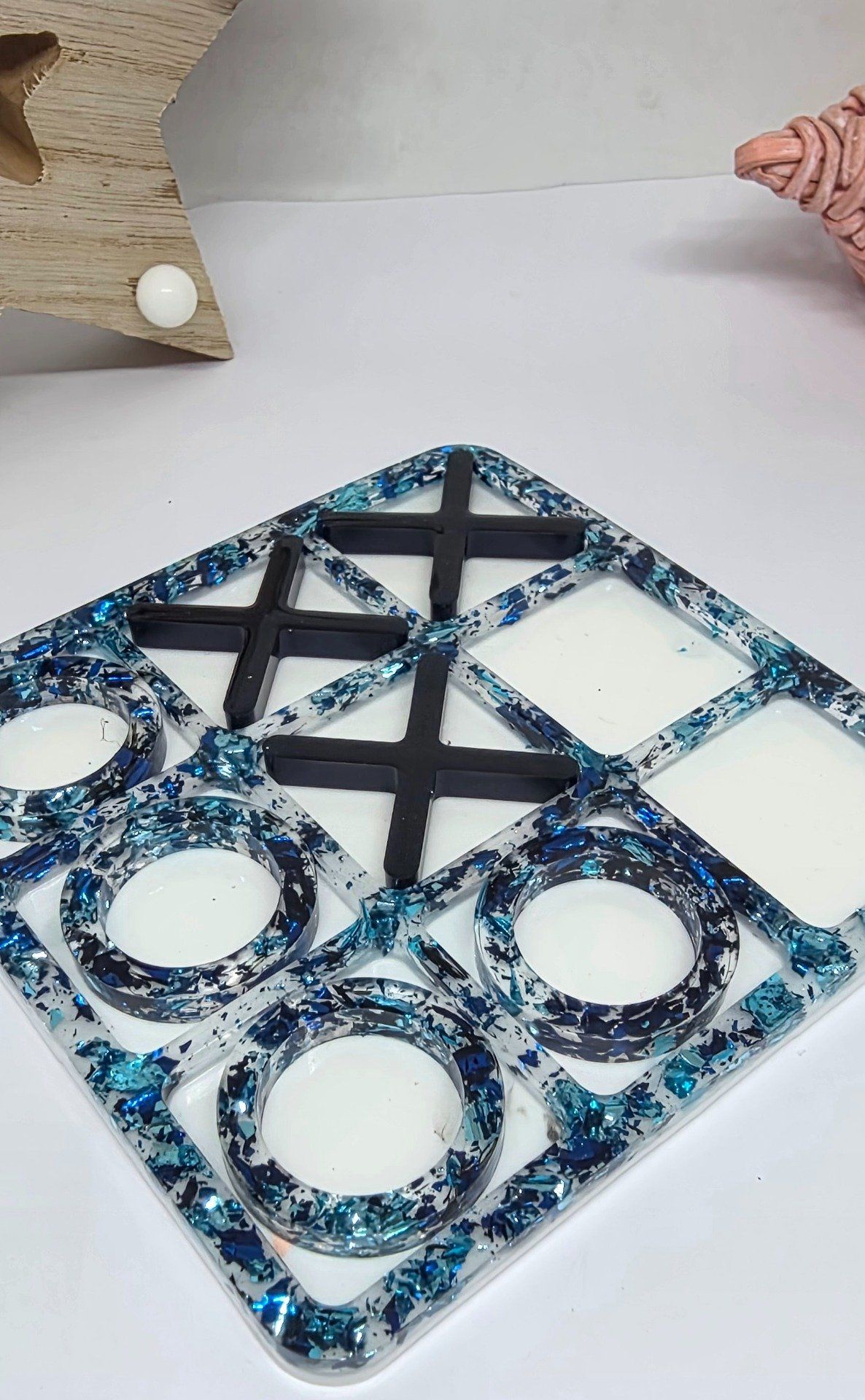 Chaque détail de ce jeu a été minutieusement travaillé à la main, garantissant une qualité et une finition irréprochables. Que vous soyez amateur de design, de jeux classiques revisités ou simplement en quête d’un objet unique, ce jeu de morpion en résine époxy saura combler vos attentes.