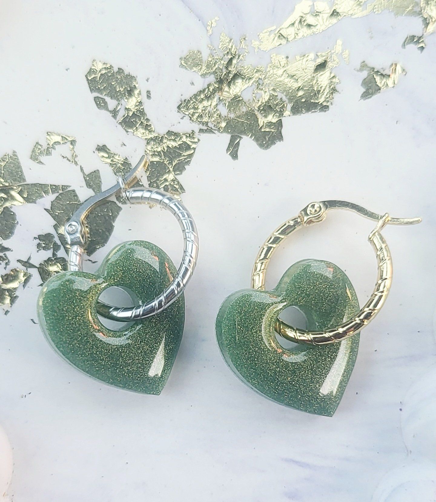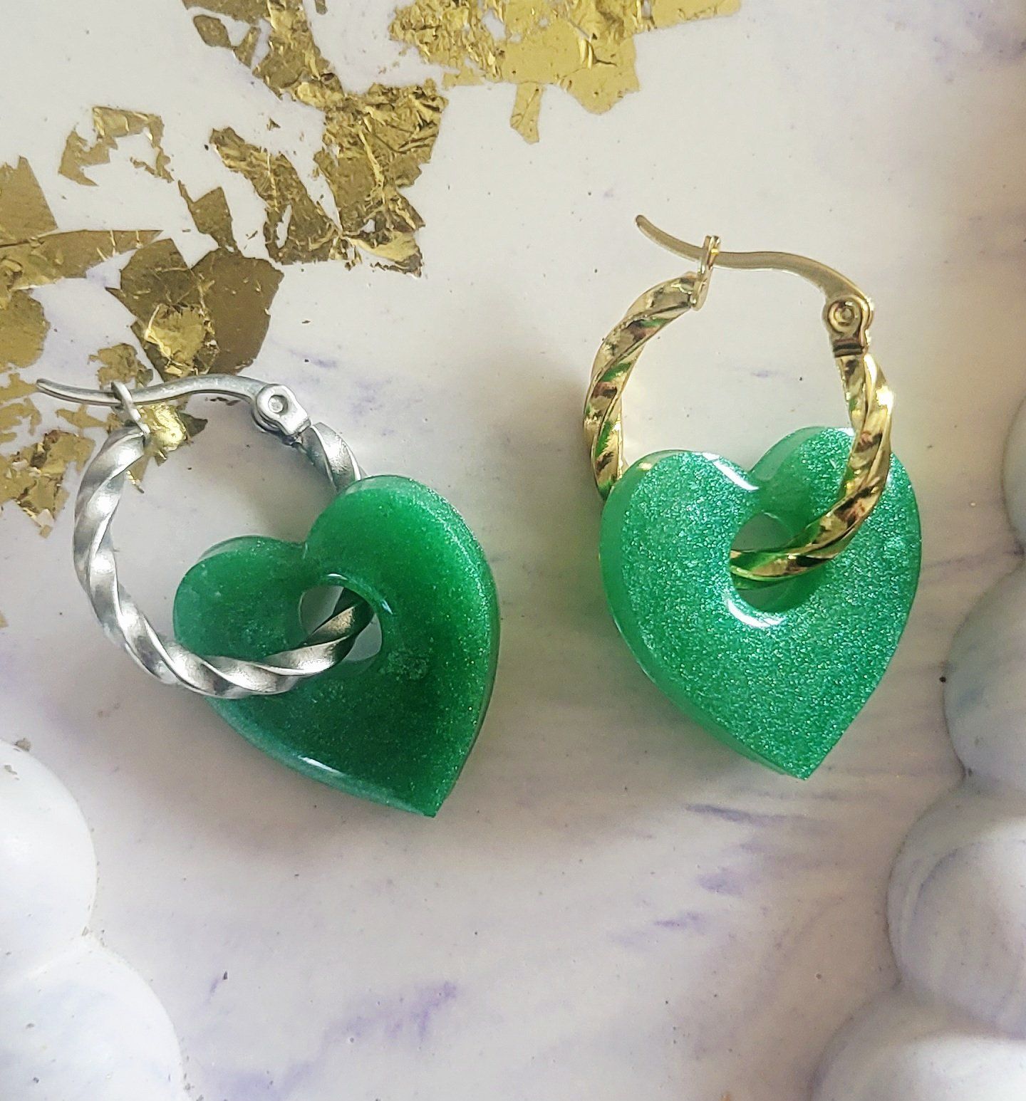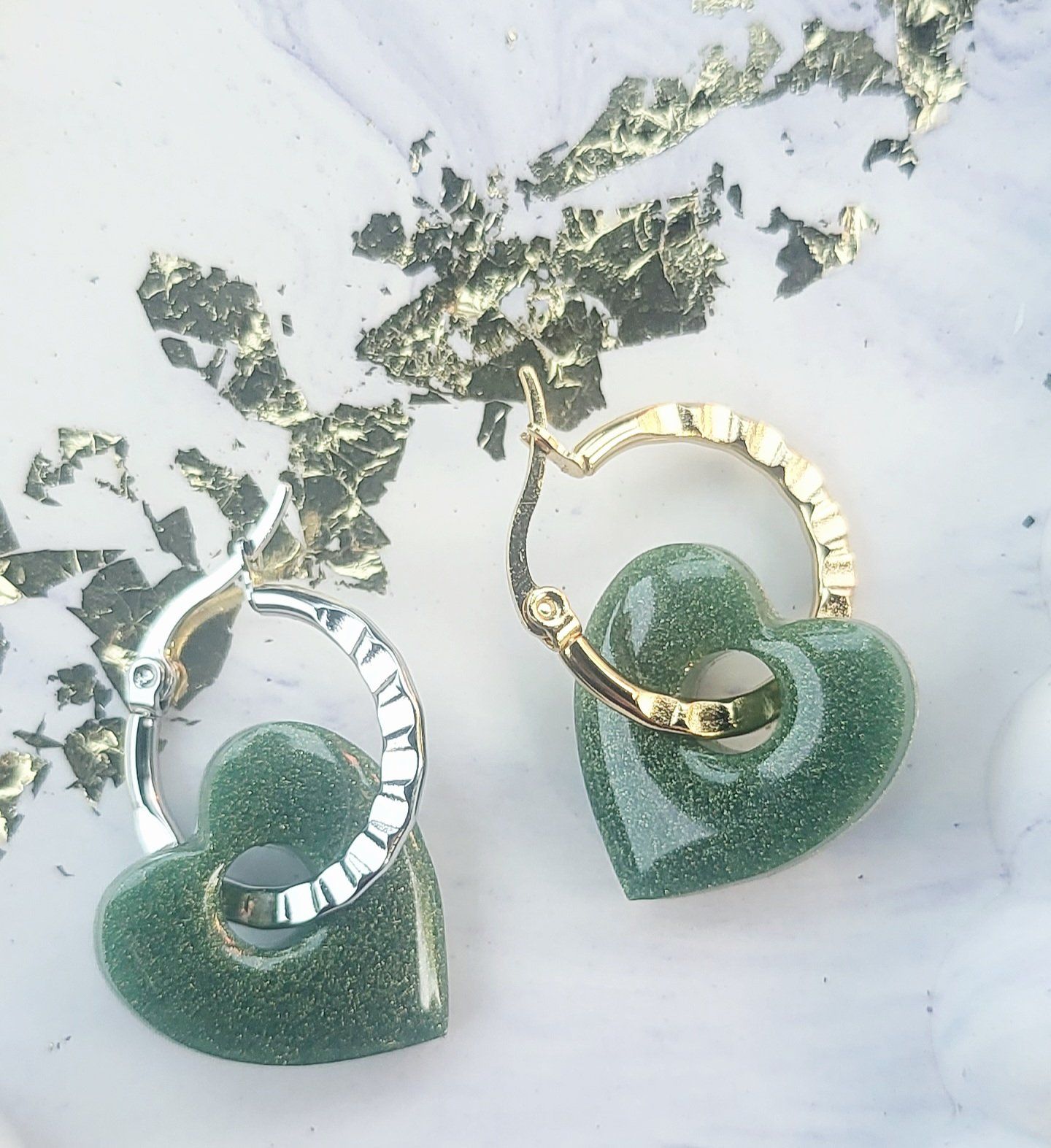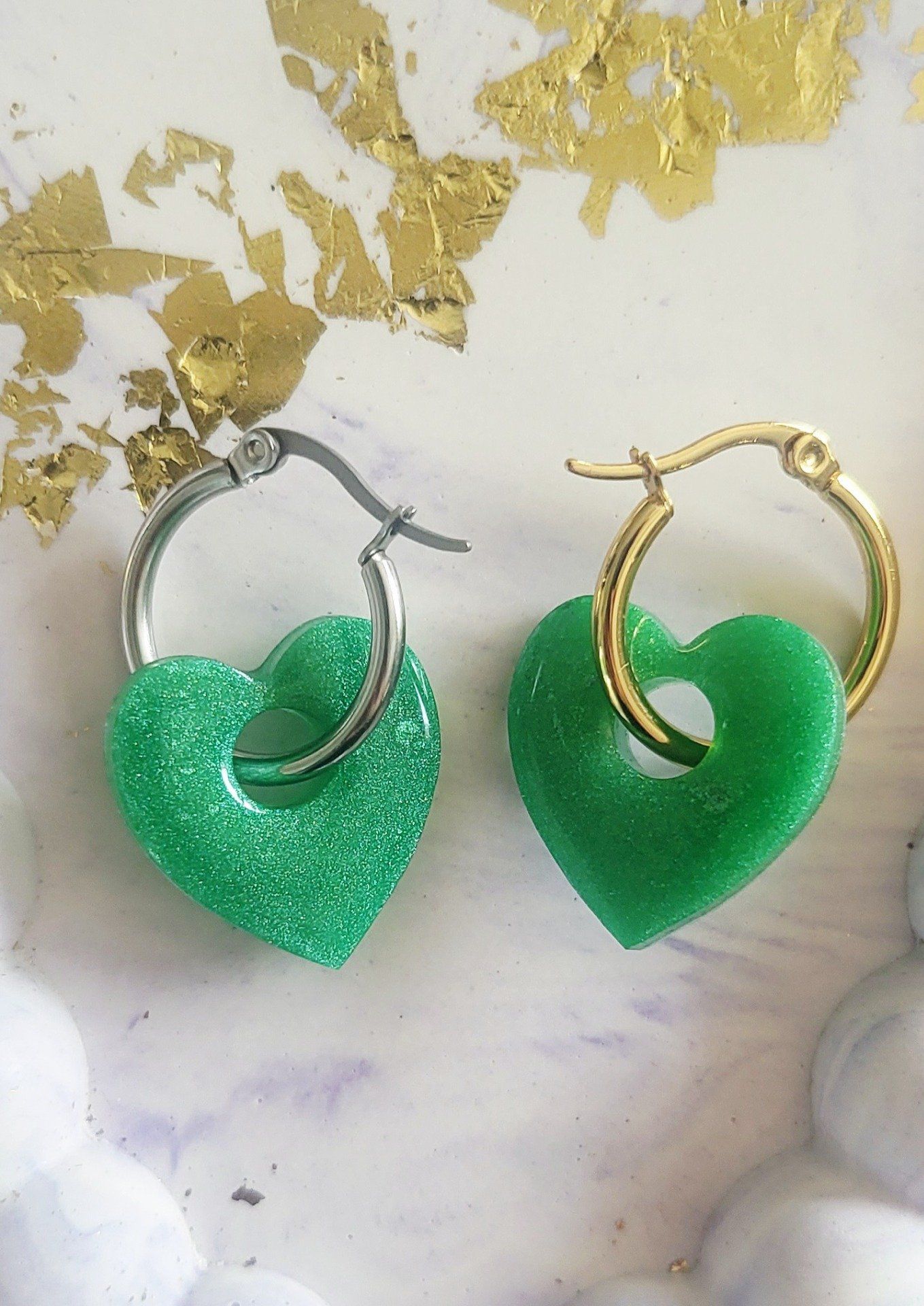 Lot de 2 Pampilles cœur en résine époxy verte (différentes nuances disponibles). Vendues en lot de 2, mais sans les créoles (différents modèles possibles) qui peuvent être commandées séparément.