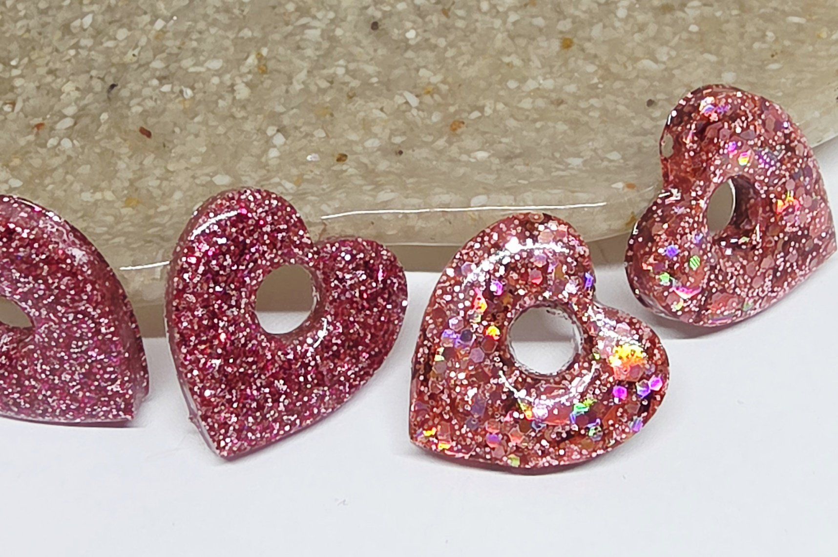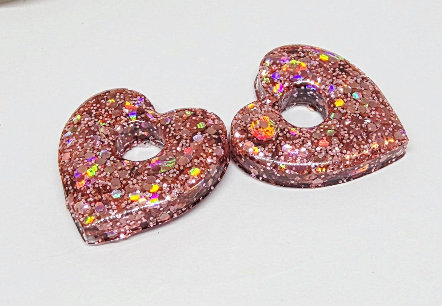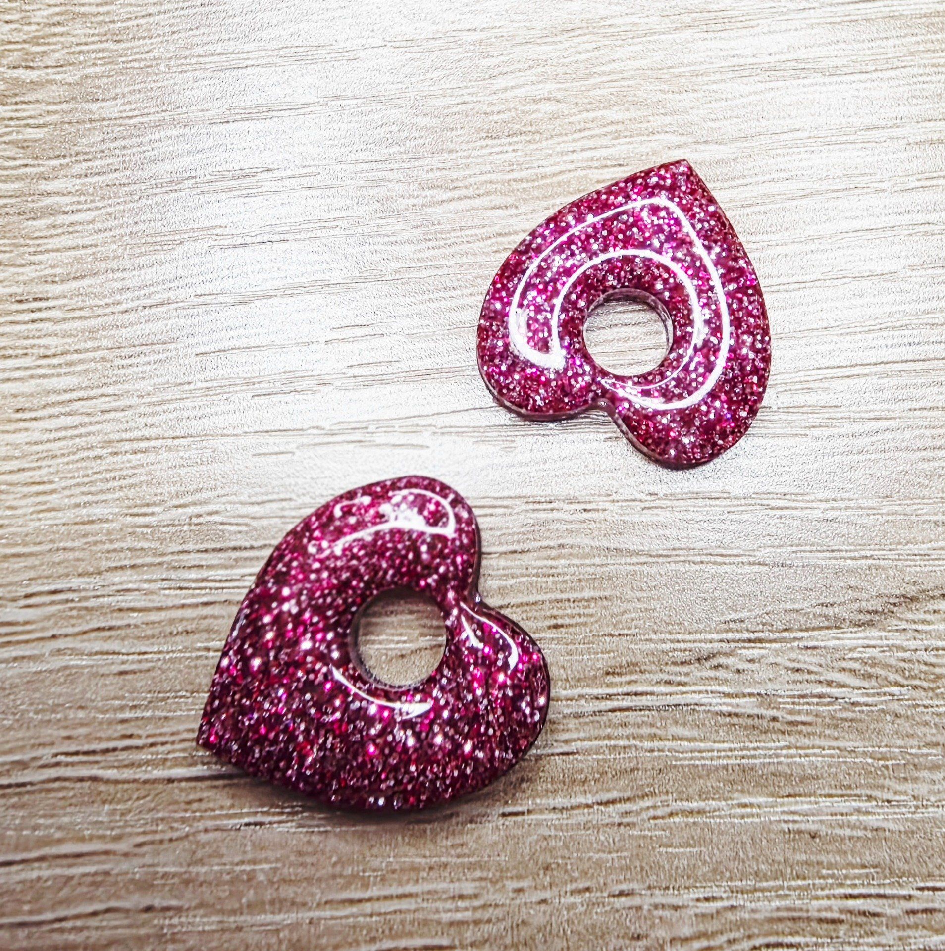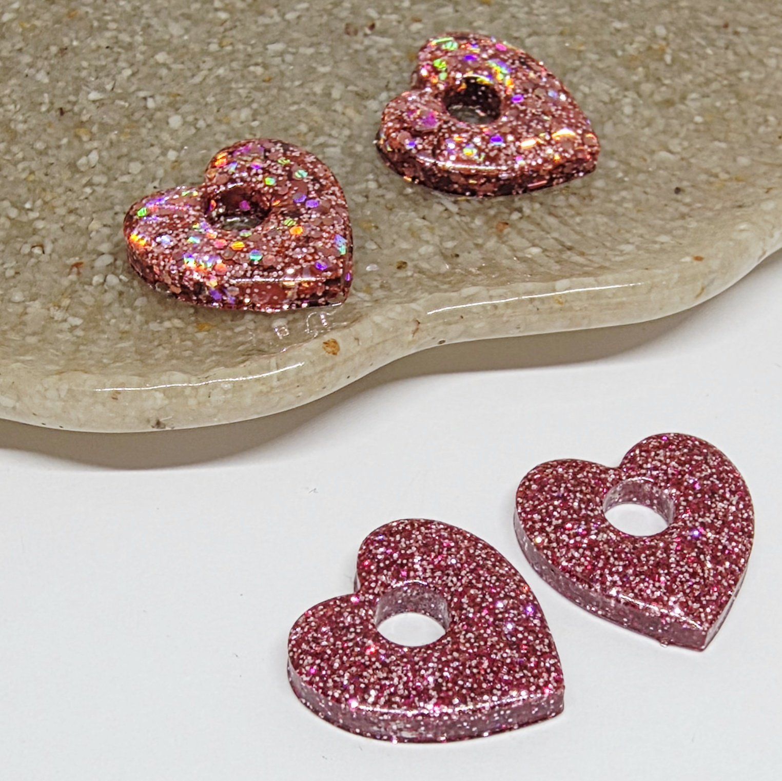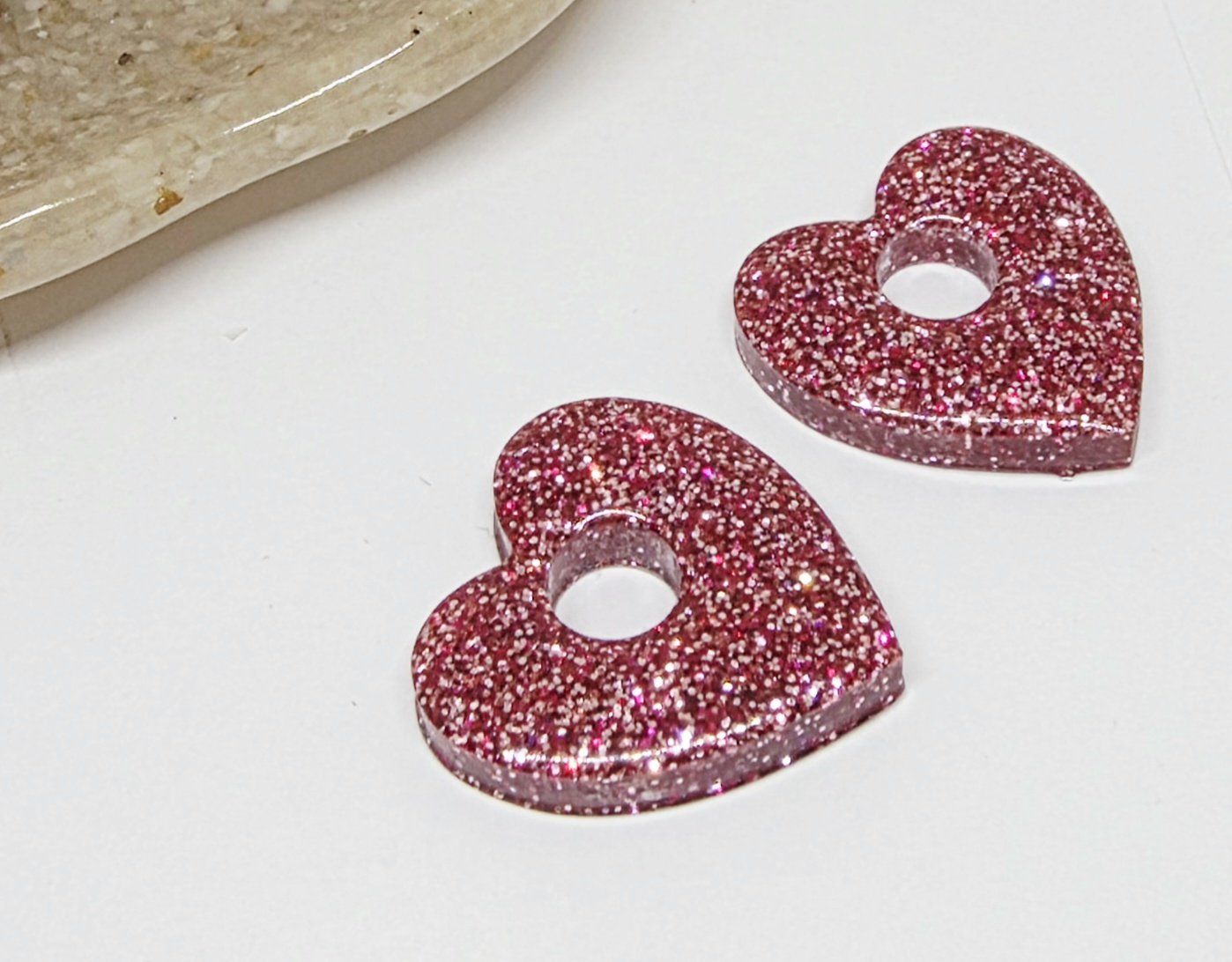 Lot de 2 Pampilles cœur en résine époxy avec des incrustations de paillettes rose.