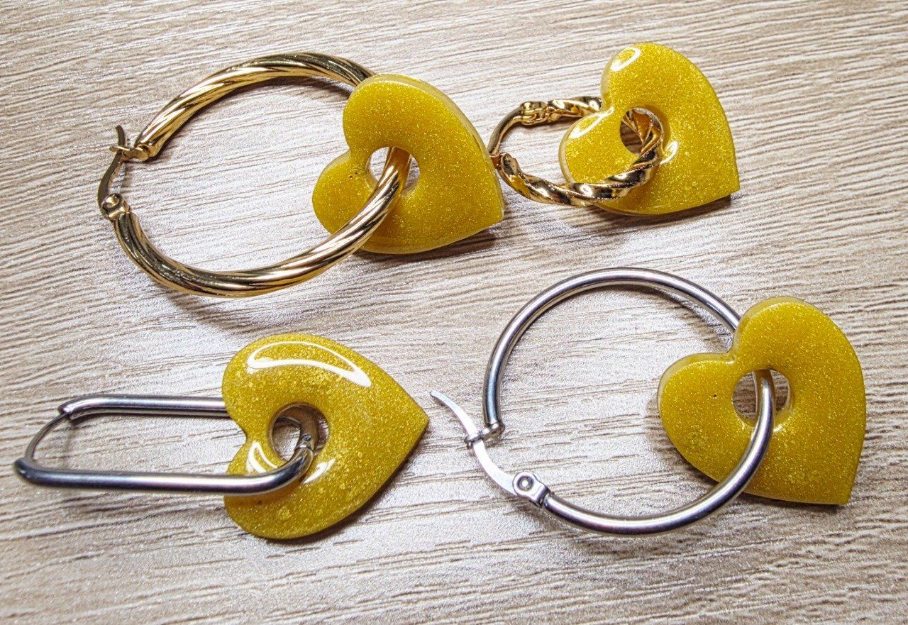 Lot de 2 Pampilles cœur en résine époxy jaune moutarde. Vendues sans les créoles (différents modèles qui peuvent être commandées séparément sur le site lesresinespassions.com).