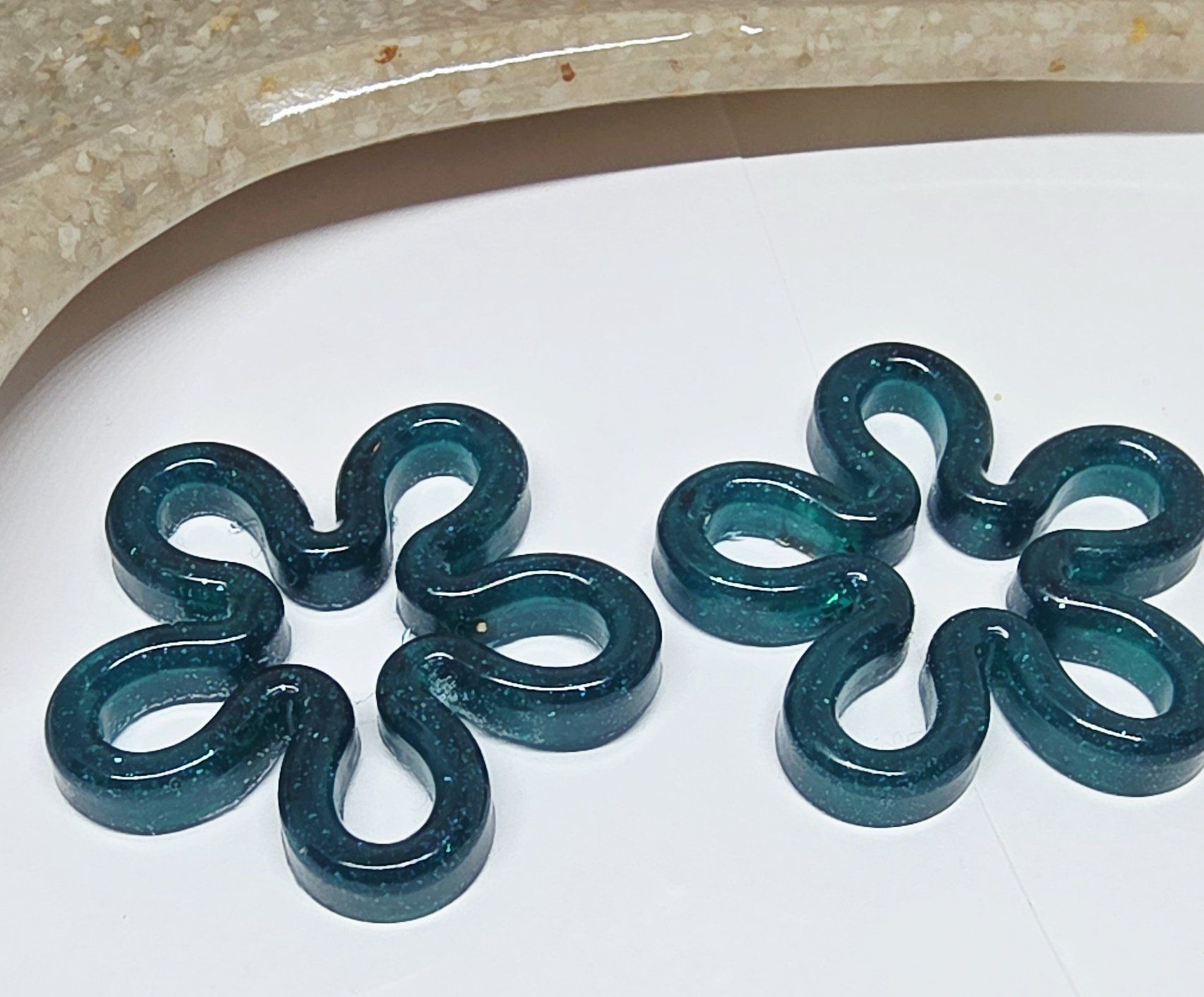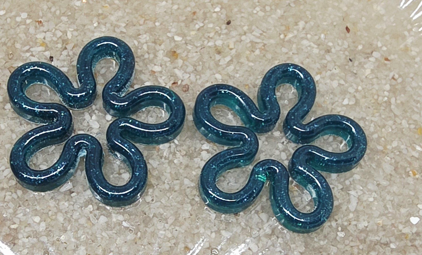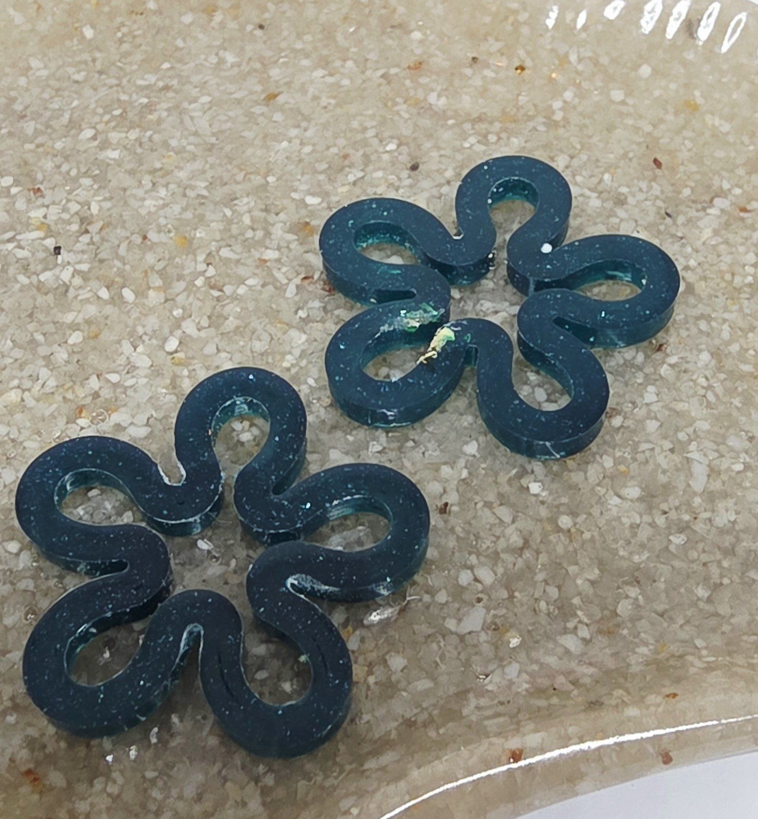 Lot de 2 Pampilles, Diana, en résine époxy verte émeraude légèrement pailletée, compatibles avec tous les modèles de créoles. Feuilles Dorées incrustée sur l'arrière (défaut).