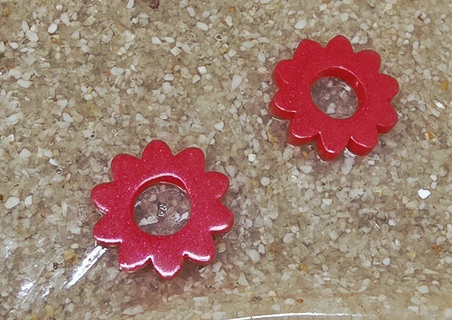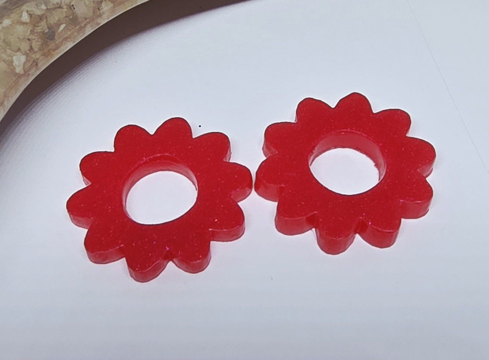 Lot de 2 Pampilles fleur 10 pétales en résine époxy rouge. Vendues sans les créoles (différents modèles possibles) qui peuvent être commandées séparément.