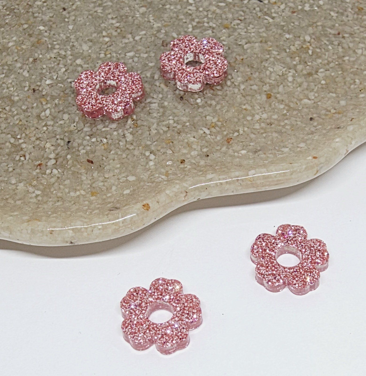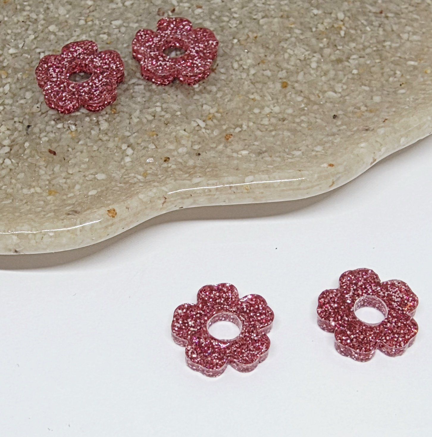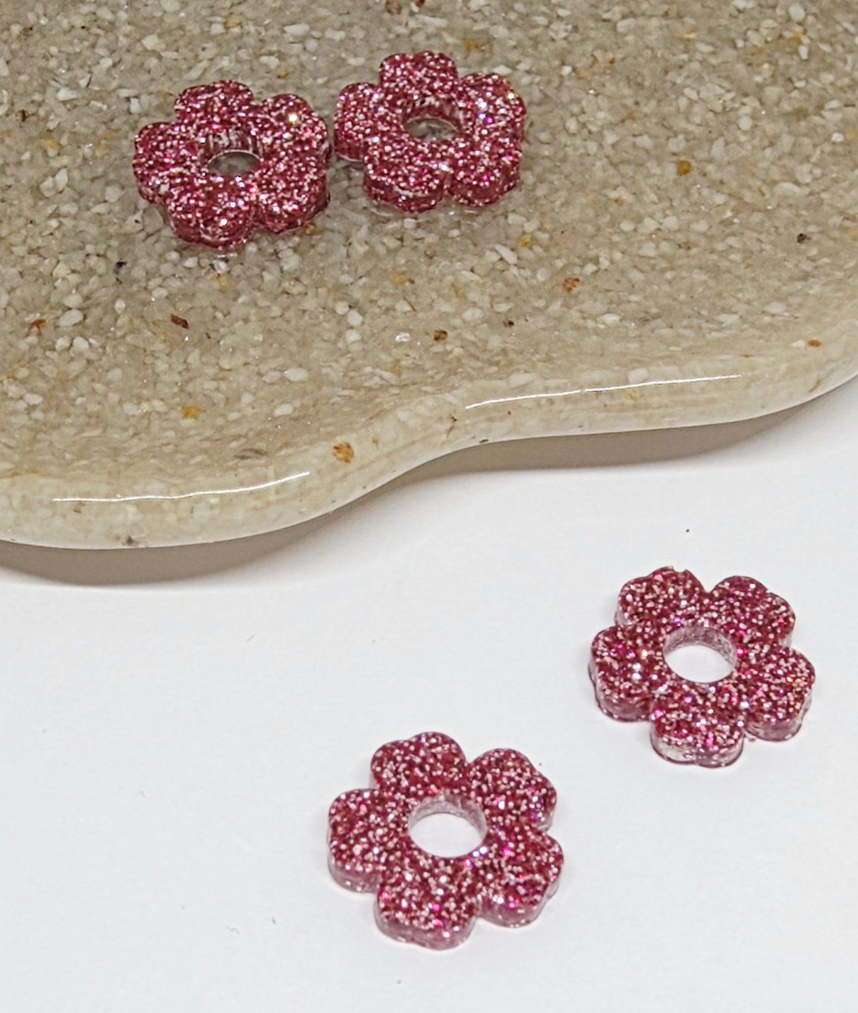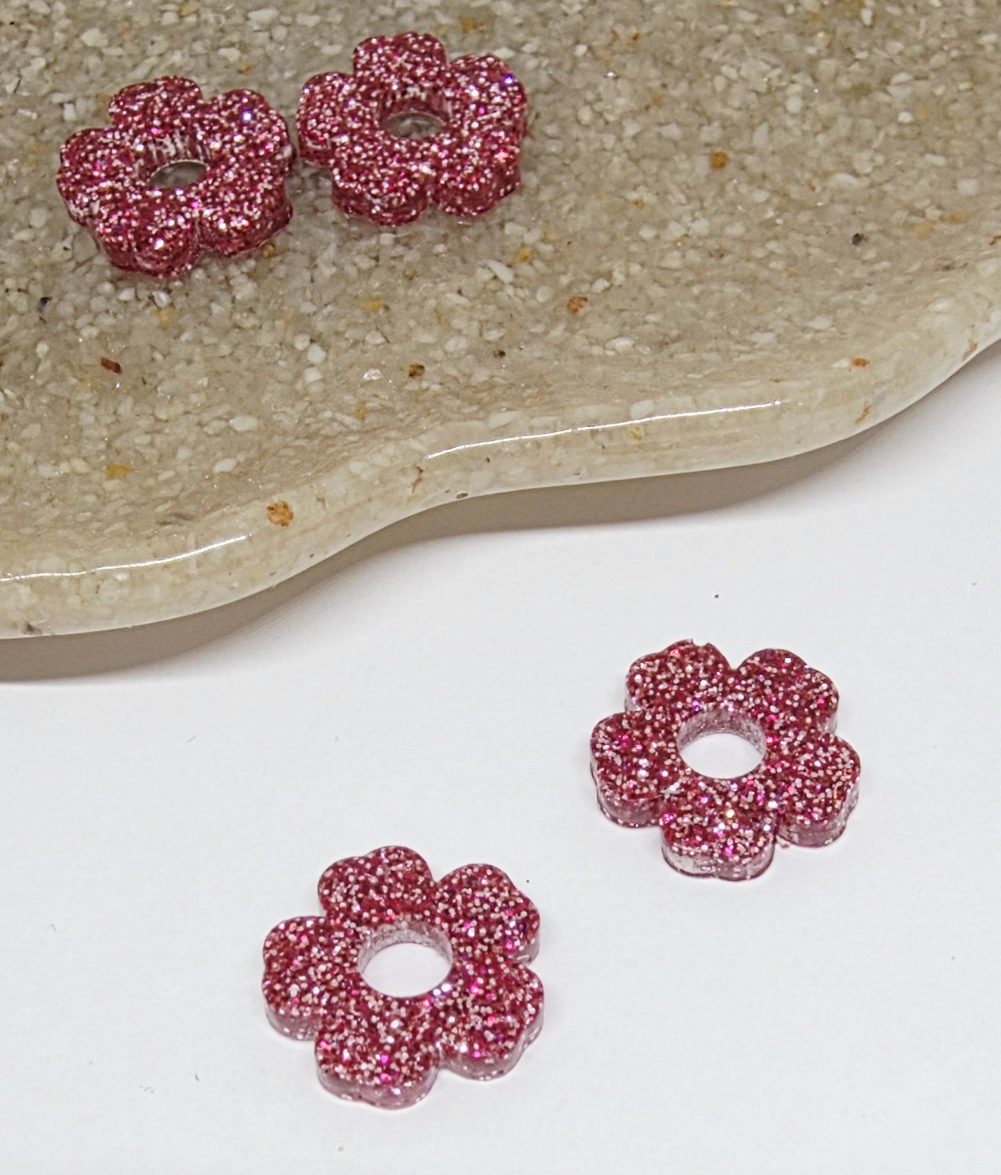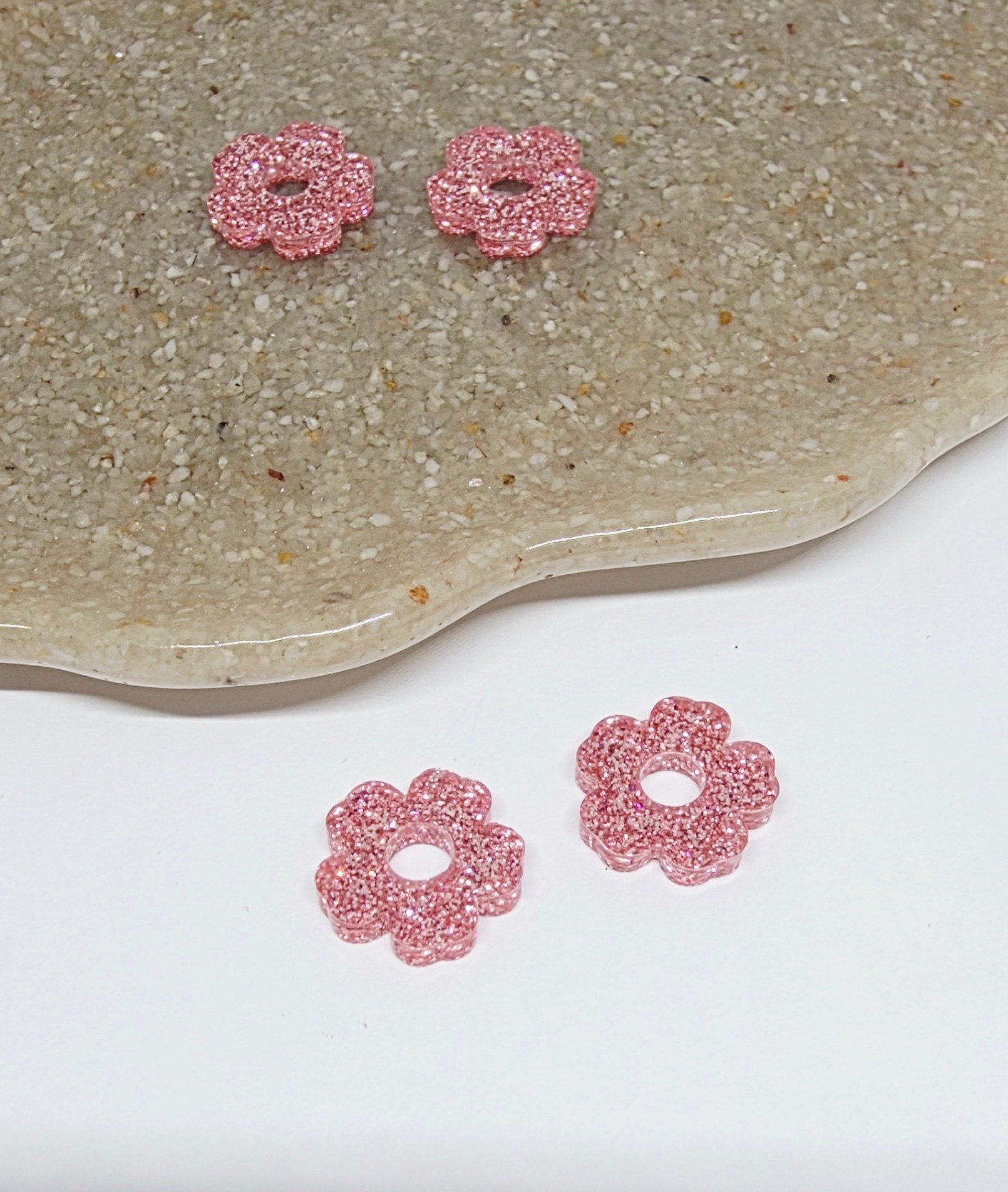 Lot de 2 Pampilles en forme de fleurs, 5 pétales, en résine époxy avec des paillettes roses. Vendues en lot de 2. Vendues sans les créoles.