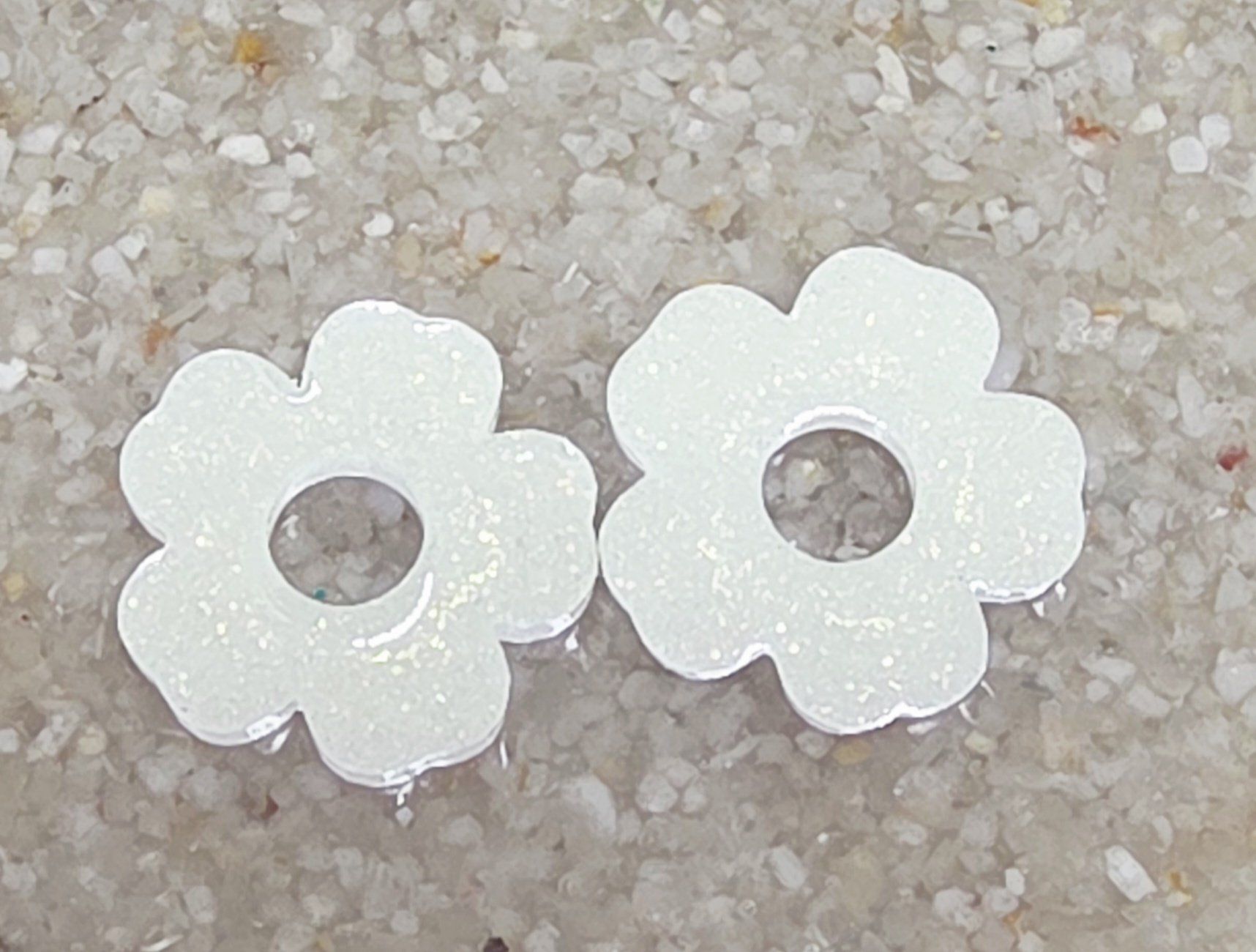 Lot de 2 Pampilles en forme de fleurs, 5 pétales, en résine époxy blanche irisée opaque. Vendues en lot de 2. Vendues sans les créoles.