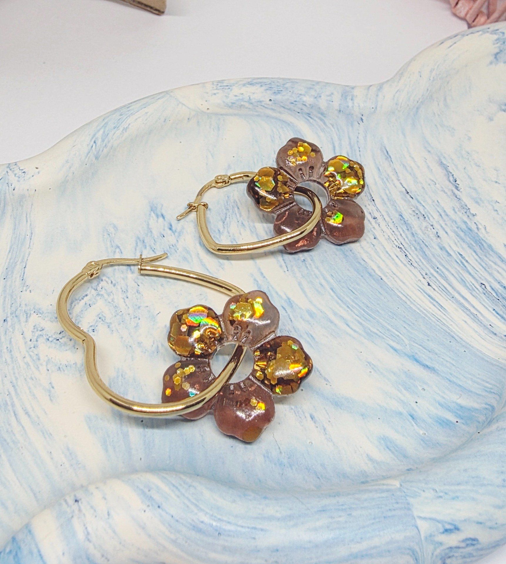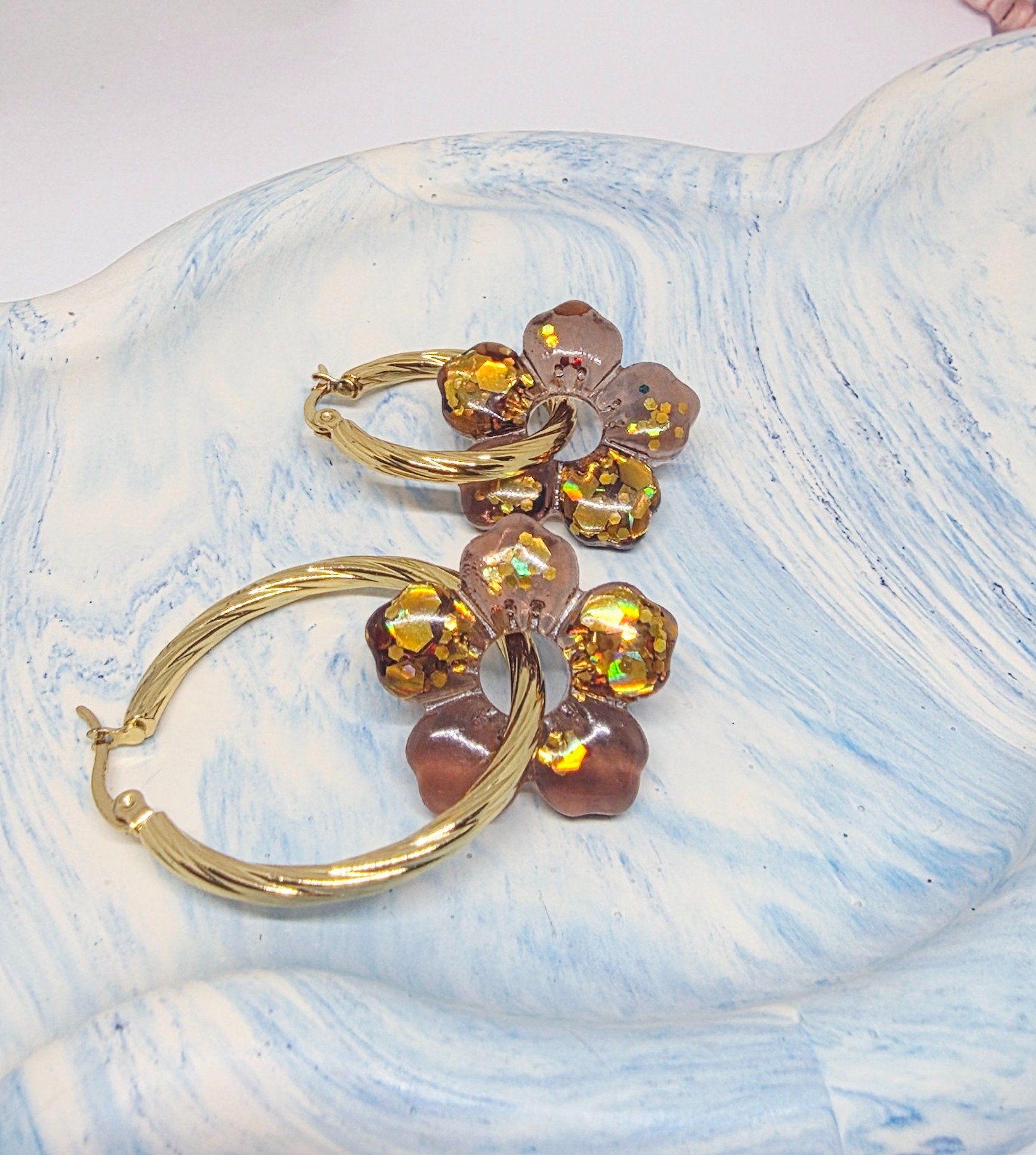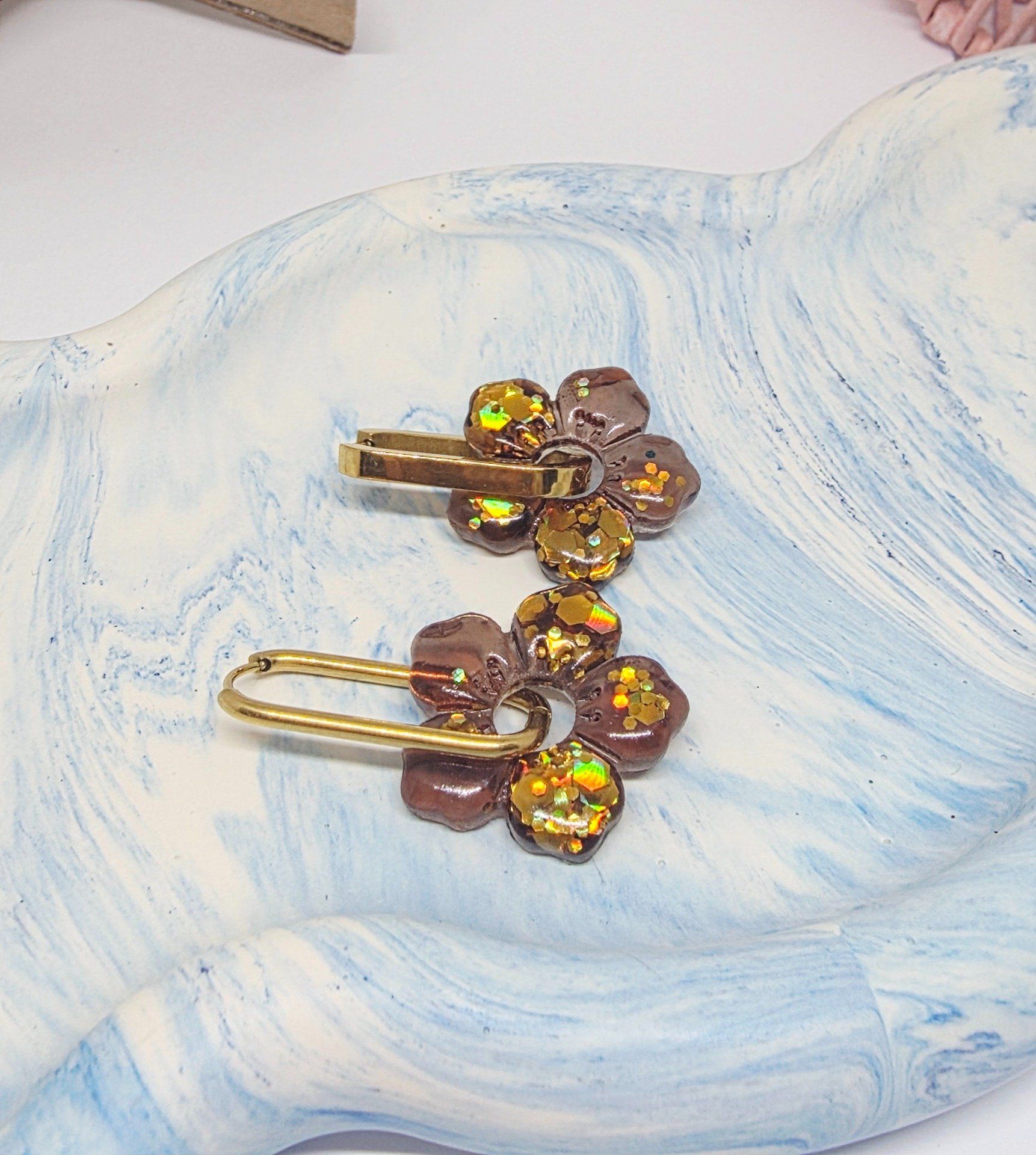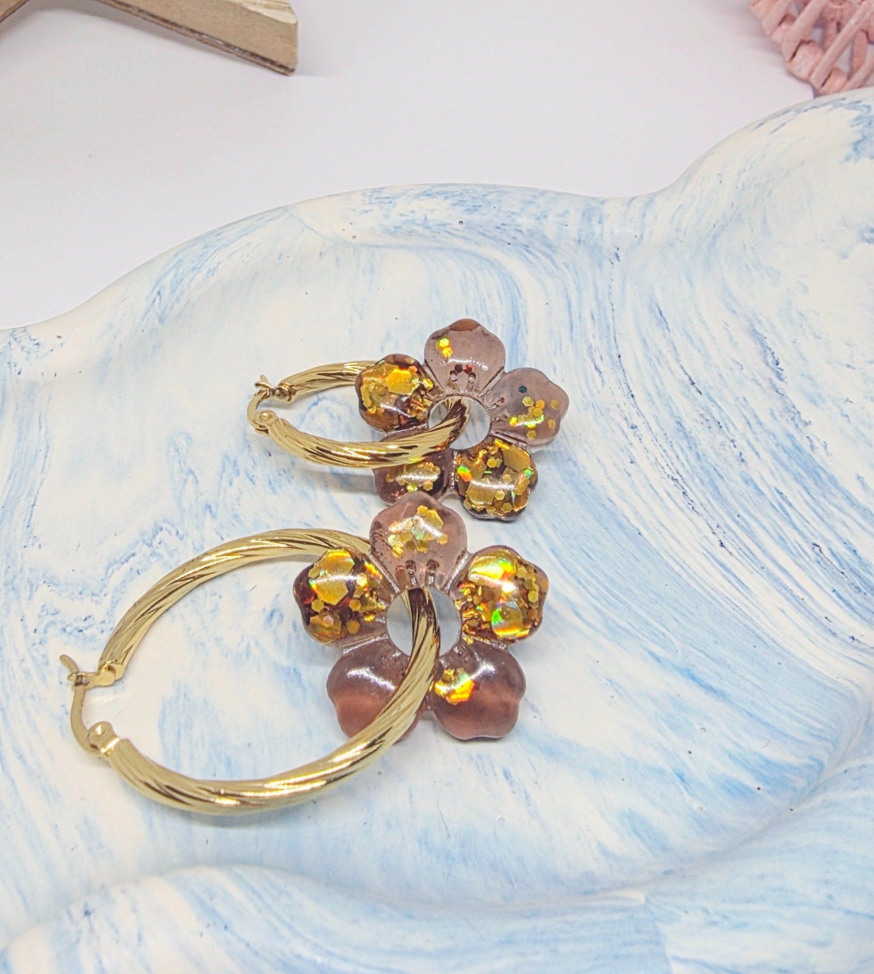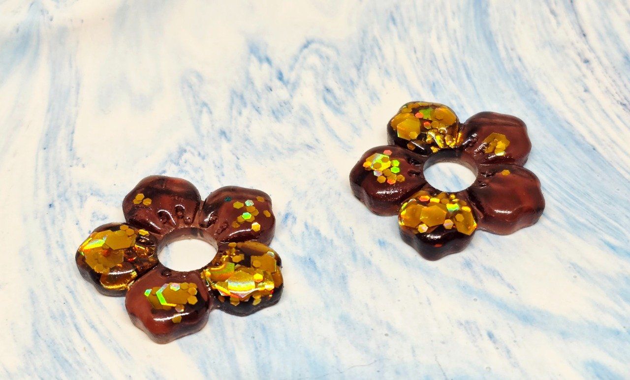 Lot de 2 Pampilles, Clara, en forme de fleur 5 pétales, en résine époxy translucide marron avec des paillettes dorées, compatibles avec les créoles disponibles sur le site et dont la taille est supérieure à 20mm.