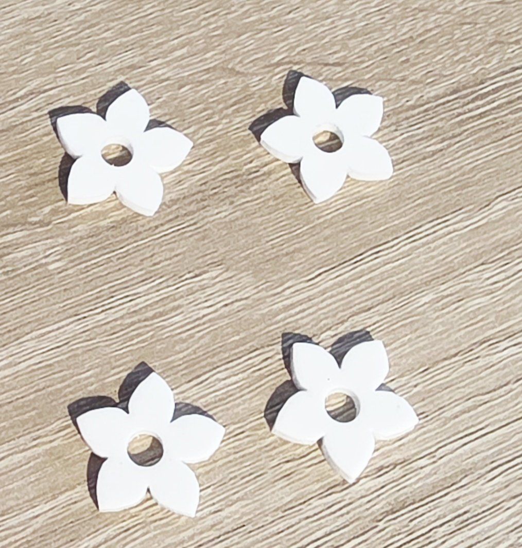 Lot de 2 Pampilles, fleur de tiaré, en résine époxy de couleur blanche opaque.