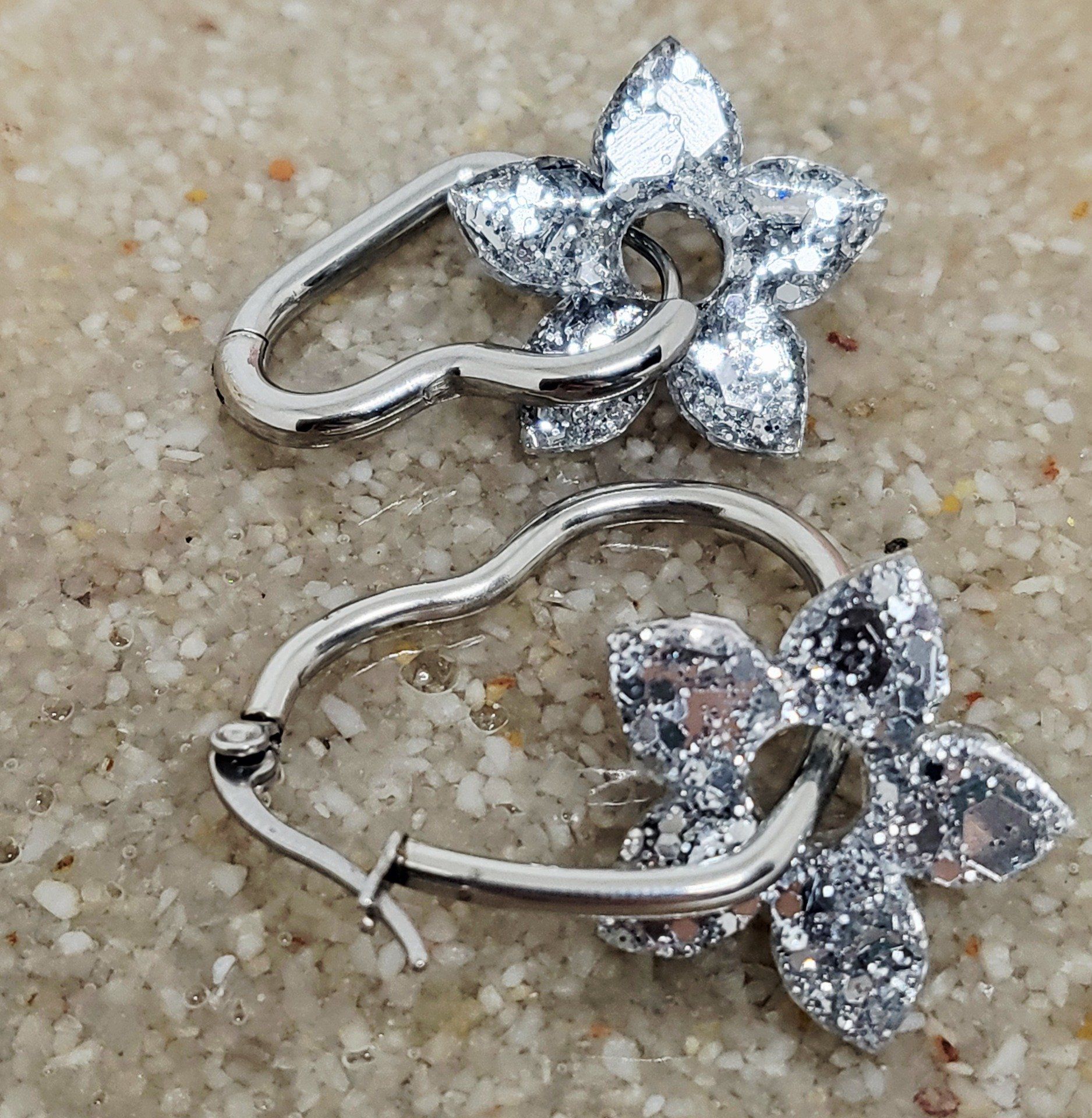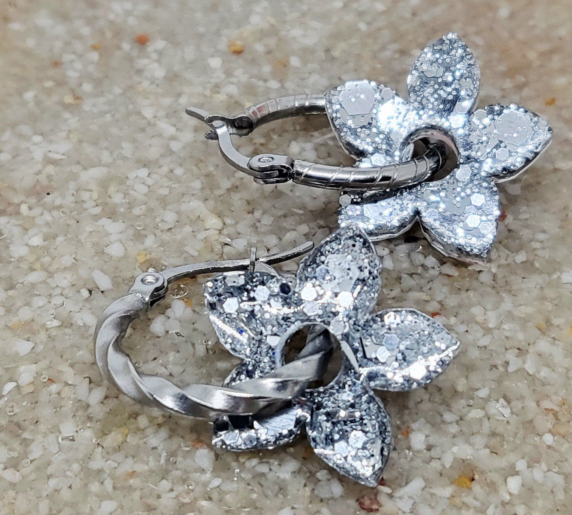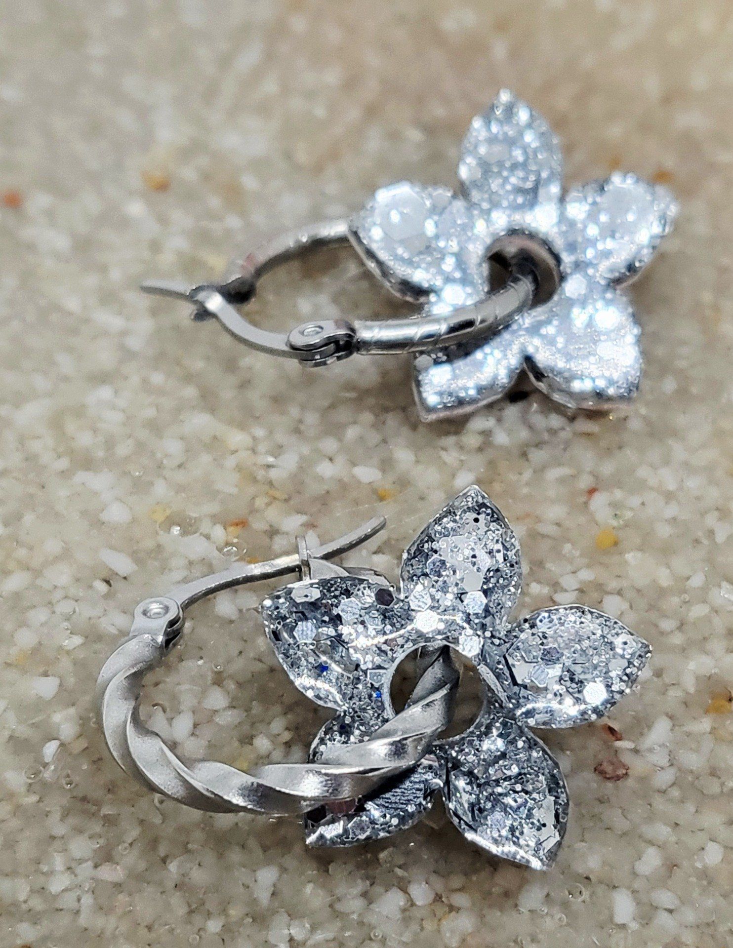 Lot de 2 Pampilles, fleur de tiaré, en résine époxy avec des incrustations de paillettes argentées.