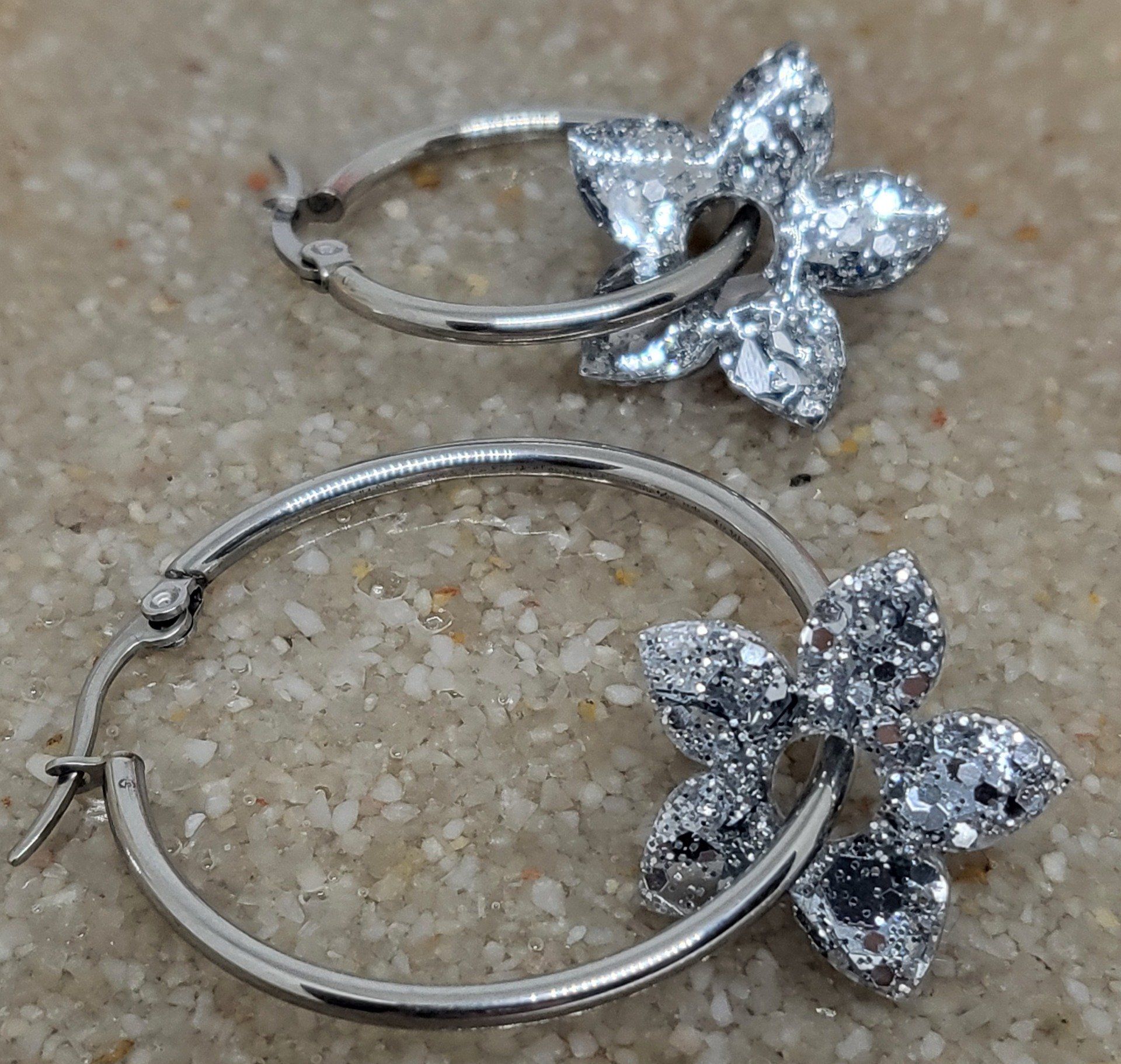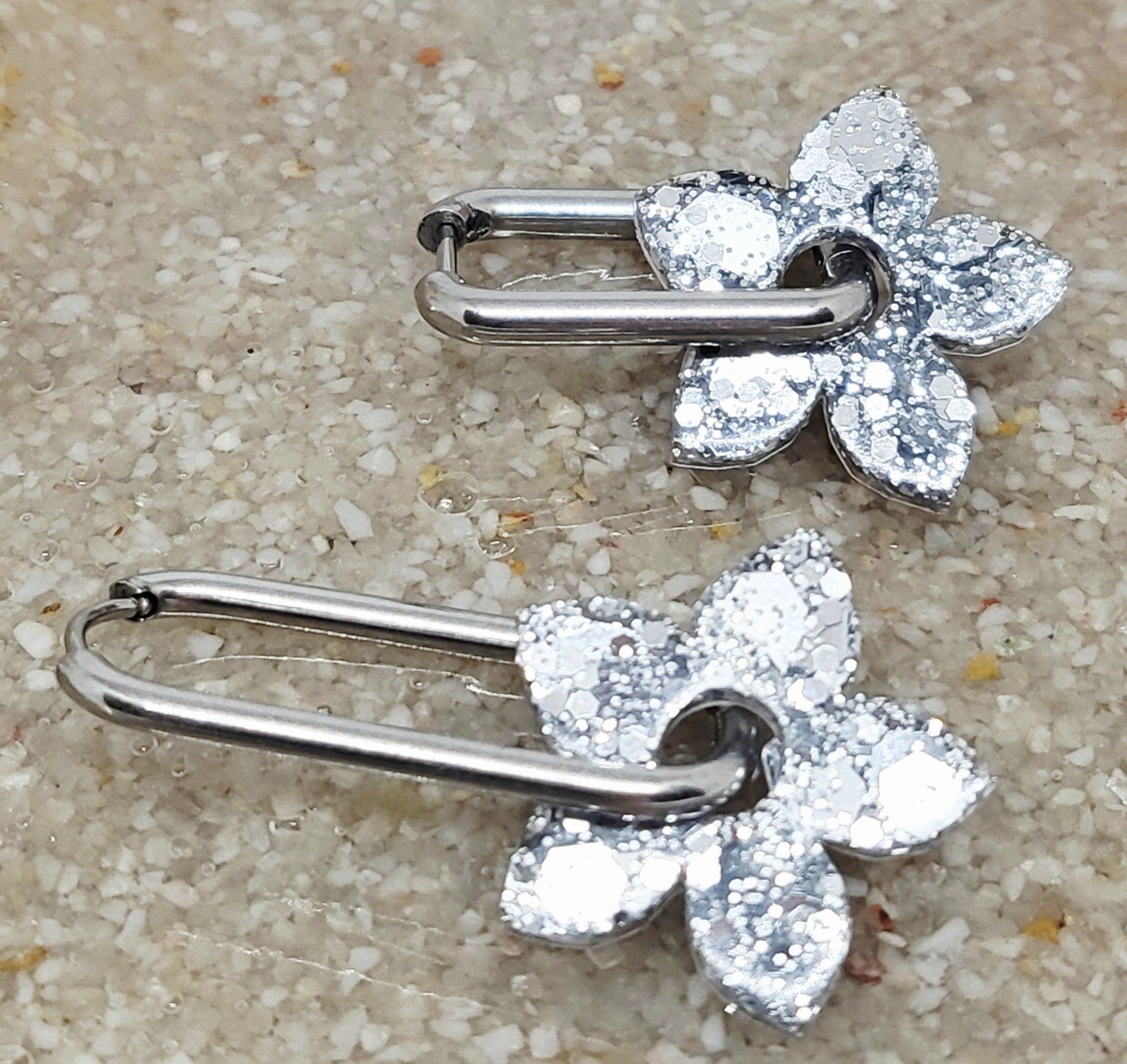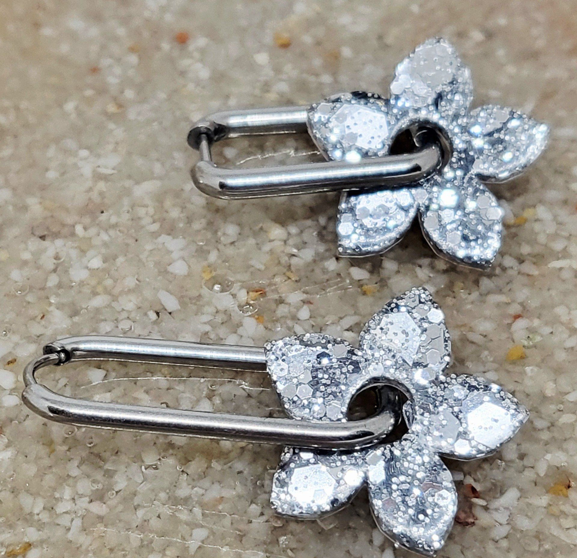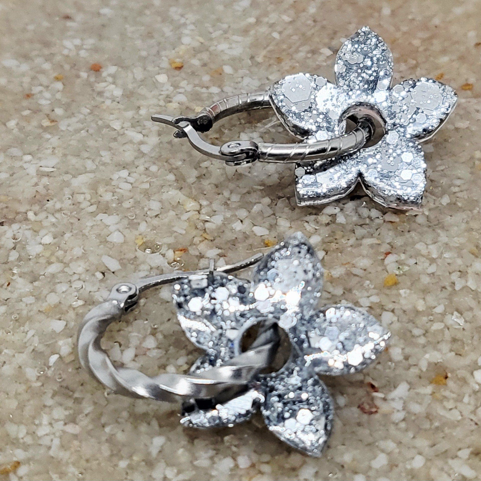 Lot de 2 Pampilles, fleur de tiaré, en résine époxy avec des incrustations de paillettes argentées.