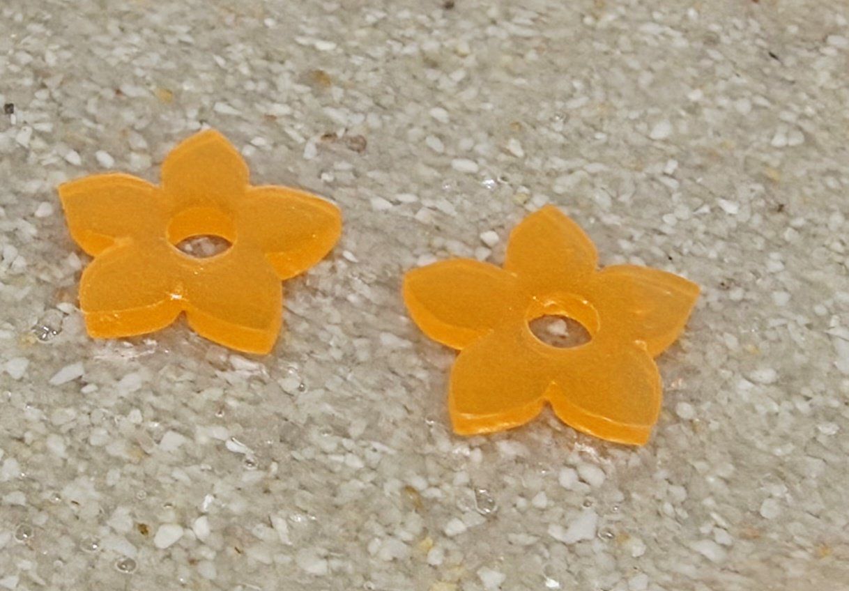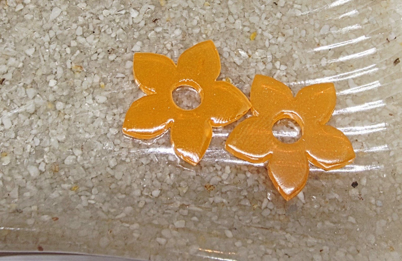 Lot de 2 Pampilles, fleur de tiaré, en résine époxy orange.