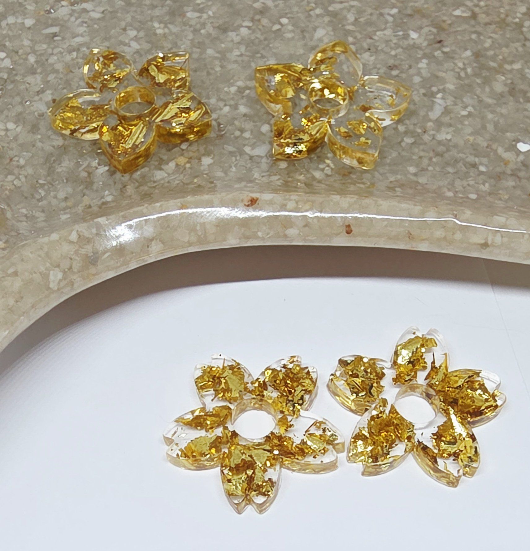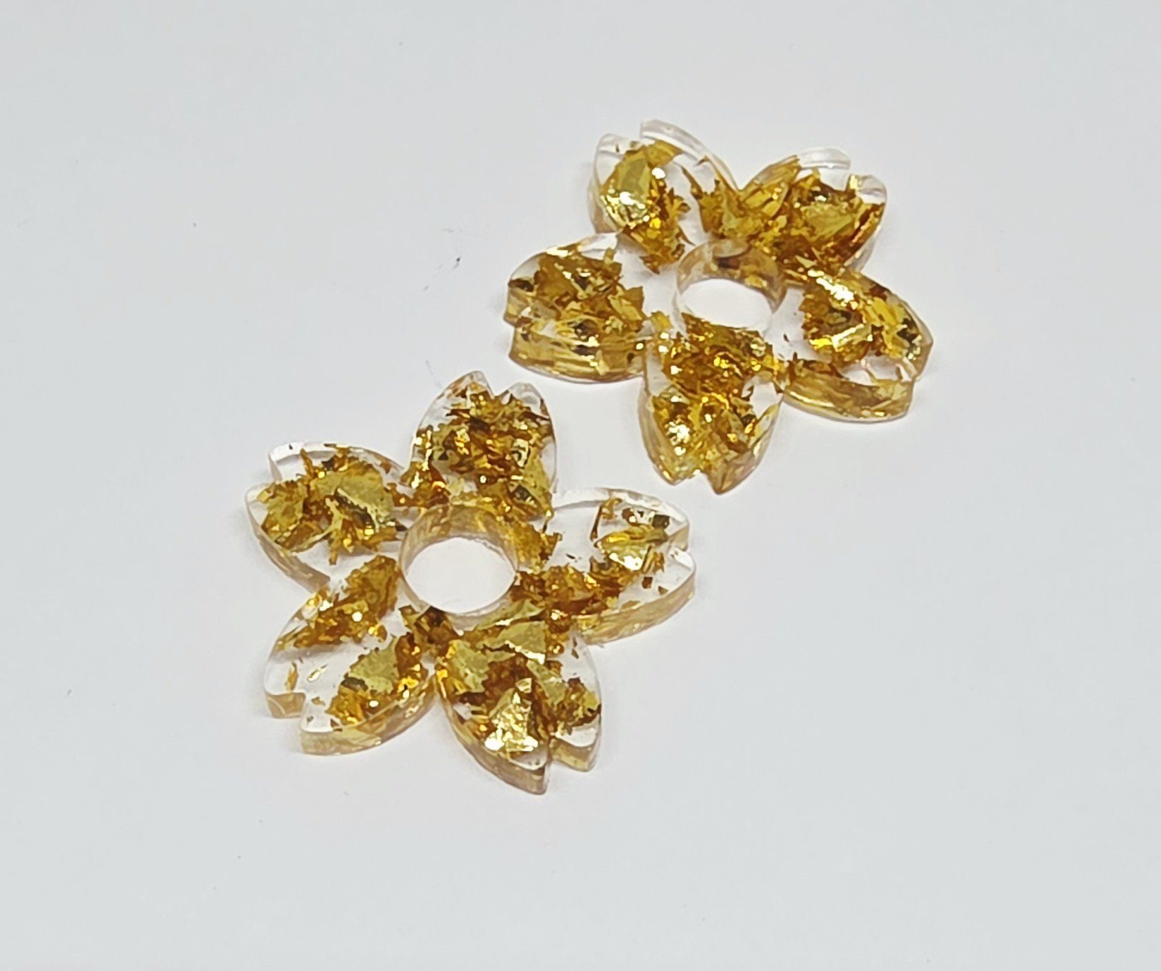 Lot de 2 Pampilles, fleur de tiaré, en résine époxy avec des incrustations de feuilles dorées.