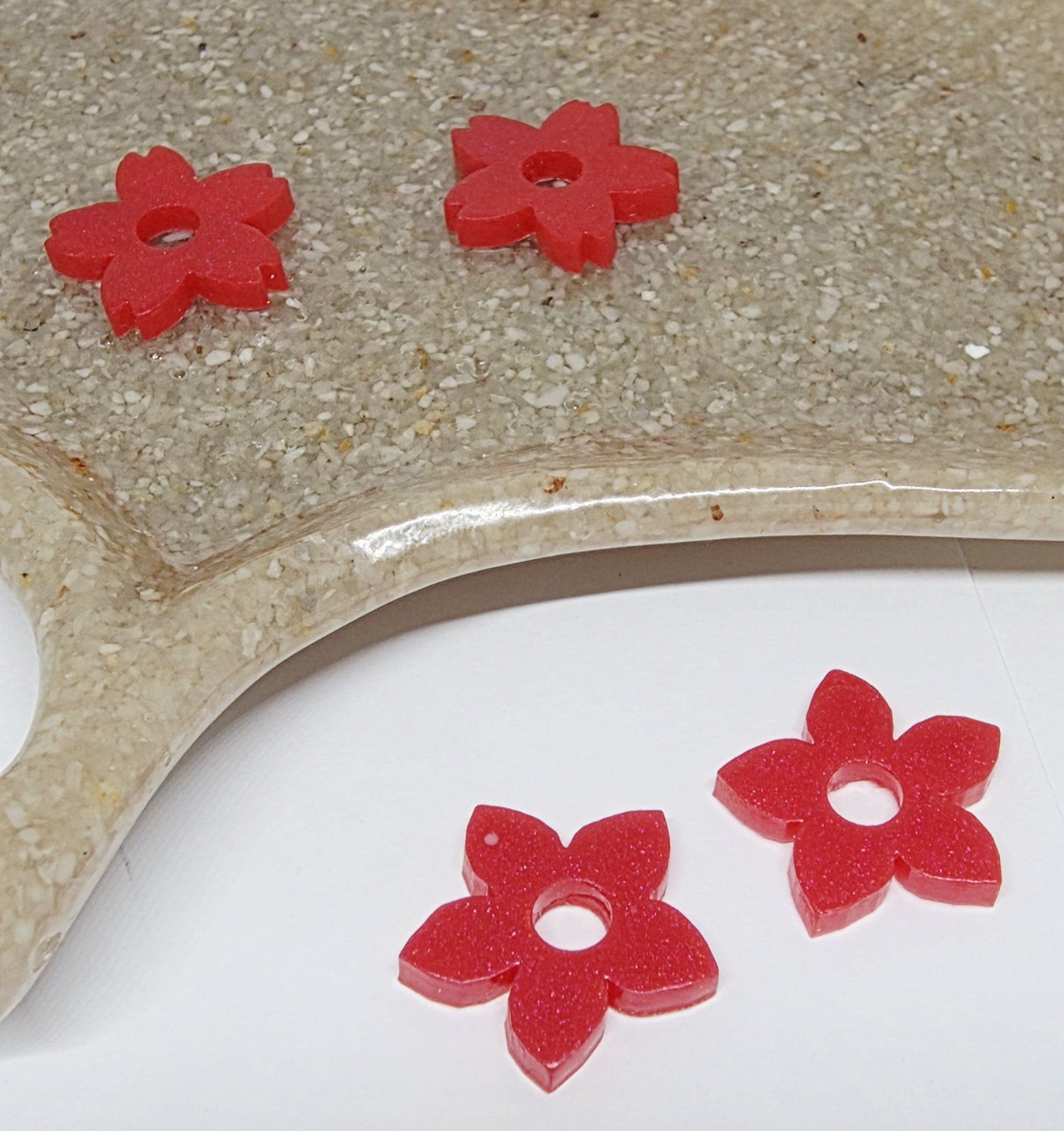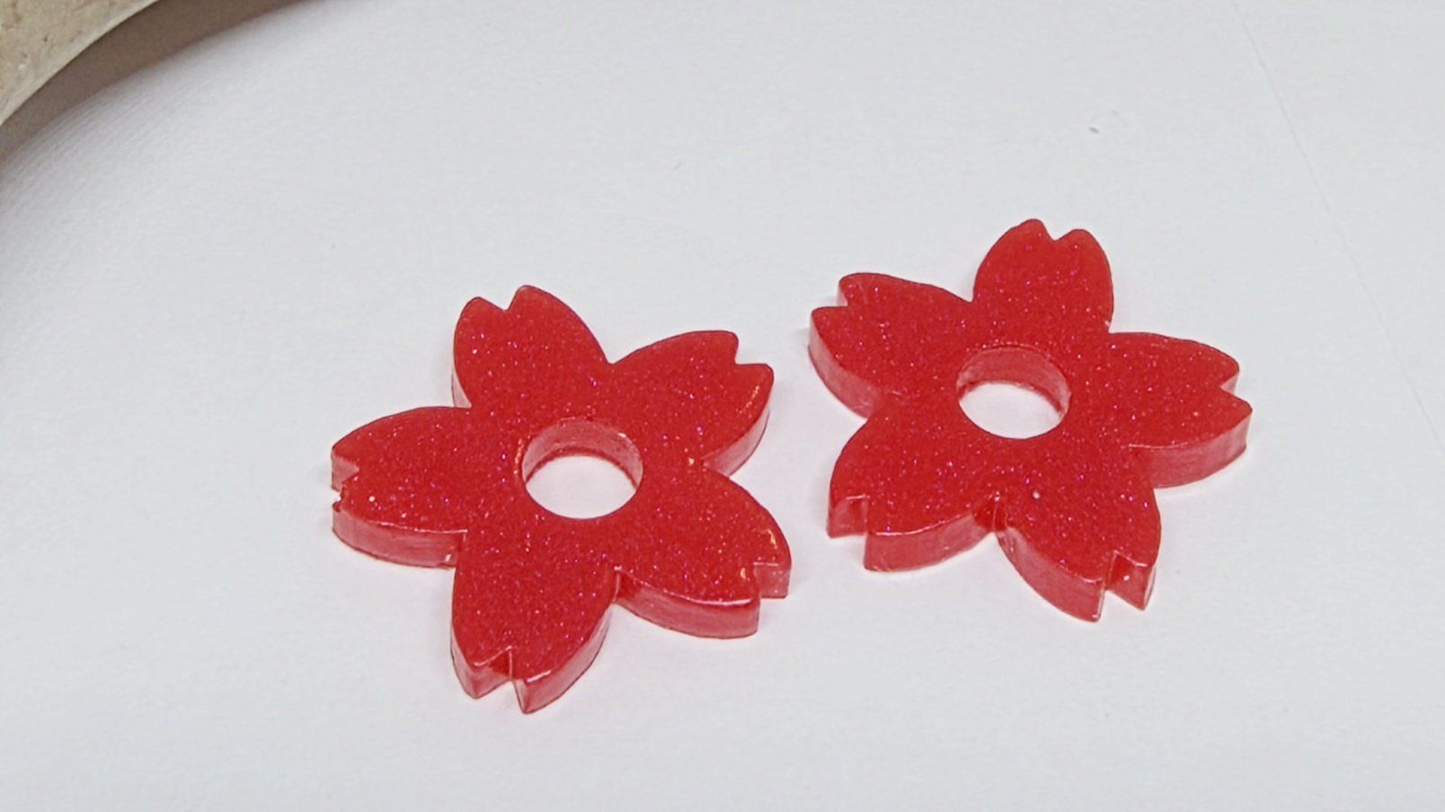 Lot de 2 Pampilles, fleur de tiaré, en résine époxy rouge.