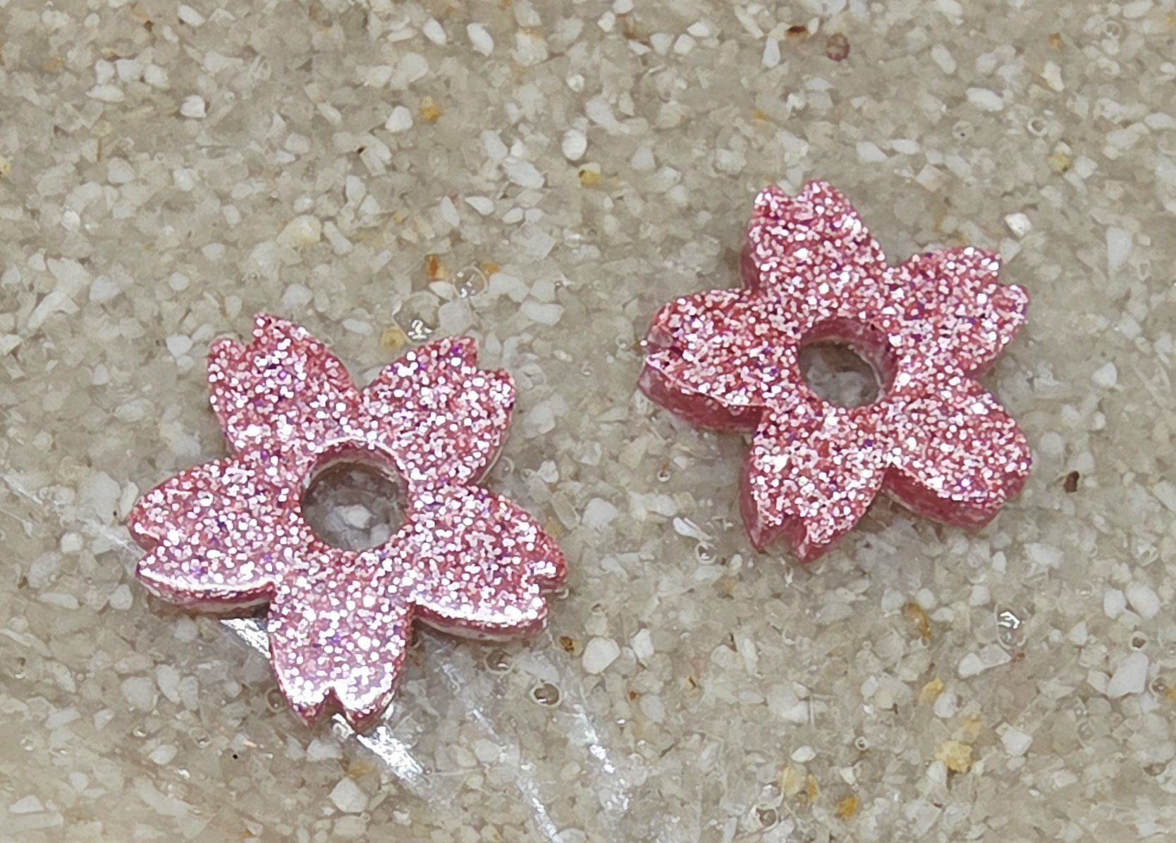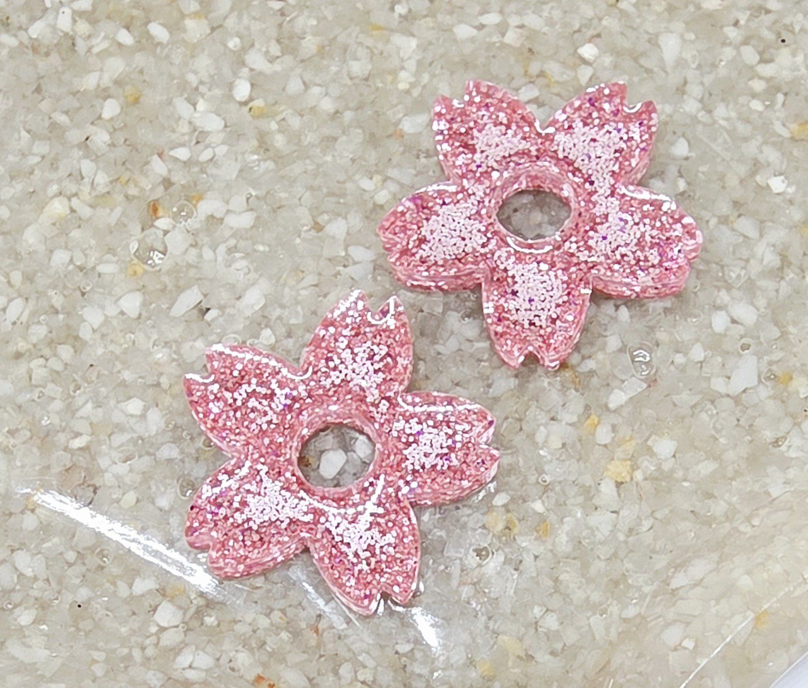 Lot de 2 Pampilles, fleur de tiaré, en résine époxy avec des incrustations de paillettes rose.
