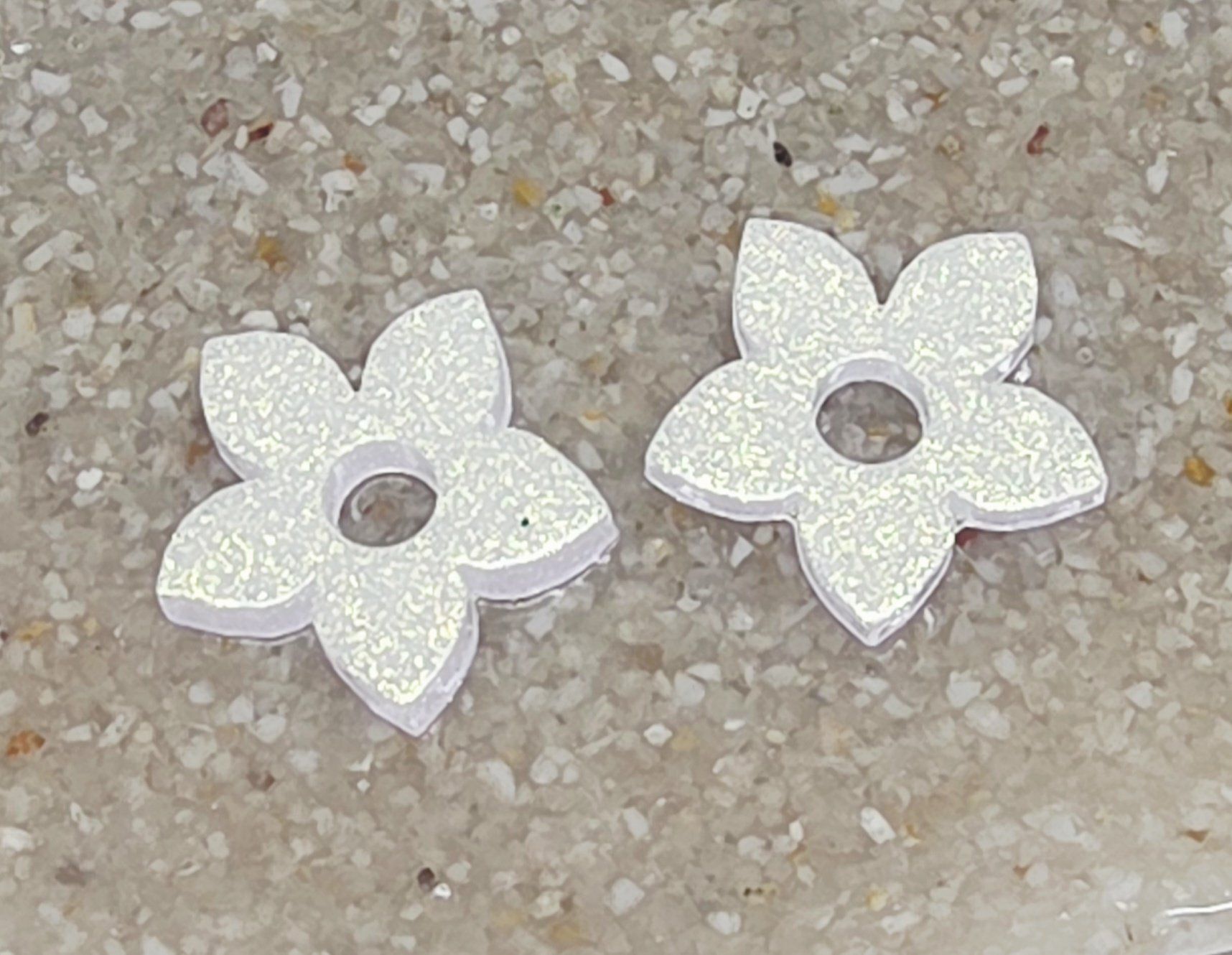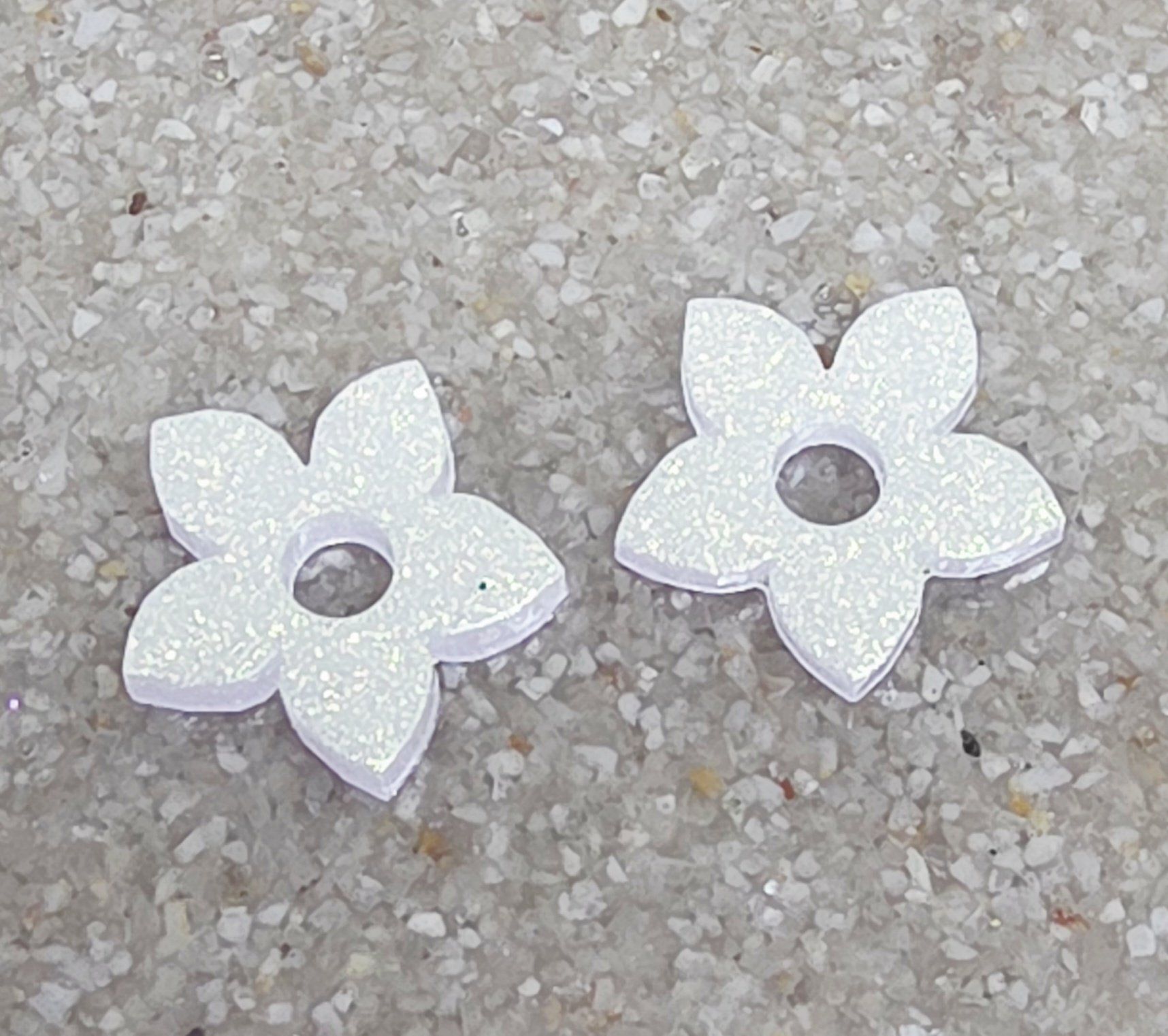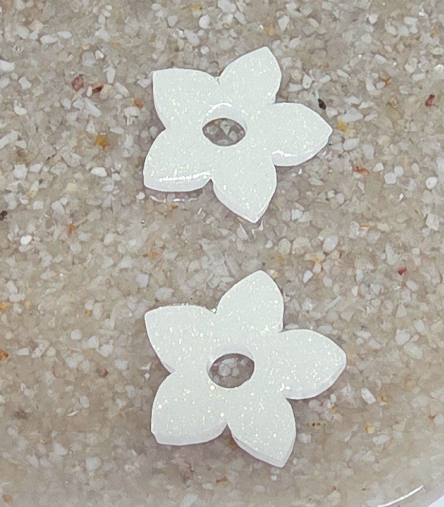 Lot de 2 Pampilles, fleur de tiaré, en résine époxy de couleur blanche irisée pailletée.
