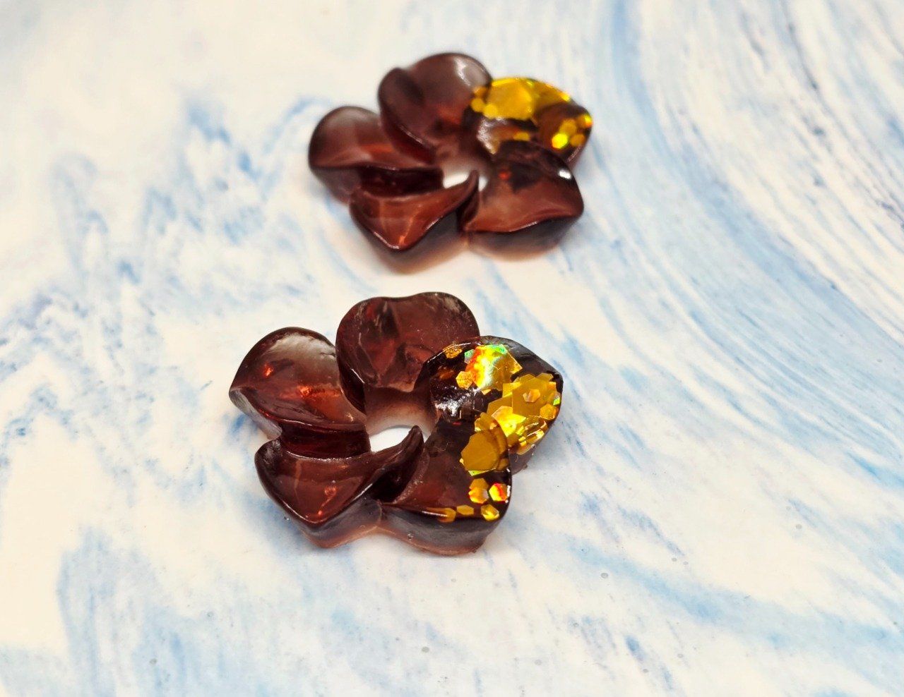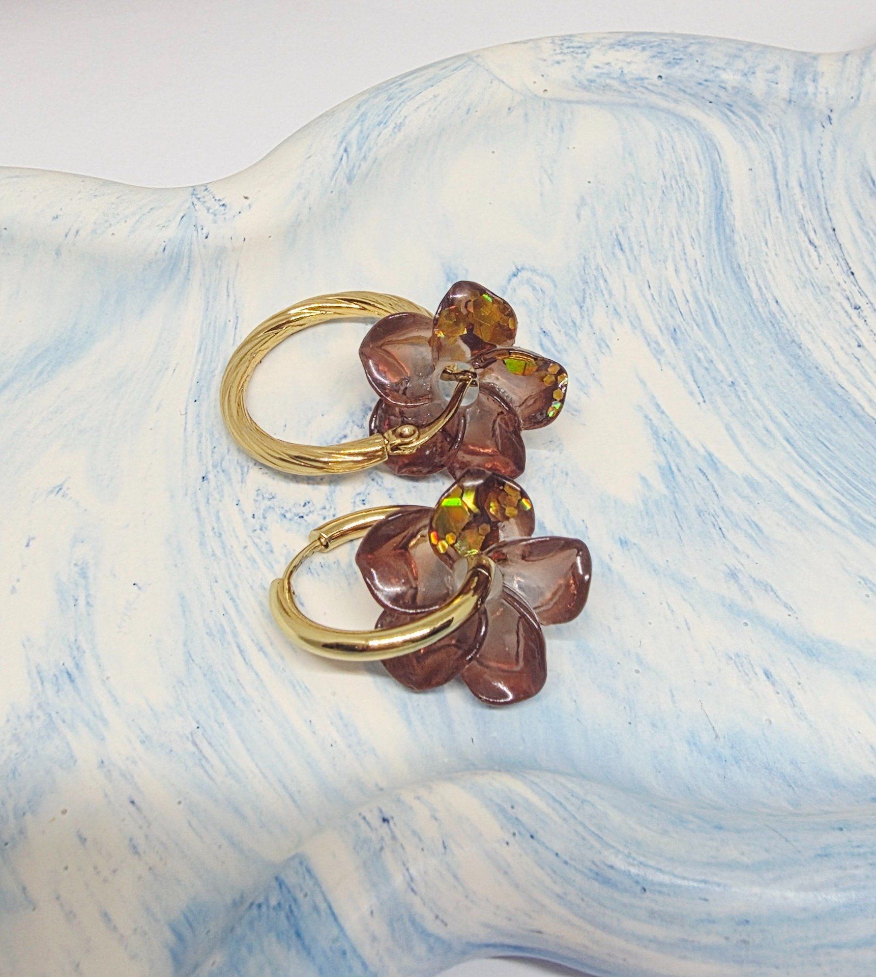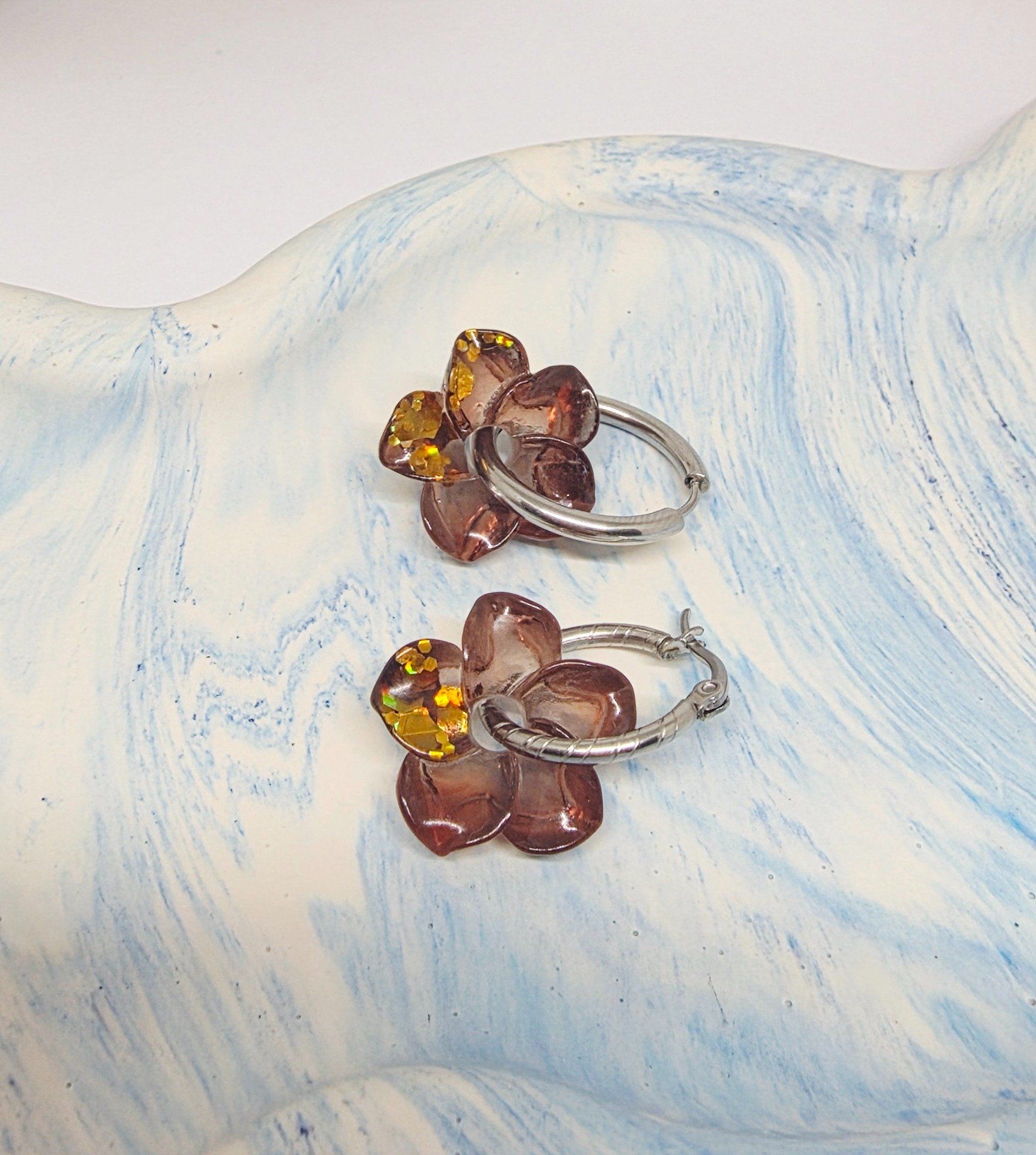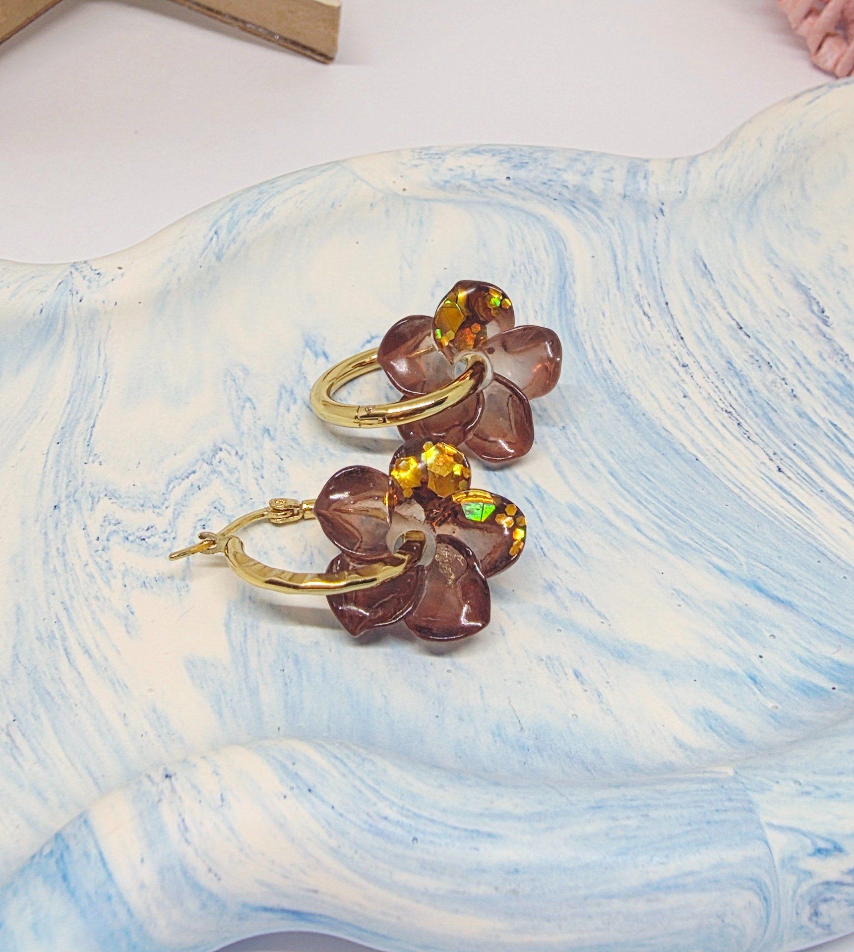 Lot de 2 Pampilles, Elena, en forme de fleur de tiaré, en résine époxy marron translucide avec des incrustationsde paillettes dorées, compatibles avec tous les modèles de créoles.