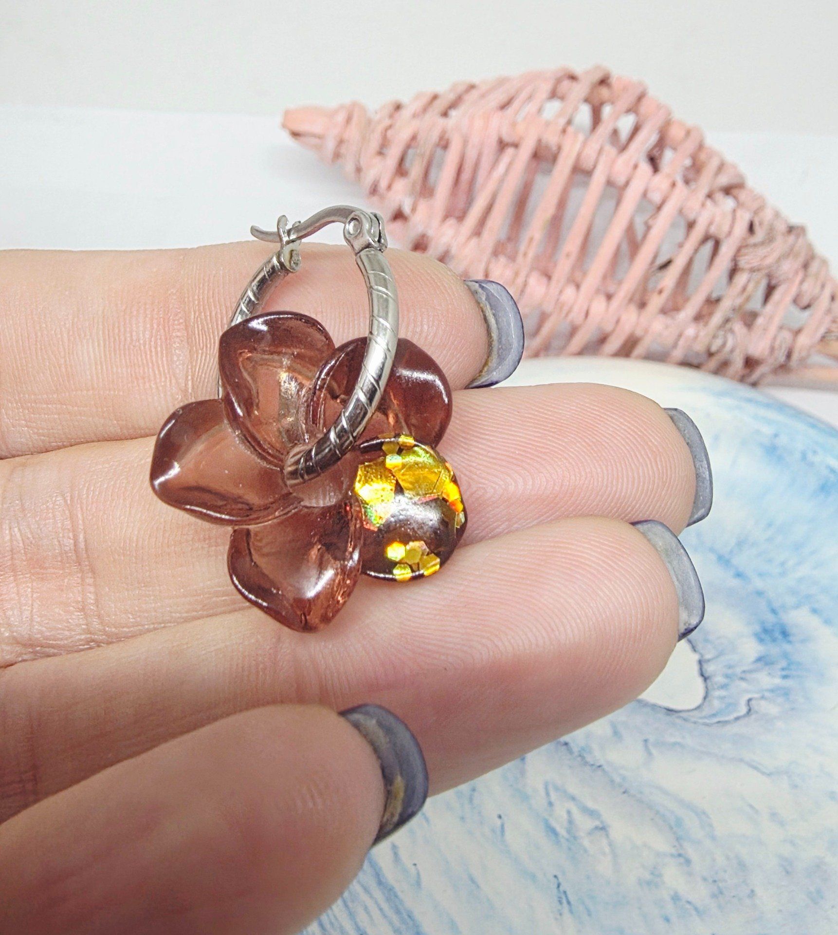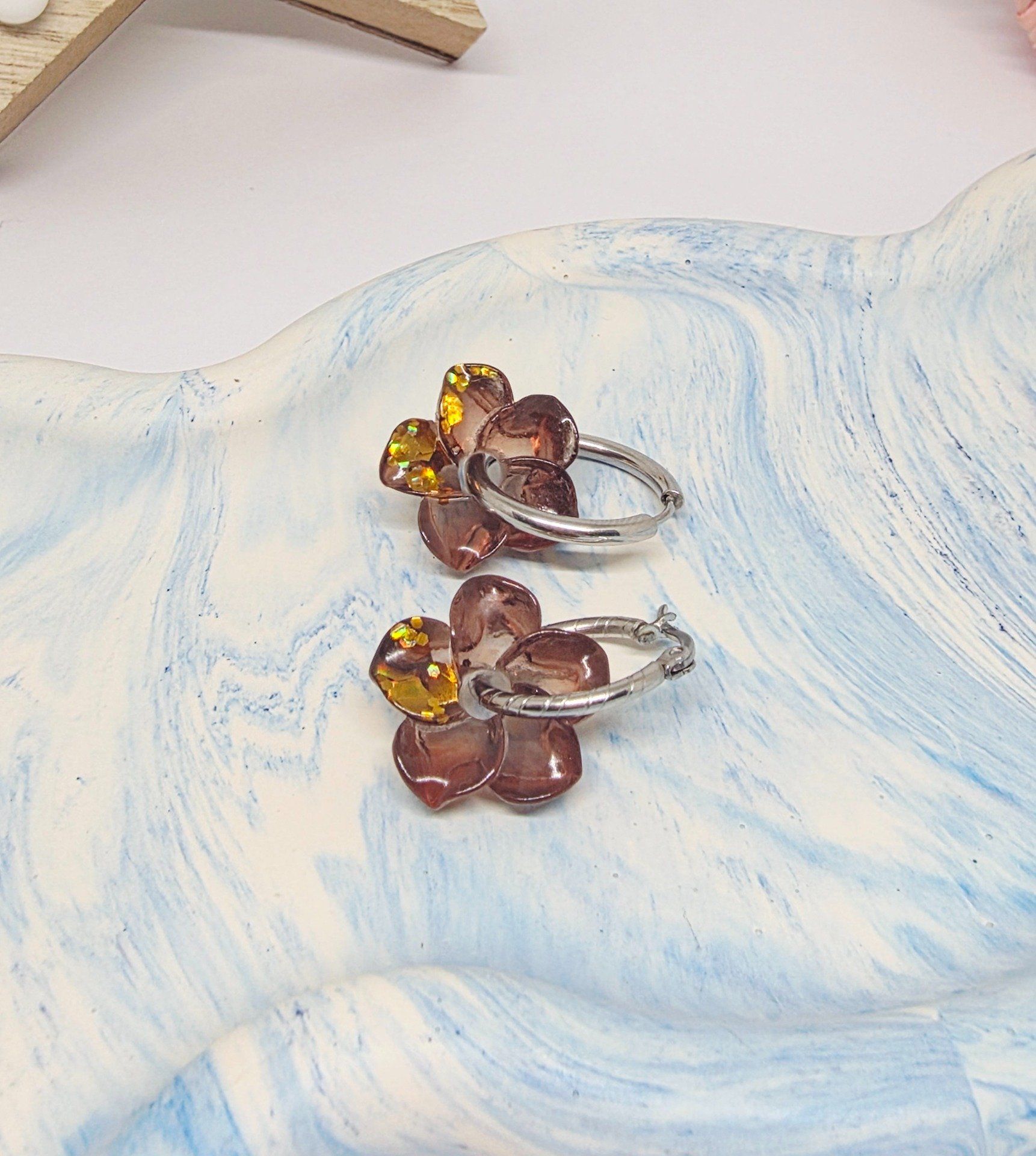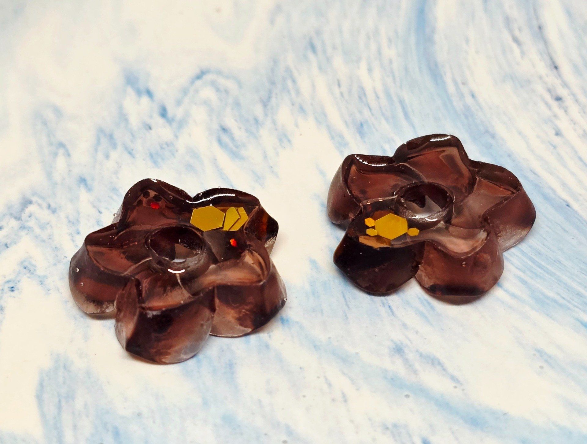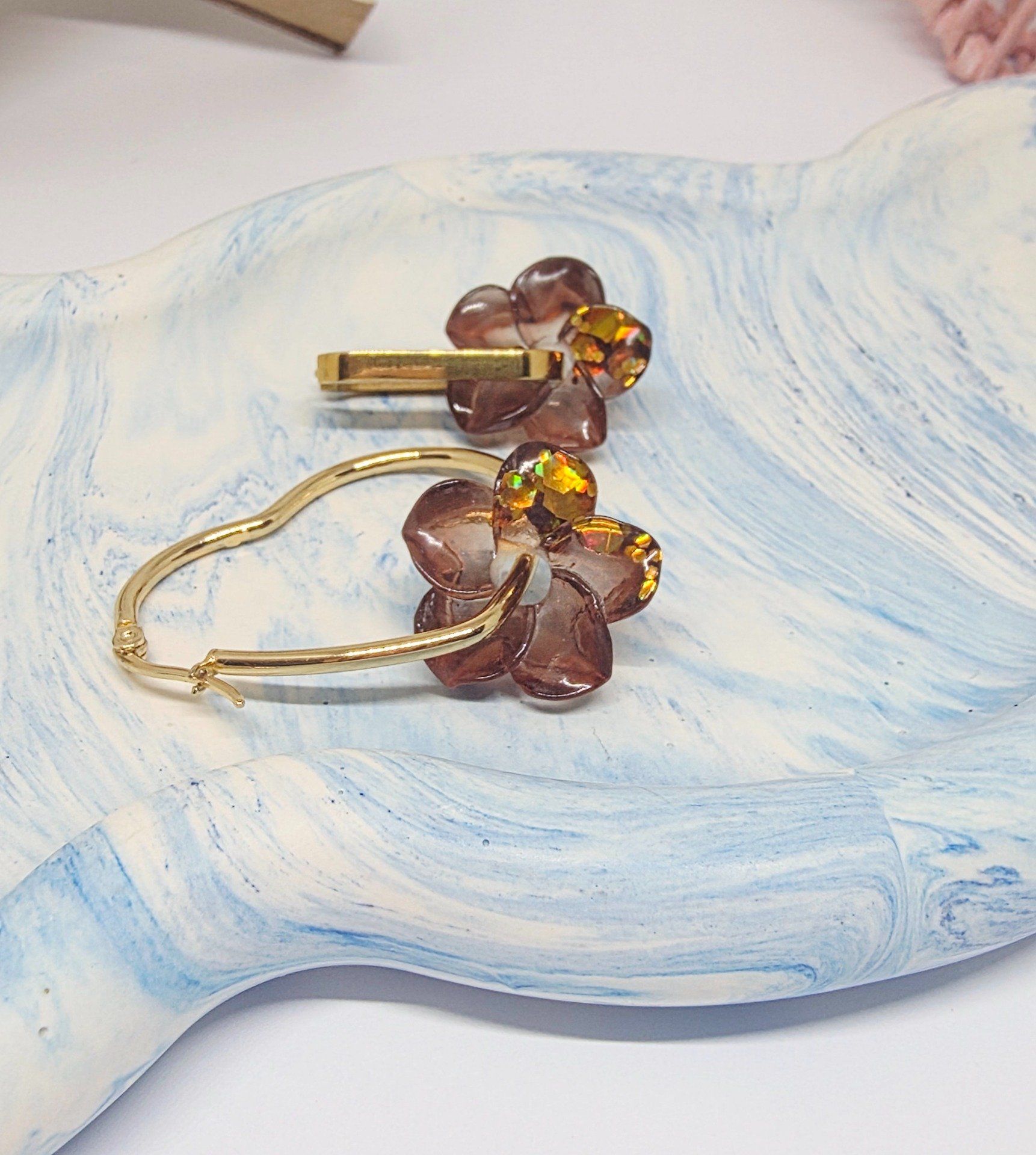 Lot de 2 Pampilles, Elena, en forme de fleur de tiaré, en résine époxy marron translucide avec des incrustationsde paillettes dorées, compatibles avec tous les modèles de créoles.