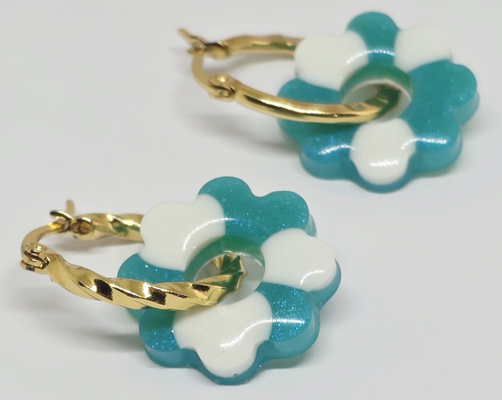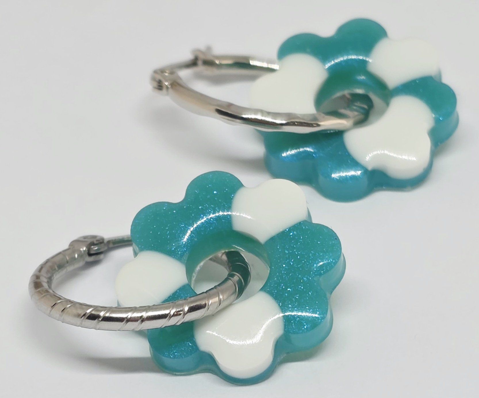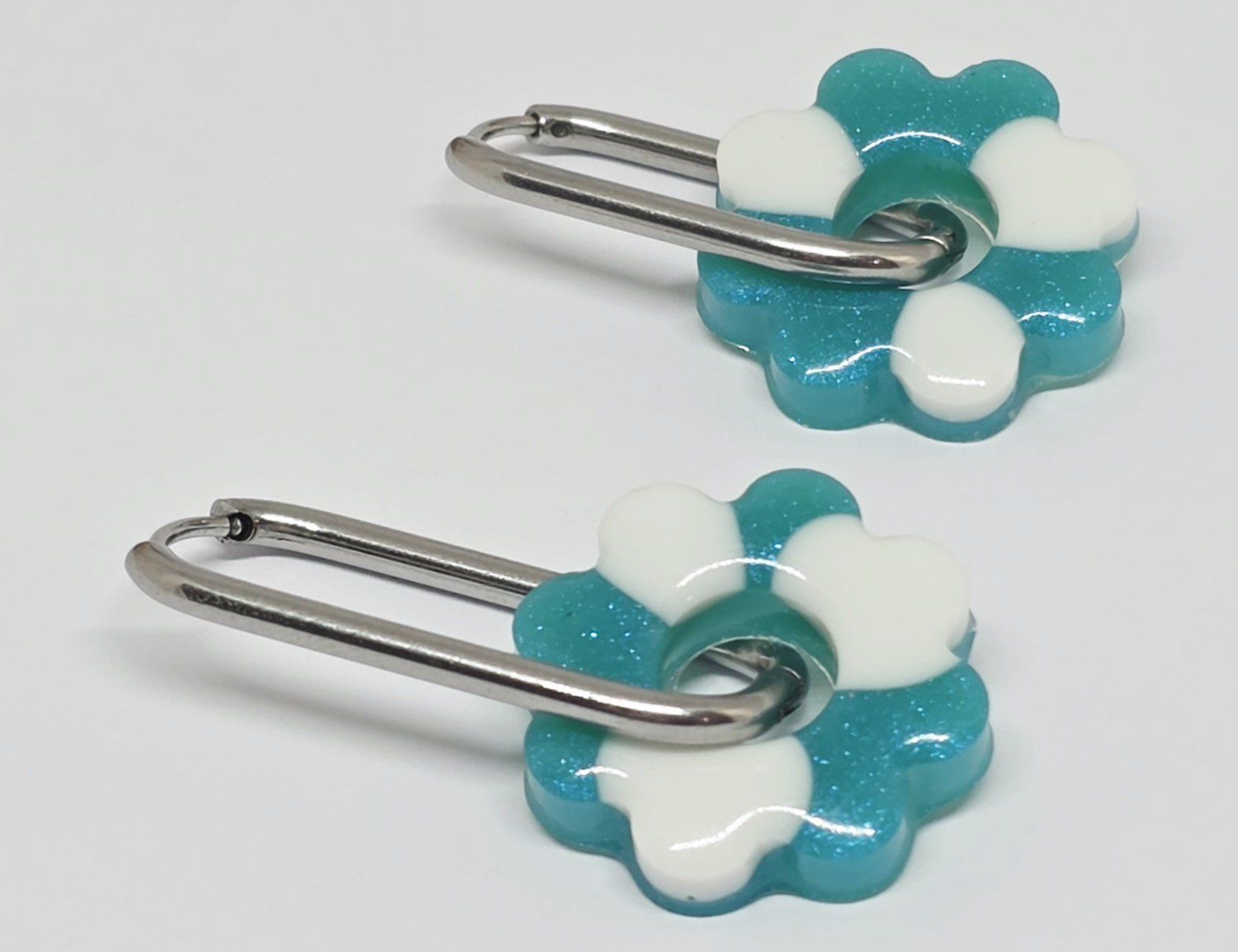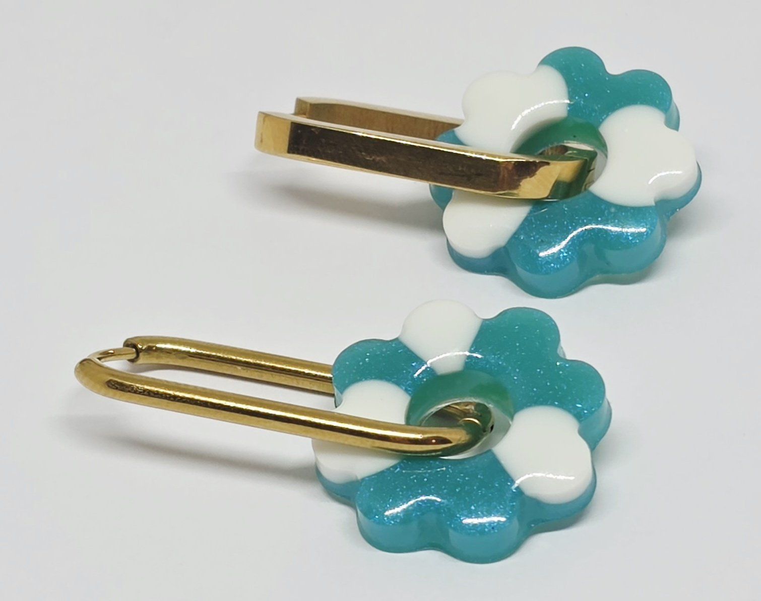 Lot de 2 Pampilles en forme de fleurs en résine époxy bleue/verte et blanche opaque.