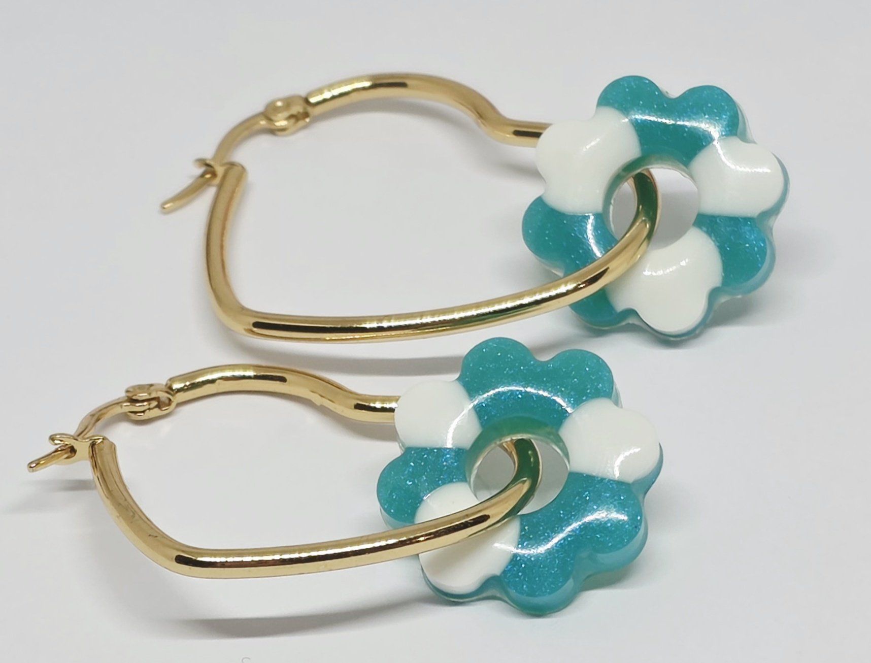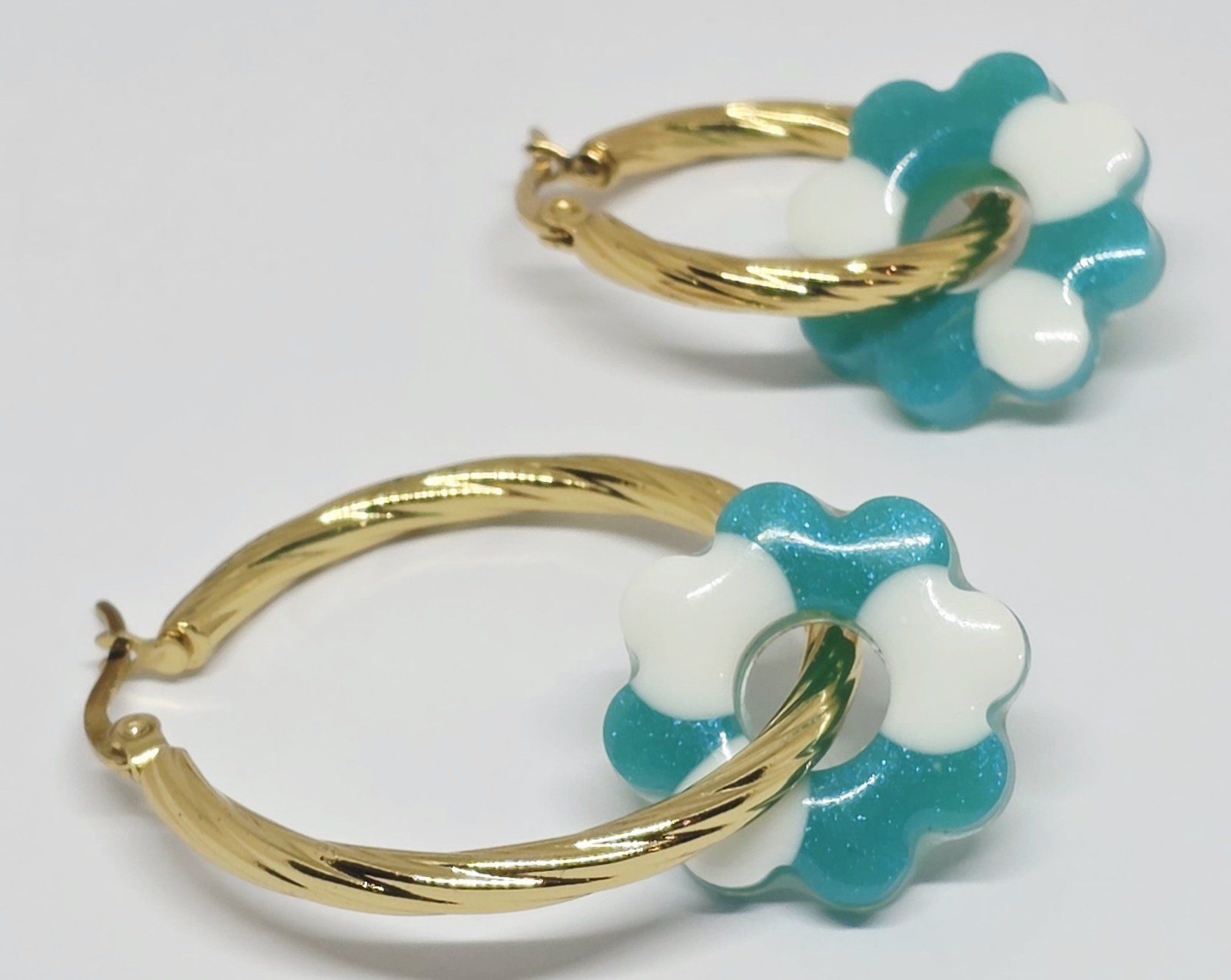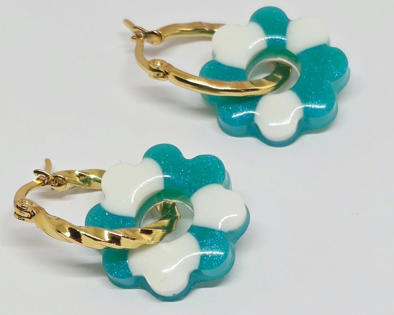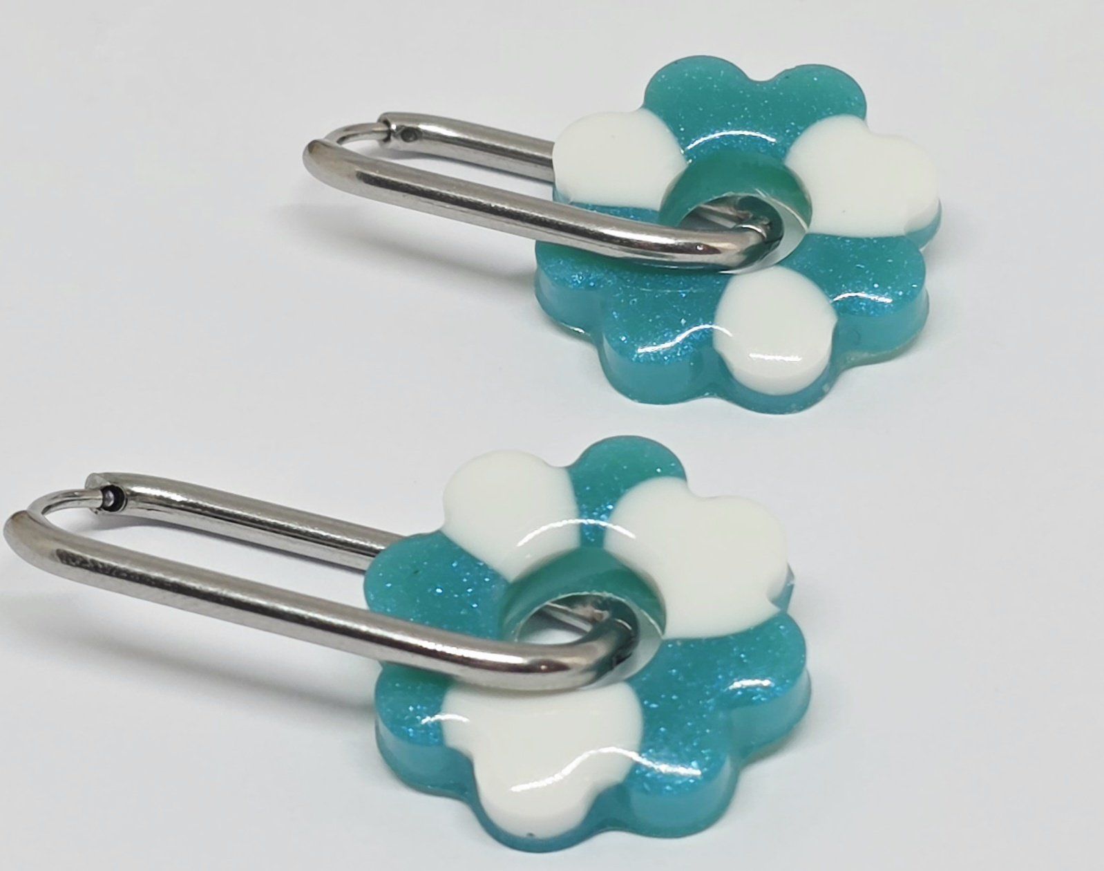 Lot de 2 Pampilles en forme de fleurs en résine époxy bleue/verte et blanche opaque.