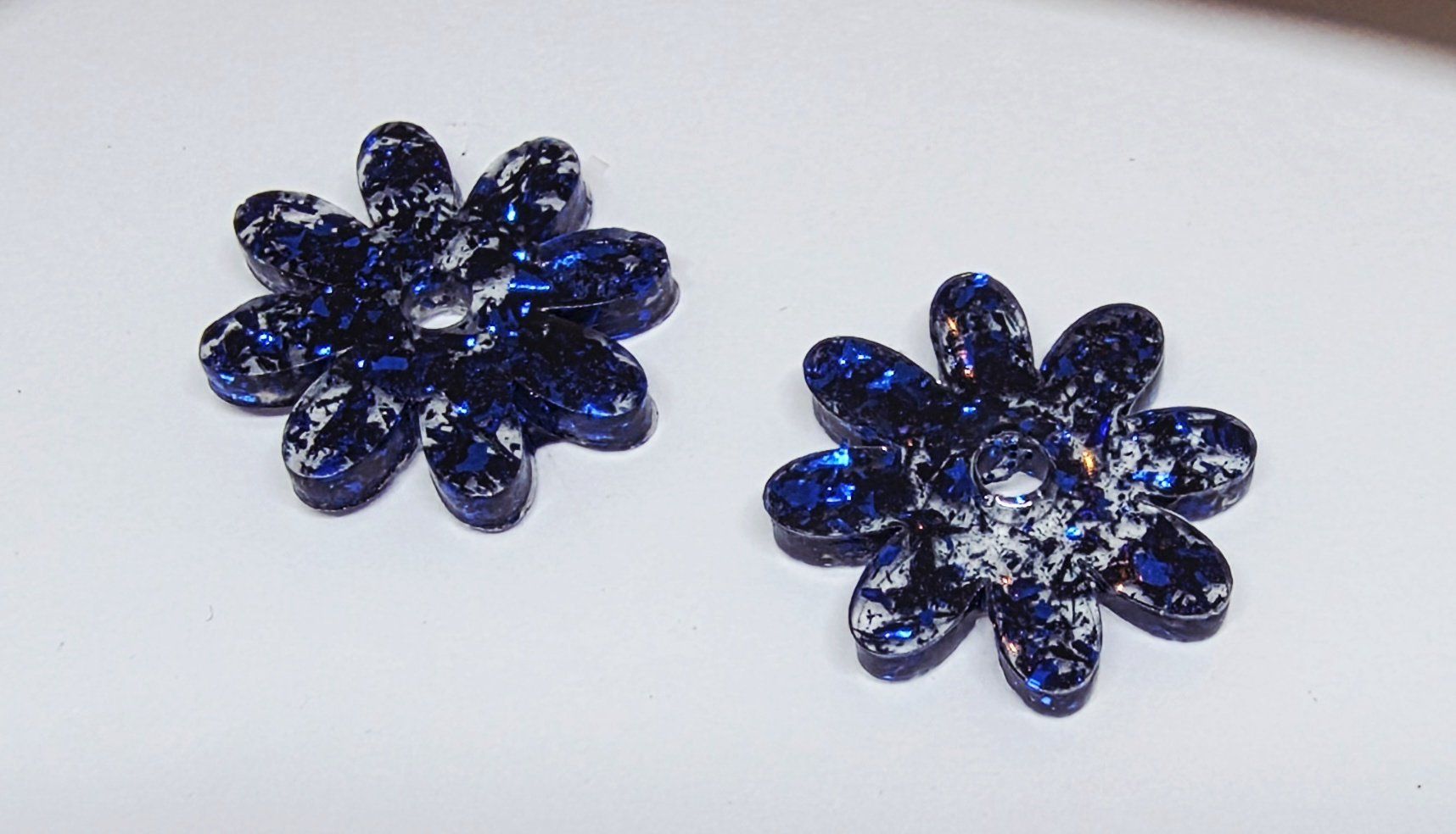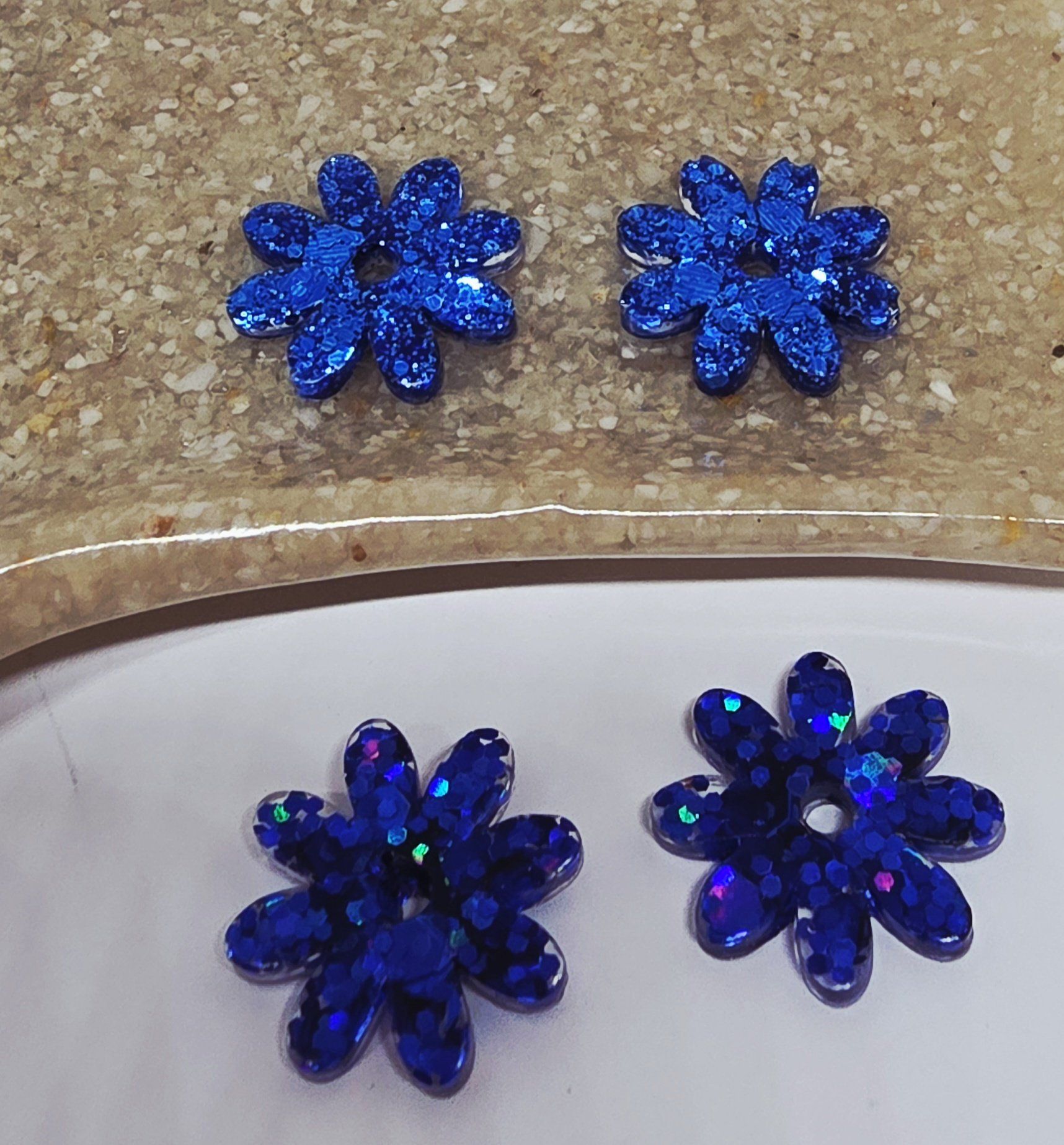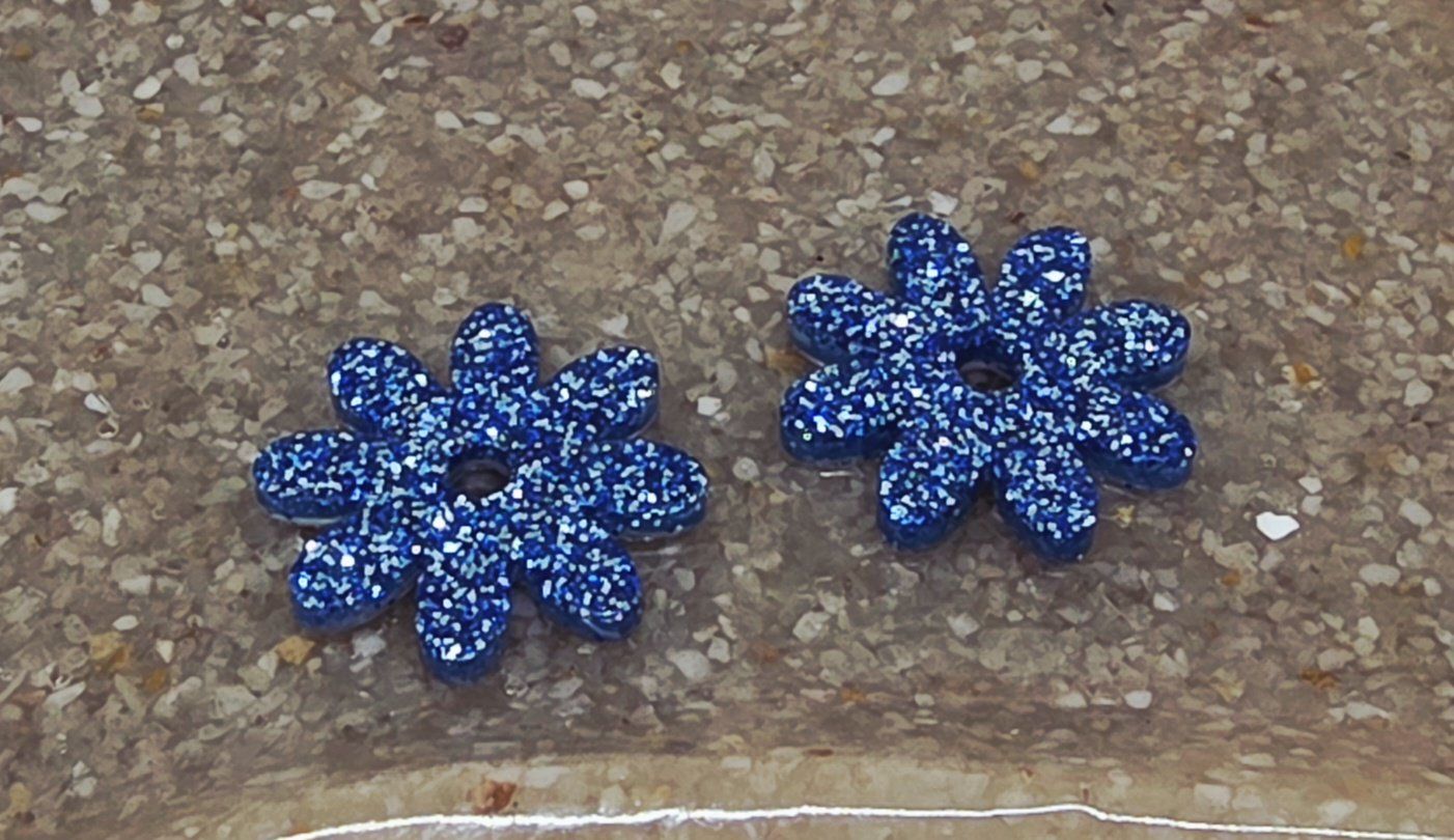 Lot de 2 pampilles en forme de fleur, de marguerite, réalisées en résine époxy, avec des incrustations de paillettes bleues, compatibles avec toutes les créoles vendues sur le site . Pampilles vendues sans les créoles.