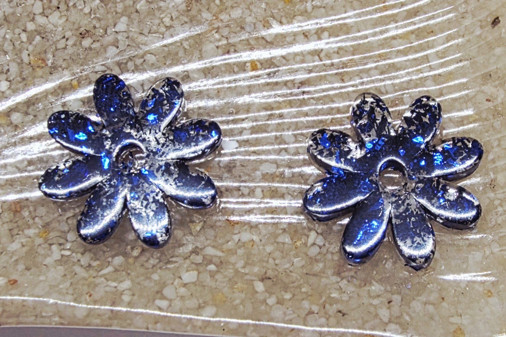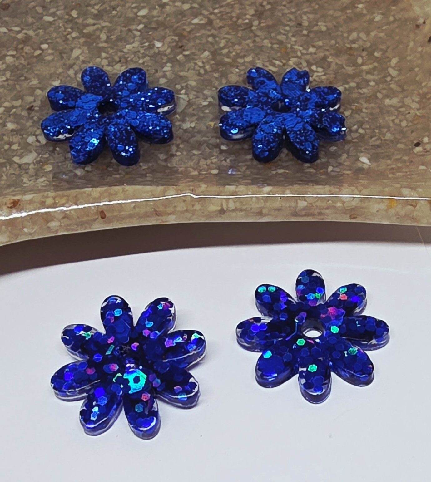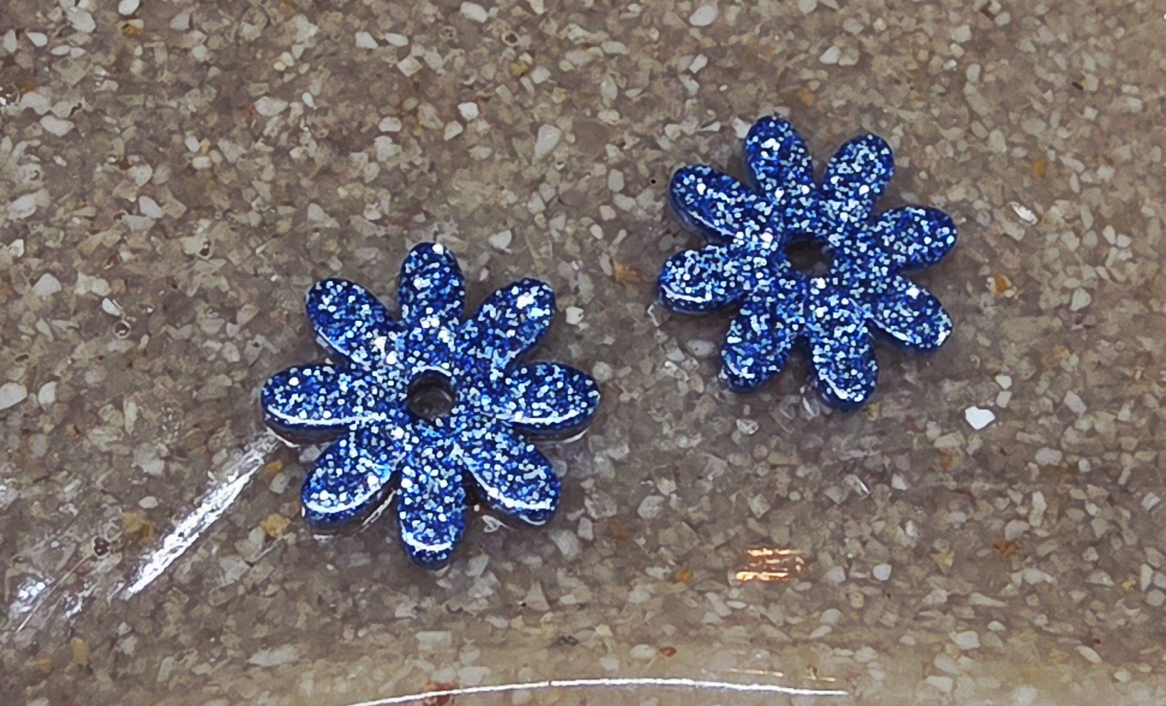 Lot de 2 pampilles en forme de fleur, de marguerite, réalisées en résine époxy, avec des incrustations de paillettes bleues, compatibles avec toutes les créoles vendues sur le site . Pampilles vendues sans les créoles.