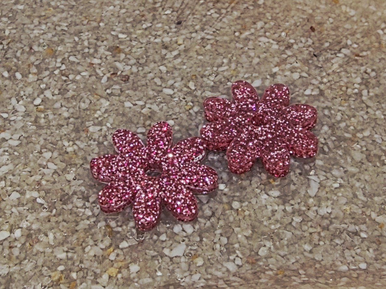 Lot de 2 pampilles en forme de fleur, de marguerite, réalisées en résine époxy, avec des incrustations de paillettes rose, compatibles avec les créoles vendues sur le site . Pampilles vendues sans les créoles.