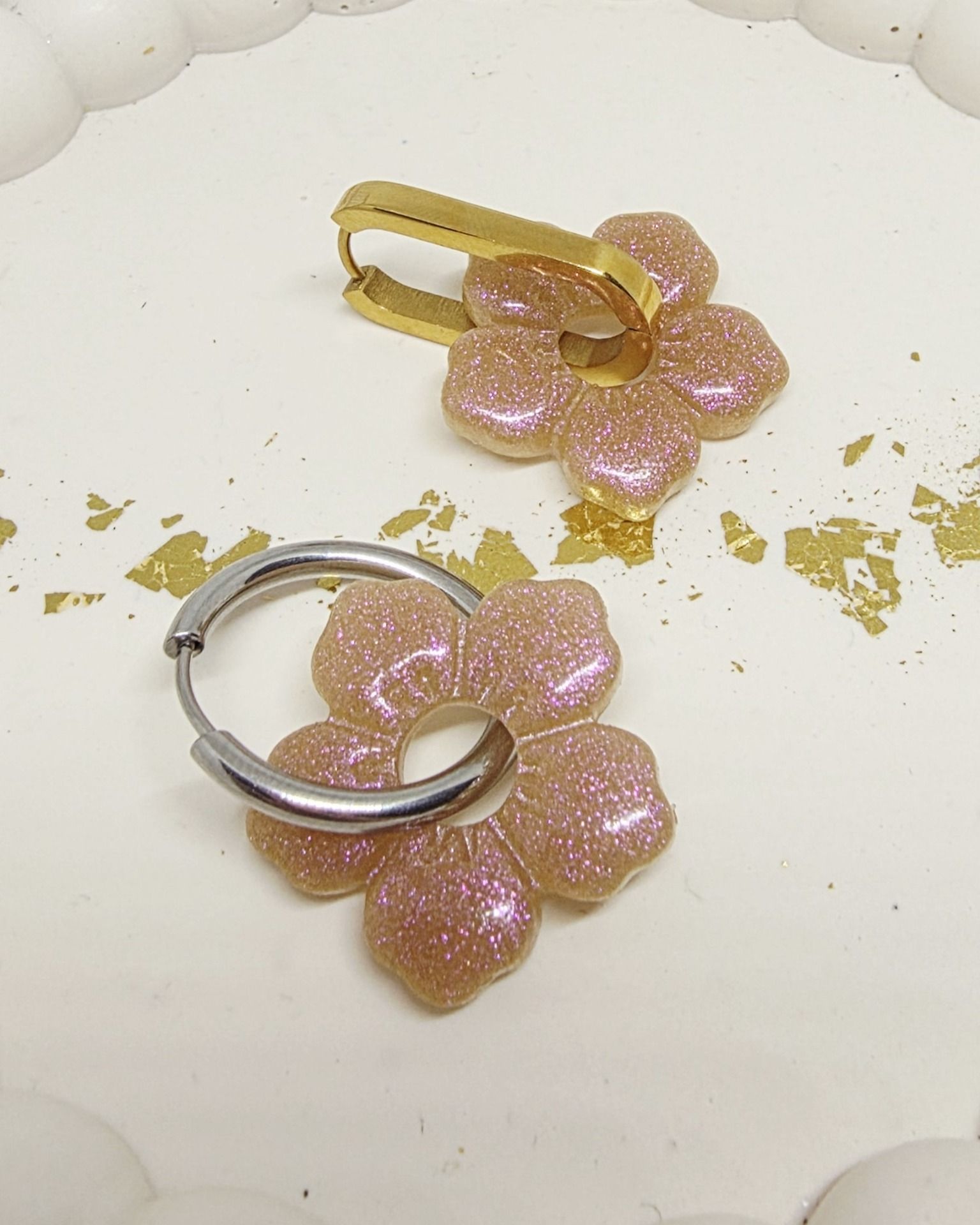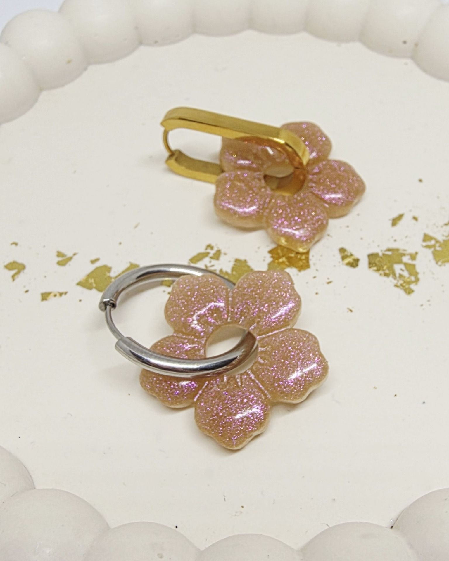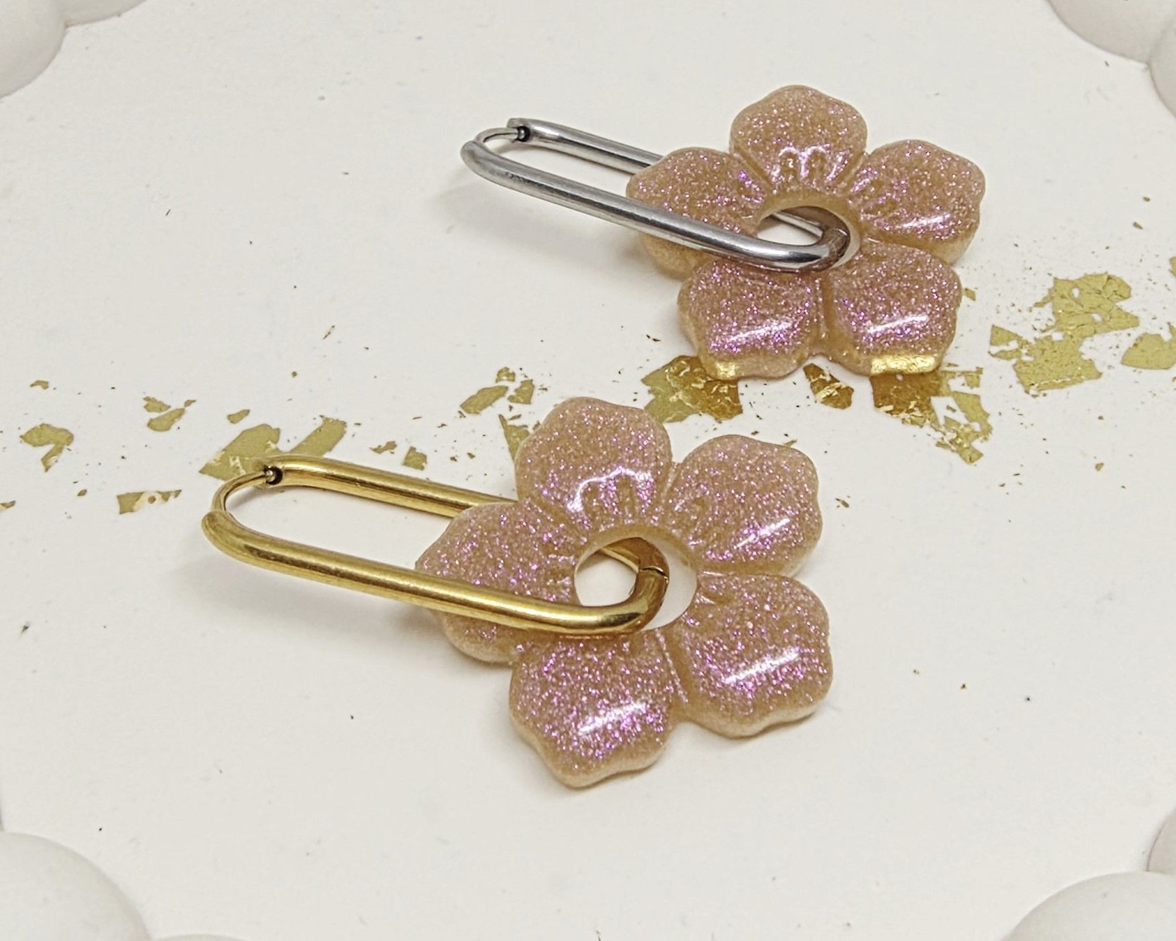 Lot de 2 Pampilles, Clara, en forme de fleur 5 pétales, en résine époxy opaque marron / rosé avec un effet caméléon, compatibles avec les créoles dont la taille est supérieure à 20mm.