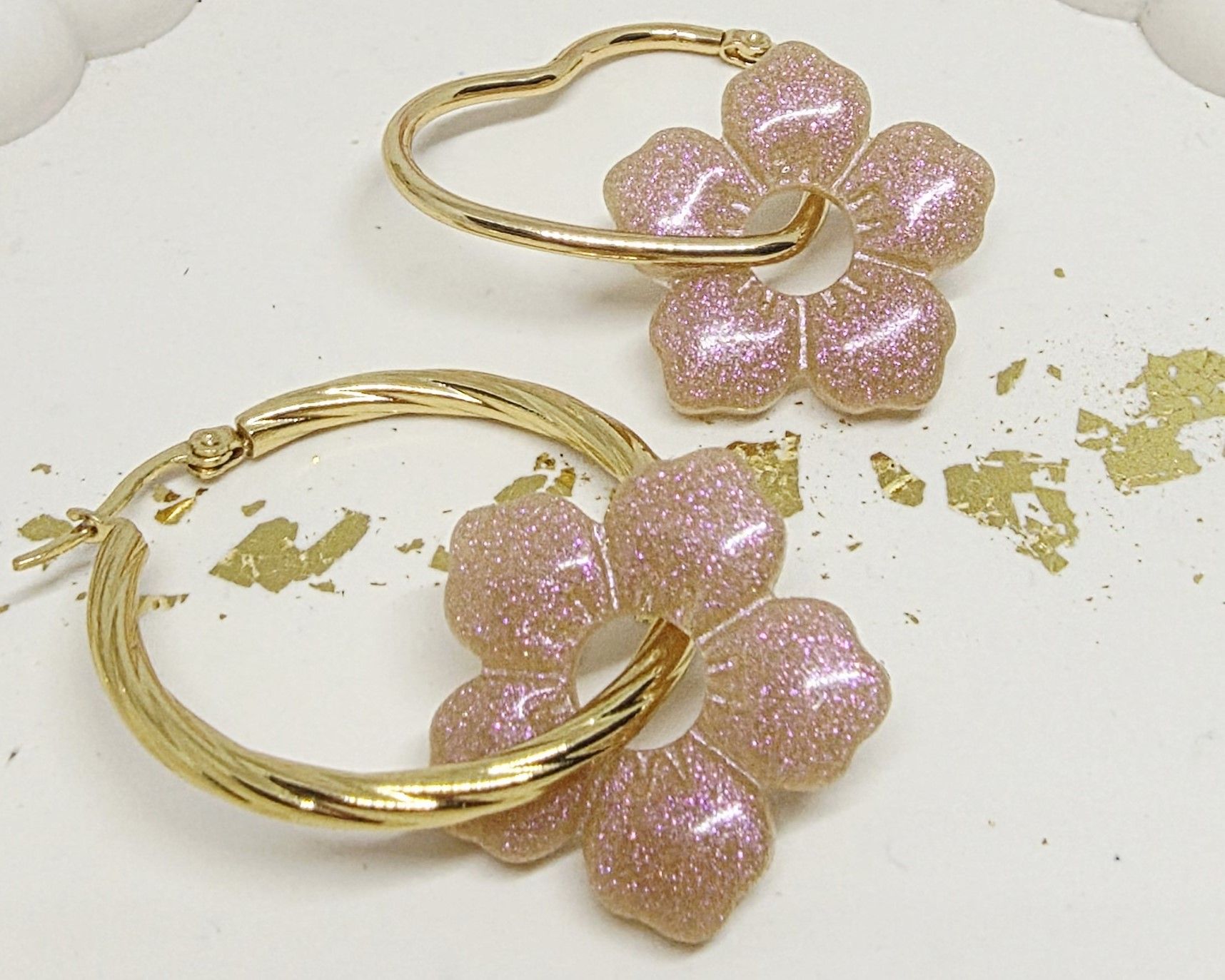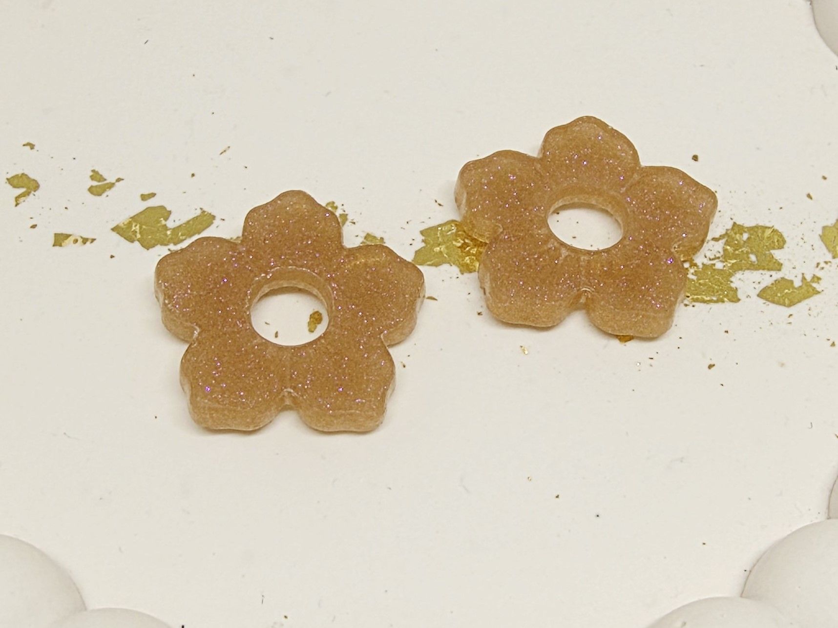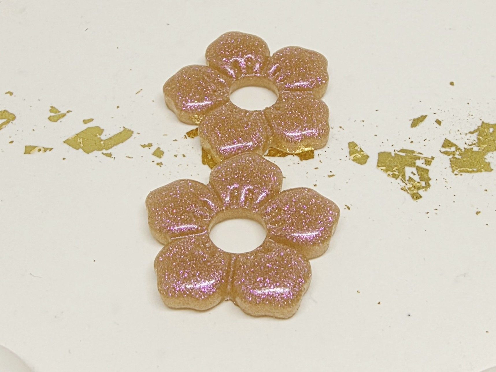 Lot de 2 Pampilles, Clara, en forme de fleur 5 pétales, en résine époxy opaque marron / rosé avec un effet caméléon, compatibles avec les créoles dont la taille est supérieure à 20mm.