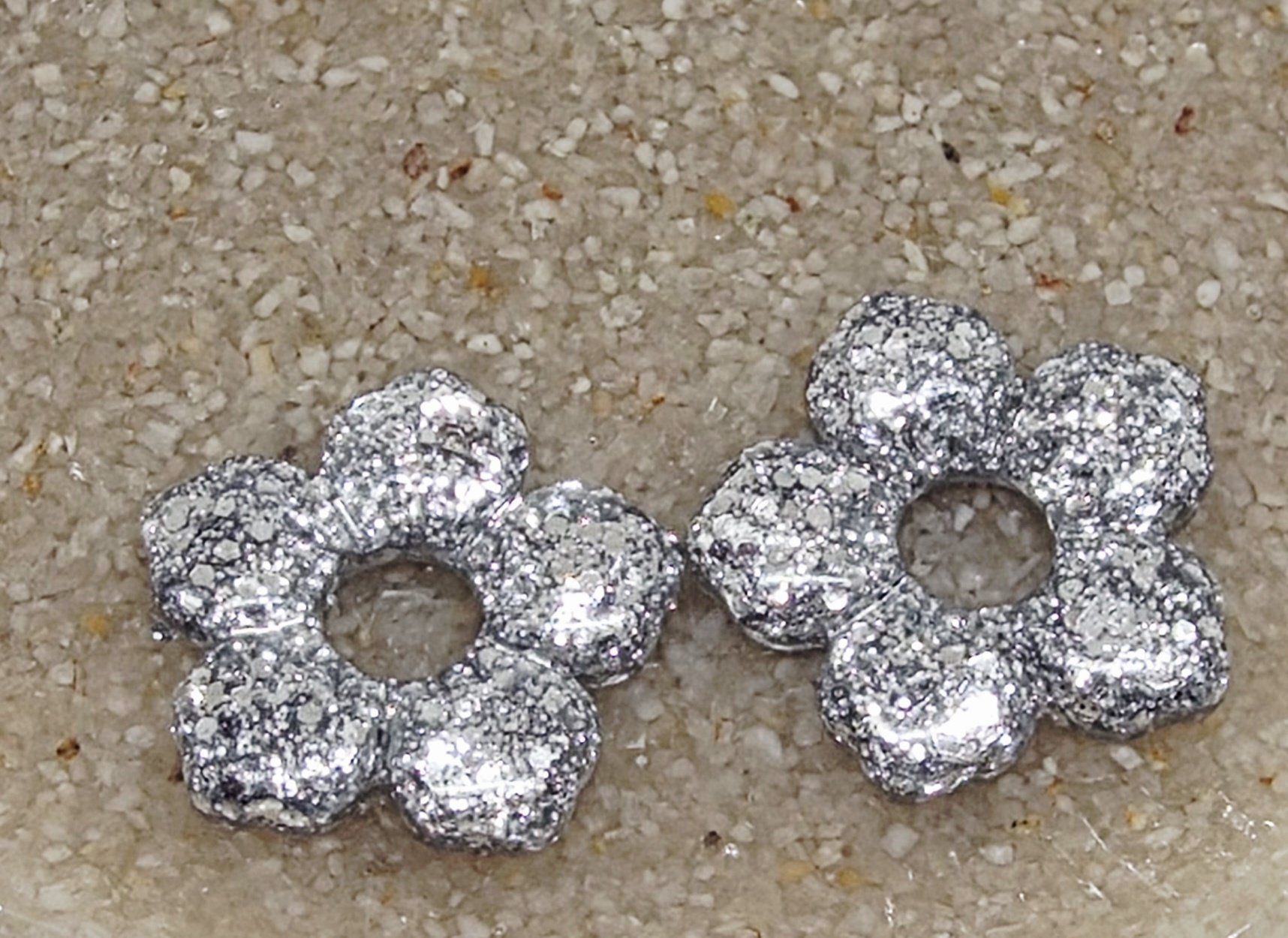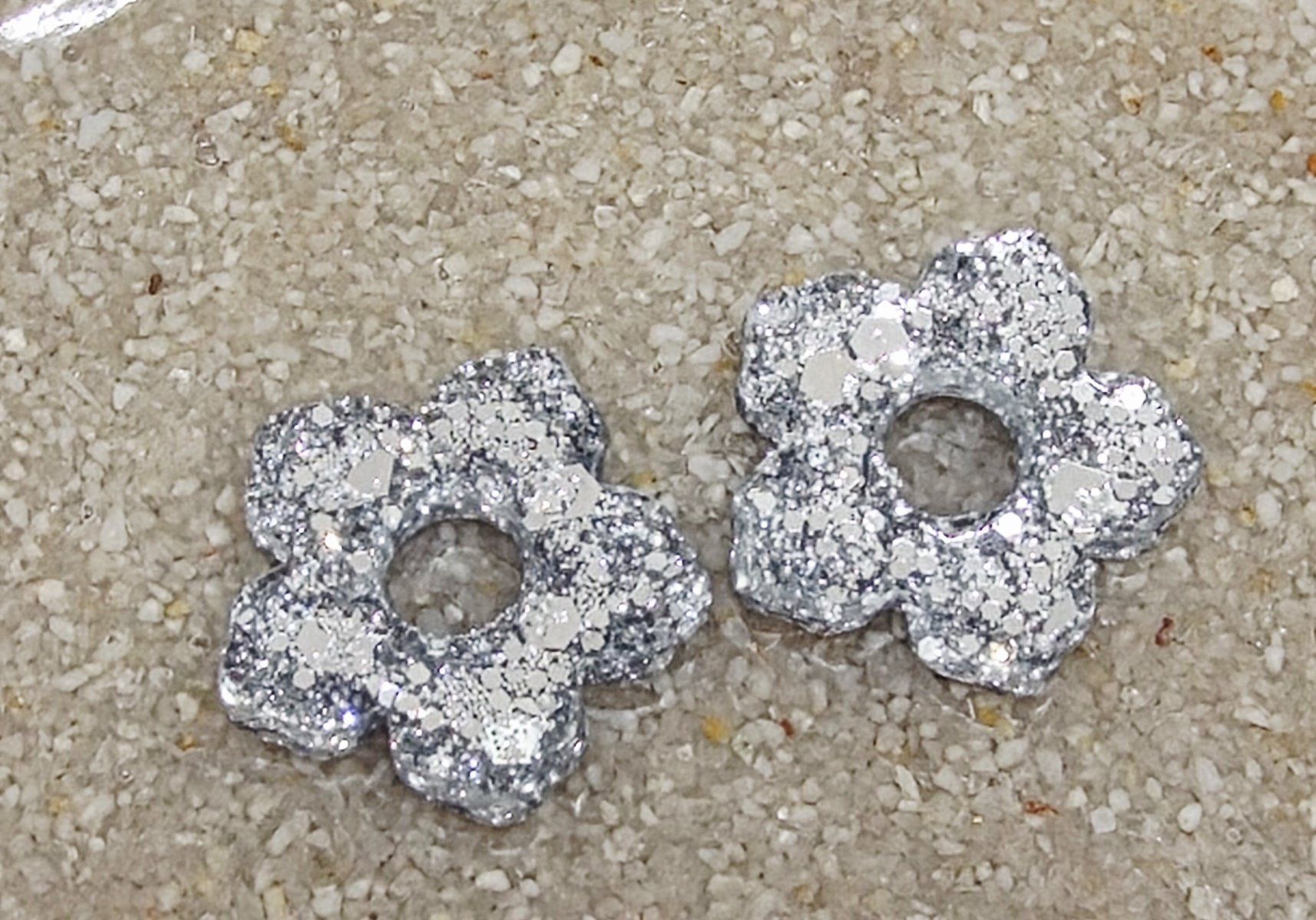 Lot de 2 Pampilles, Clara, en forme de fleur 5 pétales, en résine époxy opaque pailletée grise, compatibles avec les créoles dont la taille est supérieure à 20mm.