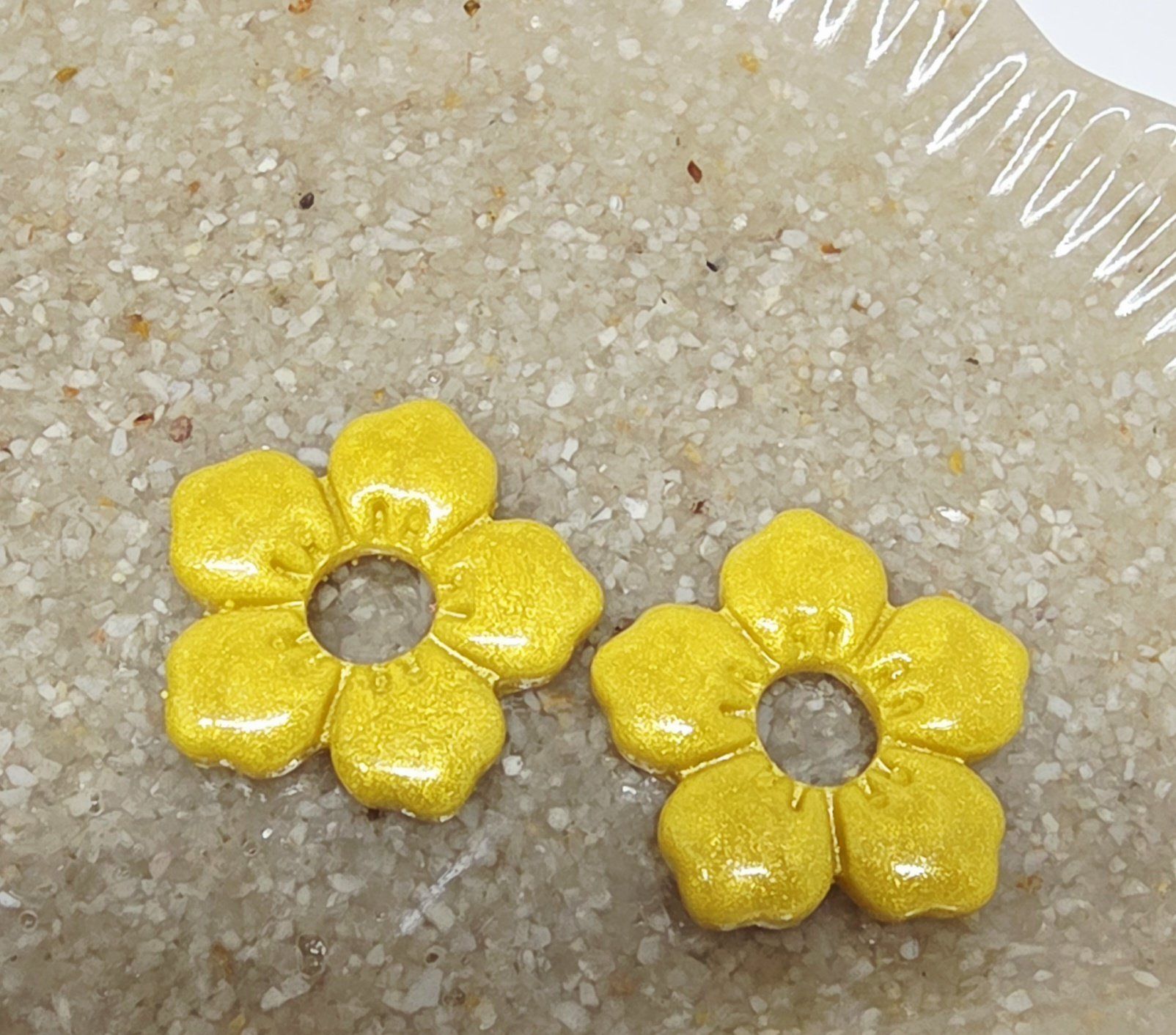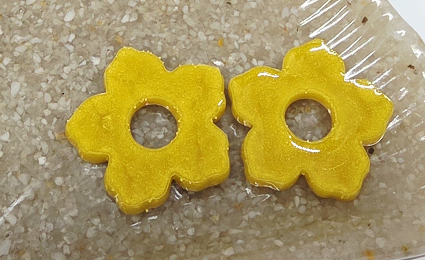 Lot de 2 Pampilles, Clara, en forme de fleur 5 pétales, en résine époxy opaque jaune moutarde, compatibles avec les créoles dont la taille est supérieure à 20mm.