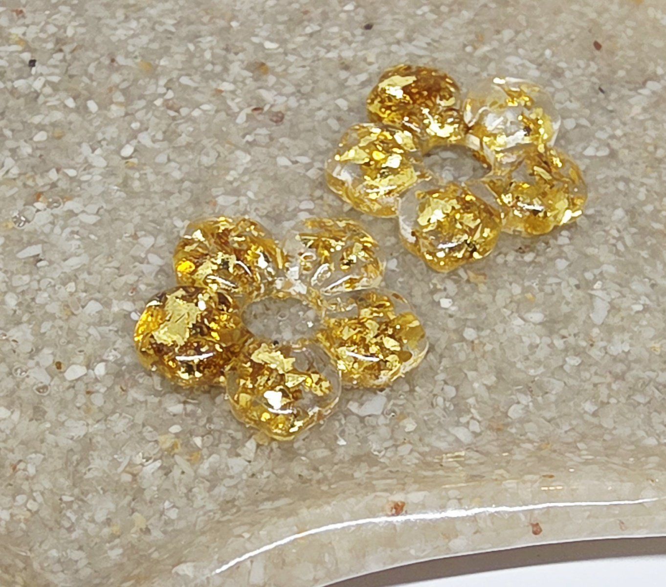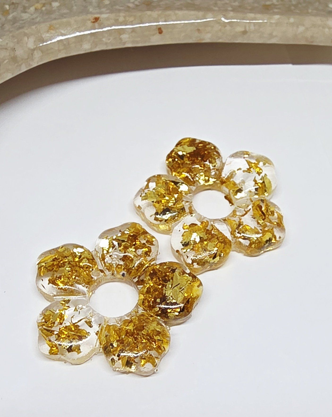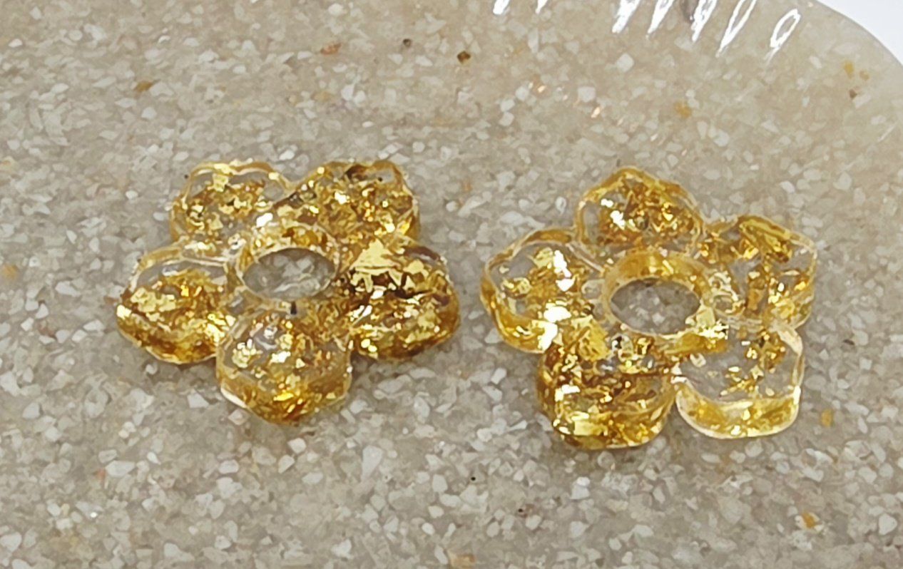 Lot de 2 Pampilles, Clara, en forme de fleur 5 pétales, en résine époxy translucide avec des feuilles dorées, compatibles avec les créoles dont la taille est supérieure à 20mm.
