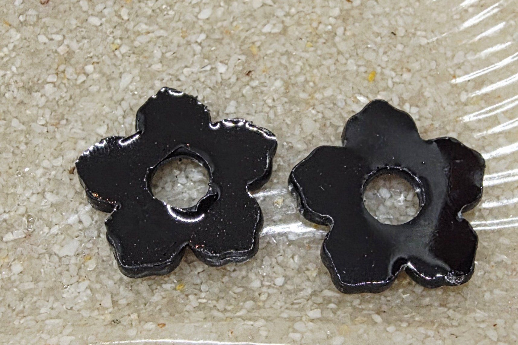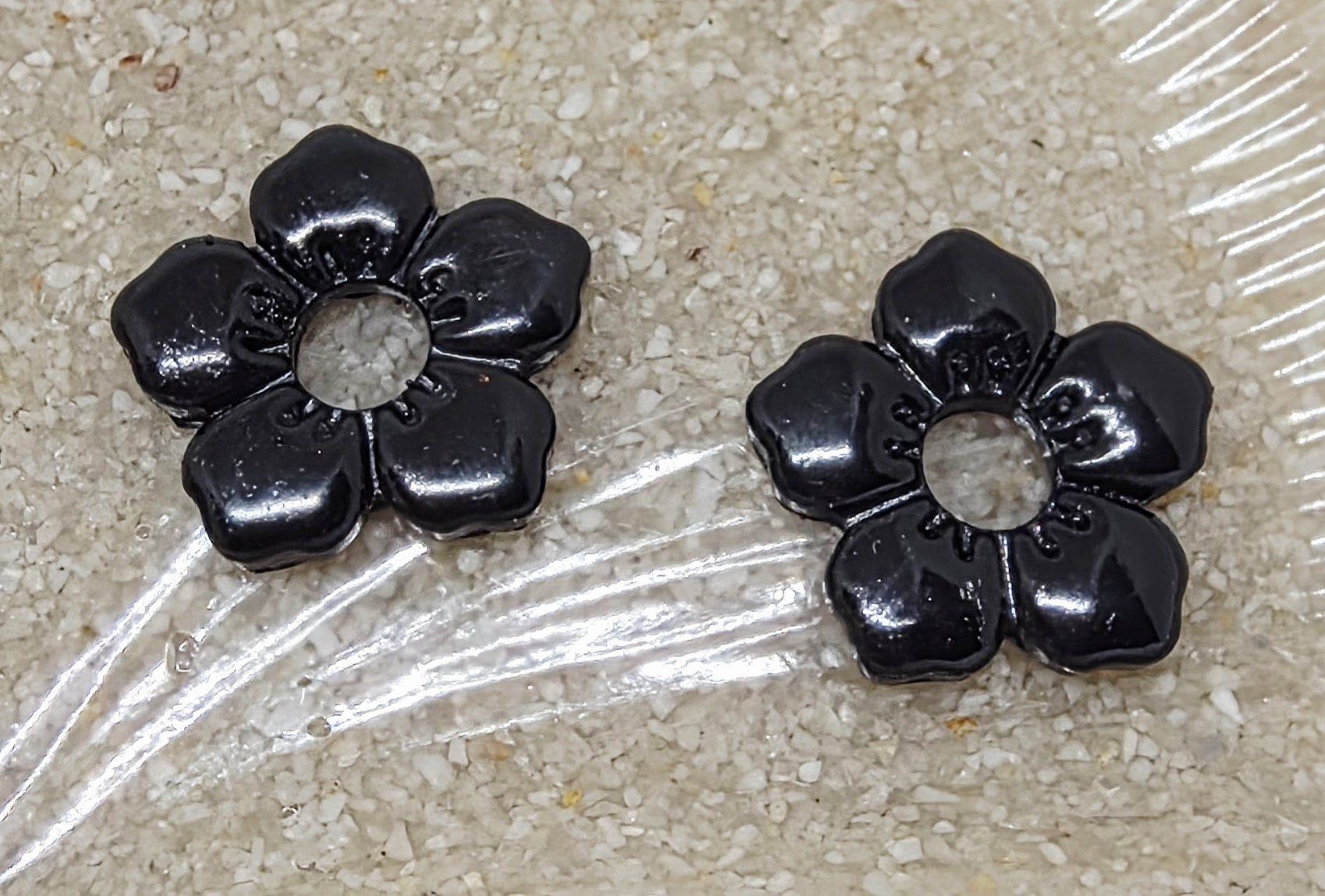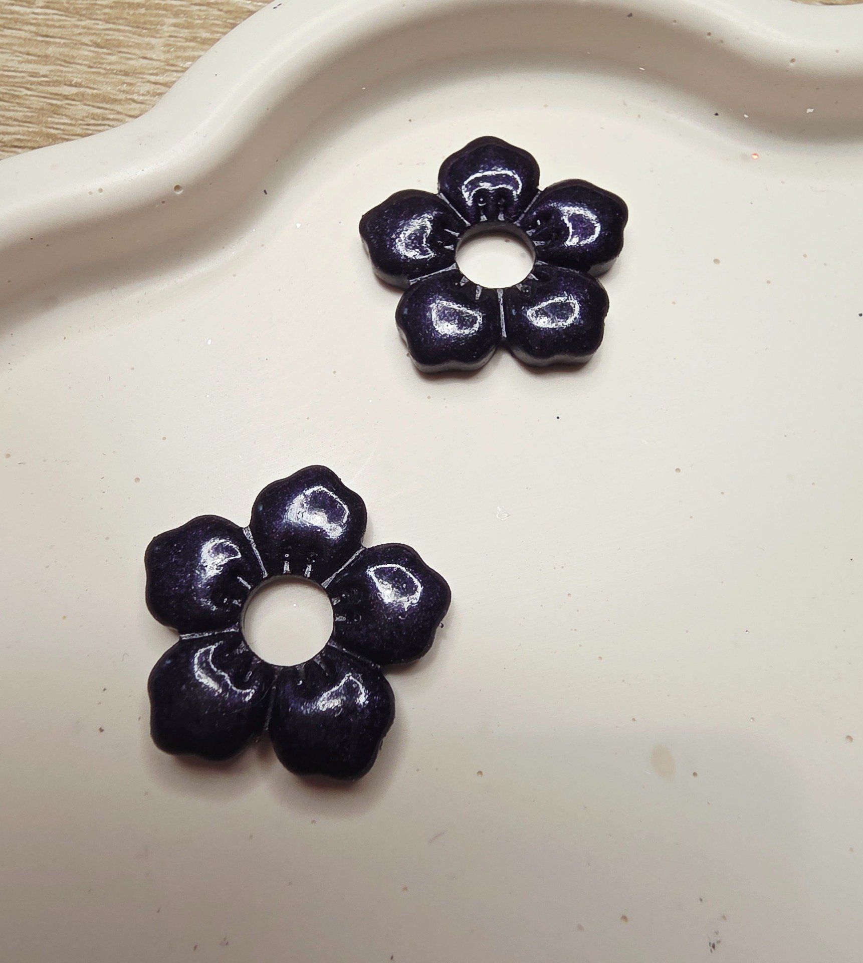 Lot de 2 Pampilles, Clara, en forme de fleur 5 pétales, en résine époxy opaque noire, compatibles avec les créoles dont la taille est supérieure à 20mm.
