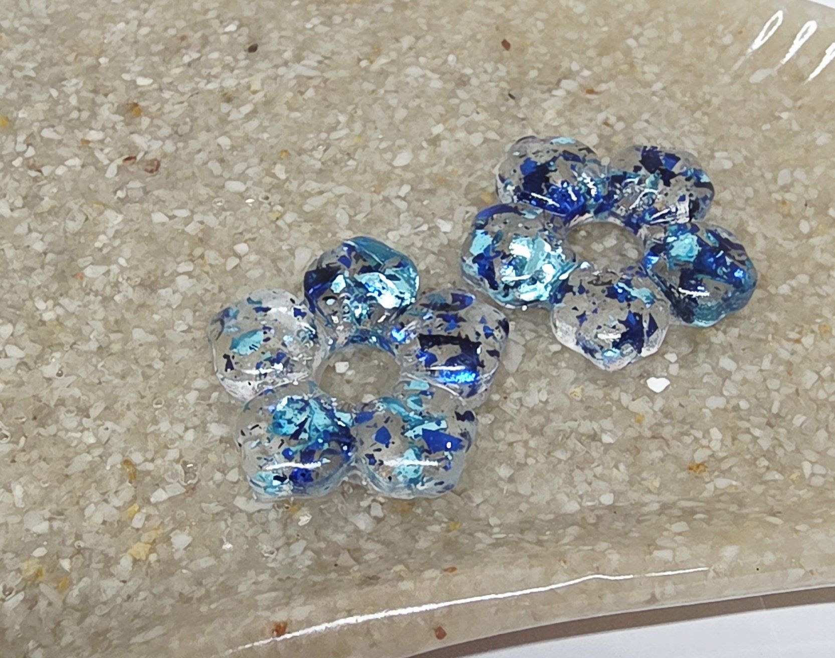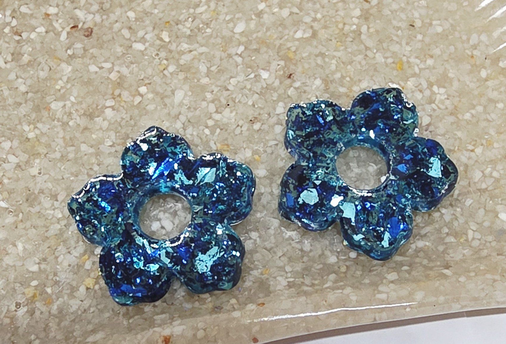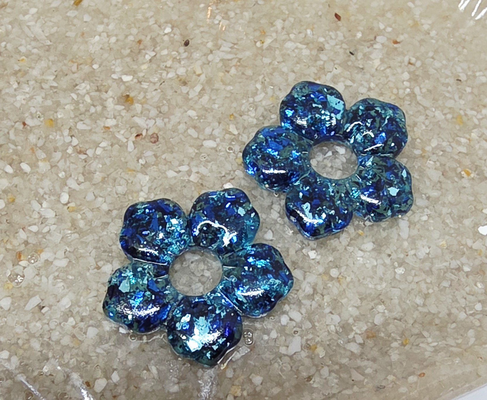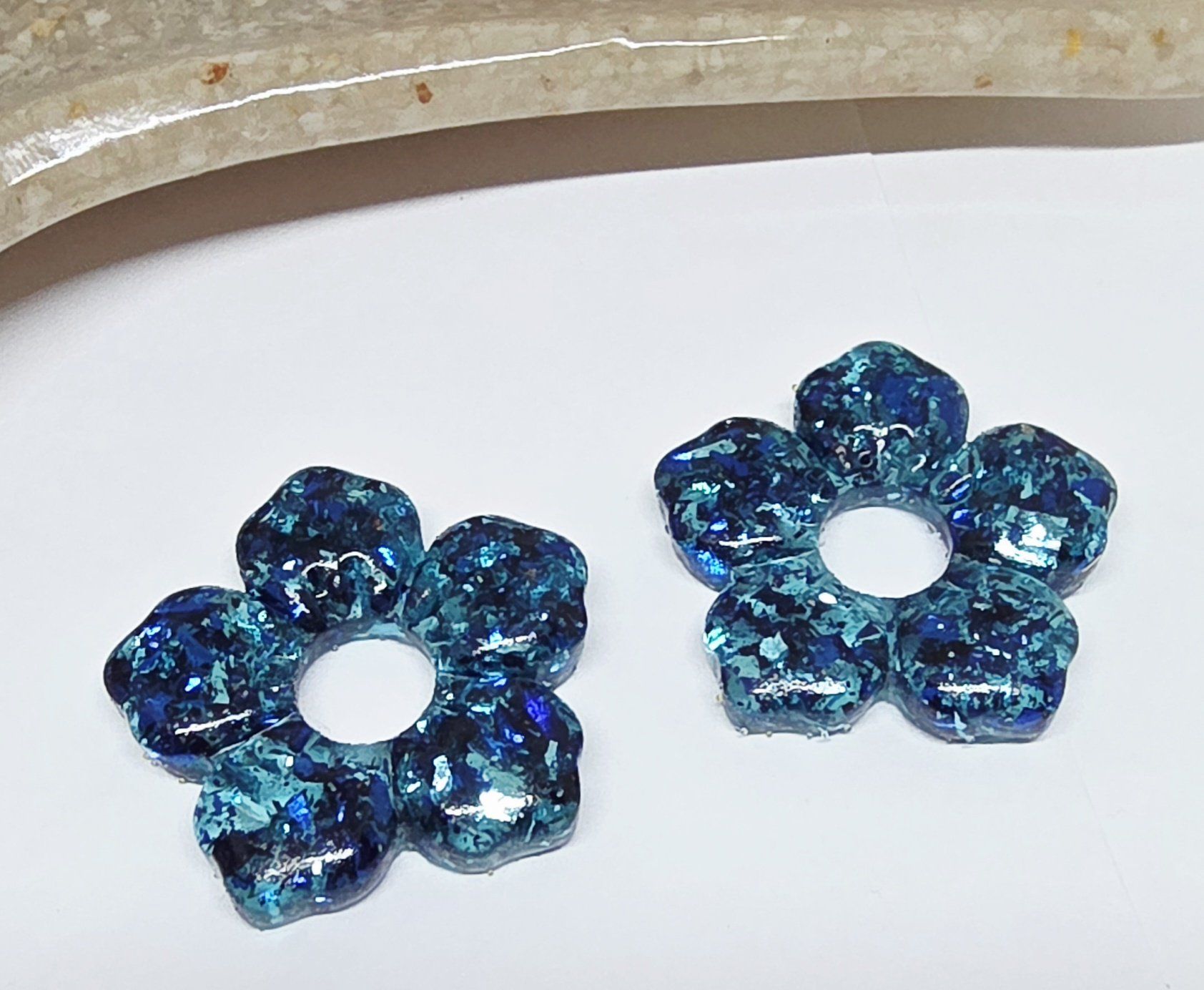Lot de 2 Pampilles, Clara, en forme de fleur 5 pétales, en résine époxy translucide avec des feuilles de 2 bleues. Compatibles avec les créoles dont la taille est > à 20mm.