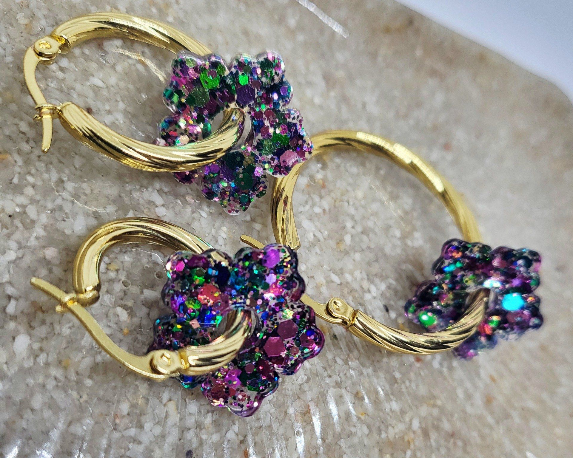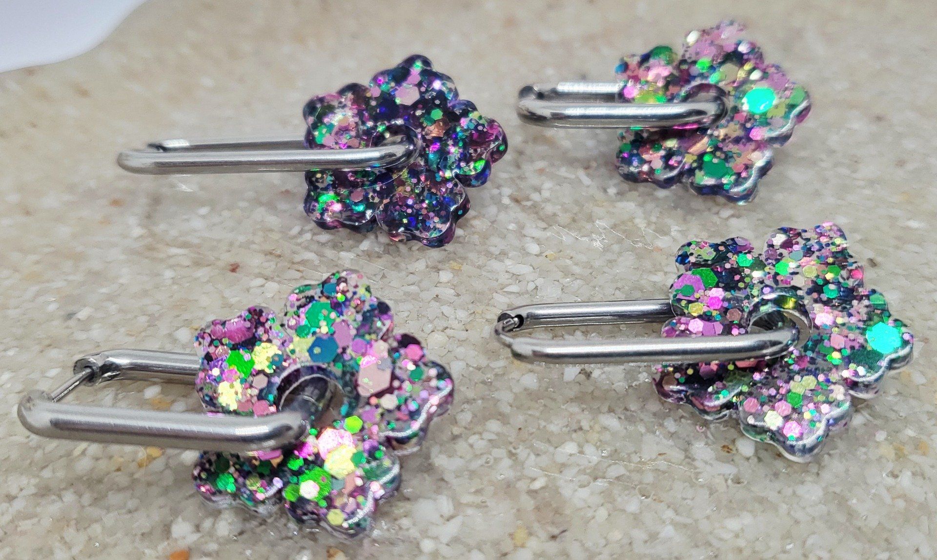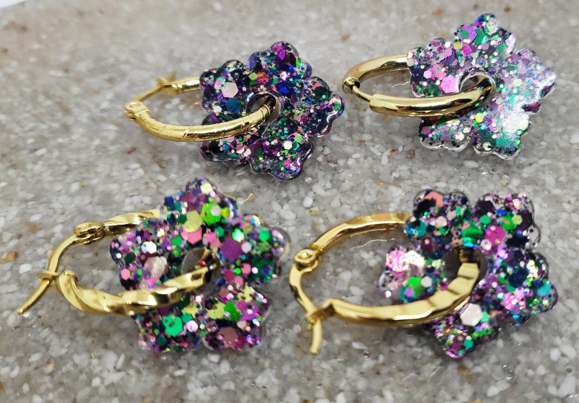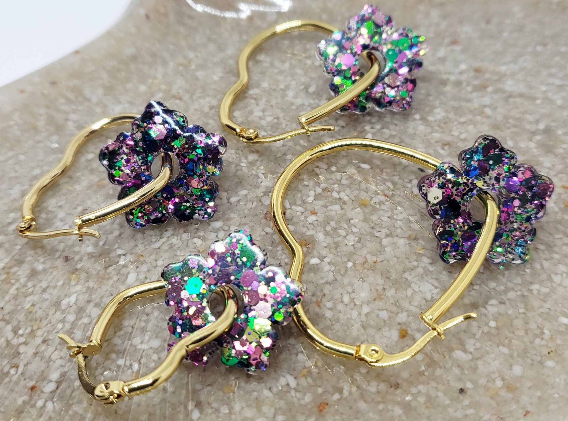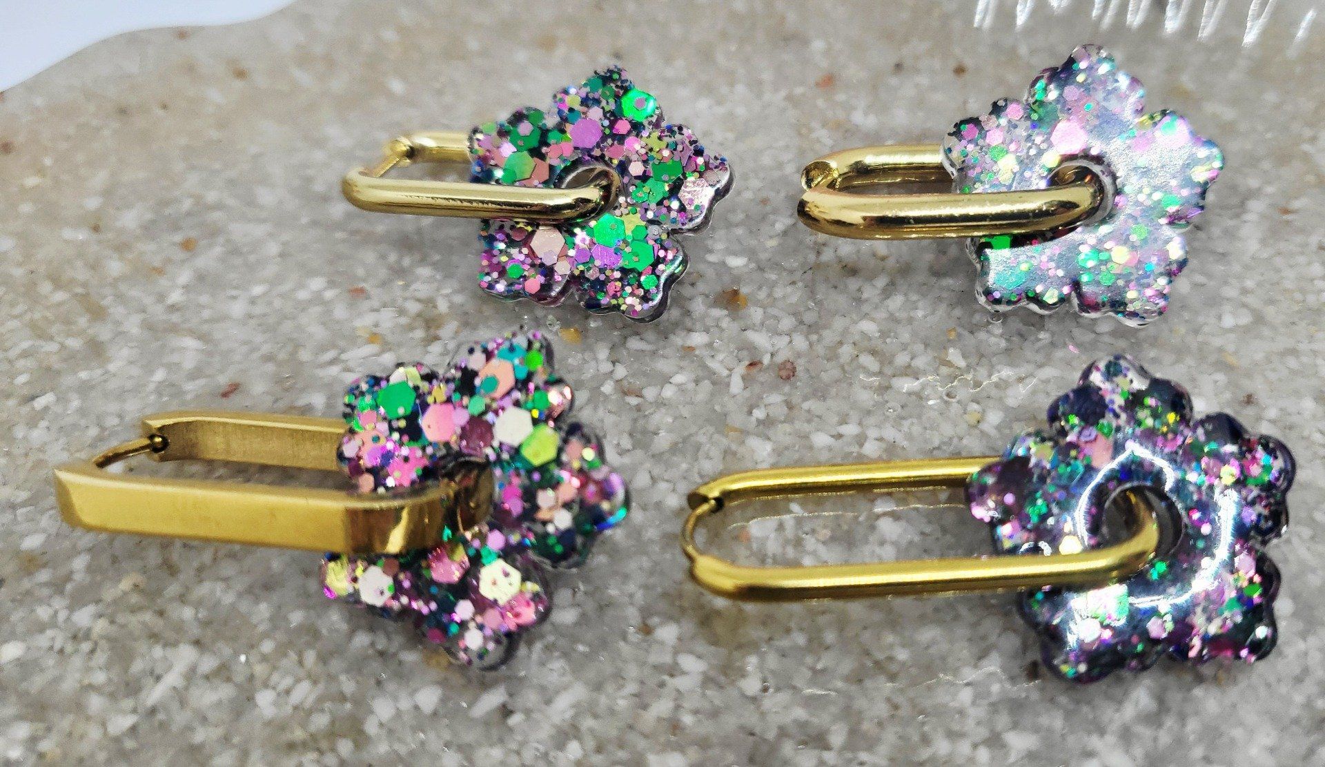 Lot de 2 pampilles en forme de fleur, réalisées en résine époxy, avec des incrustations de paillettes multicolores, compatibles avec toutes les créoles vendues sur le site . Pampilles vendues sans les créoles.