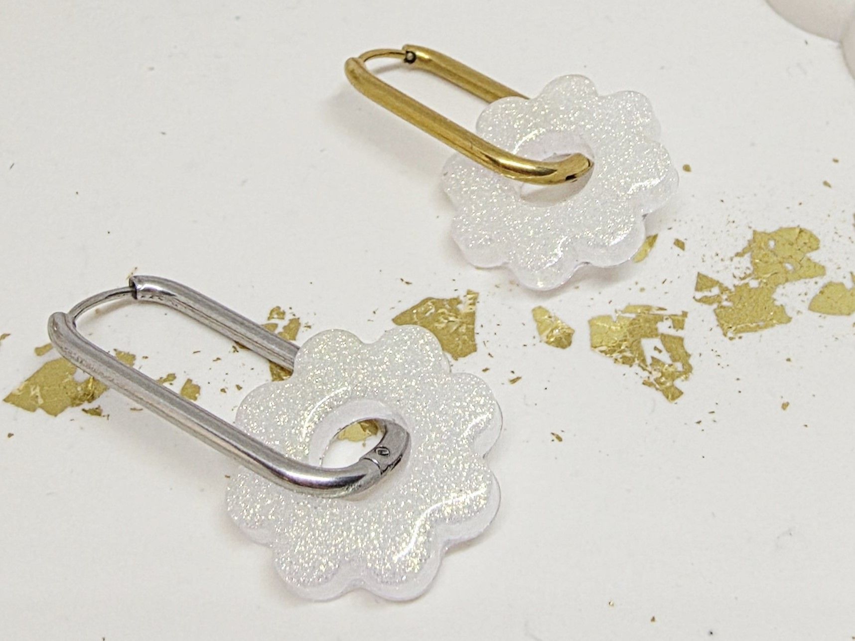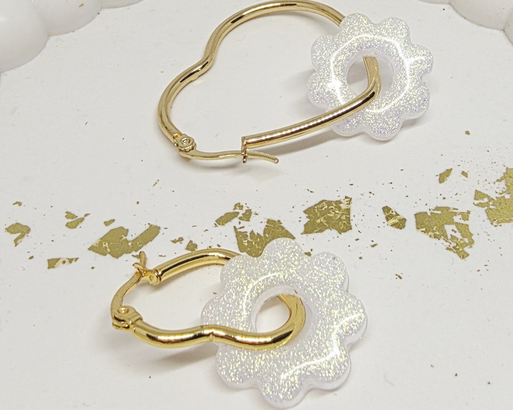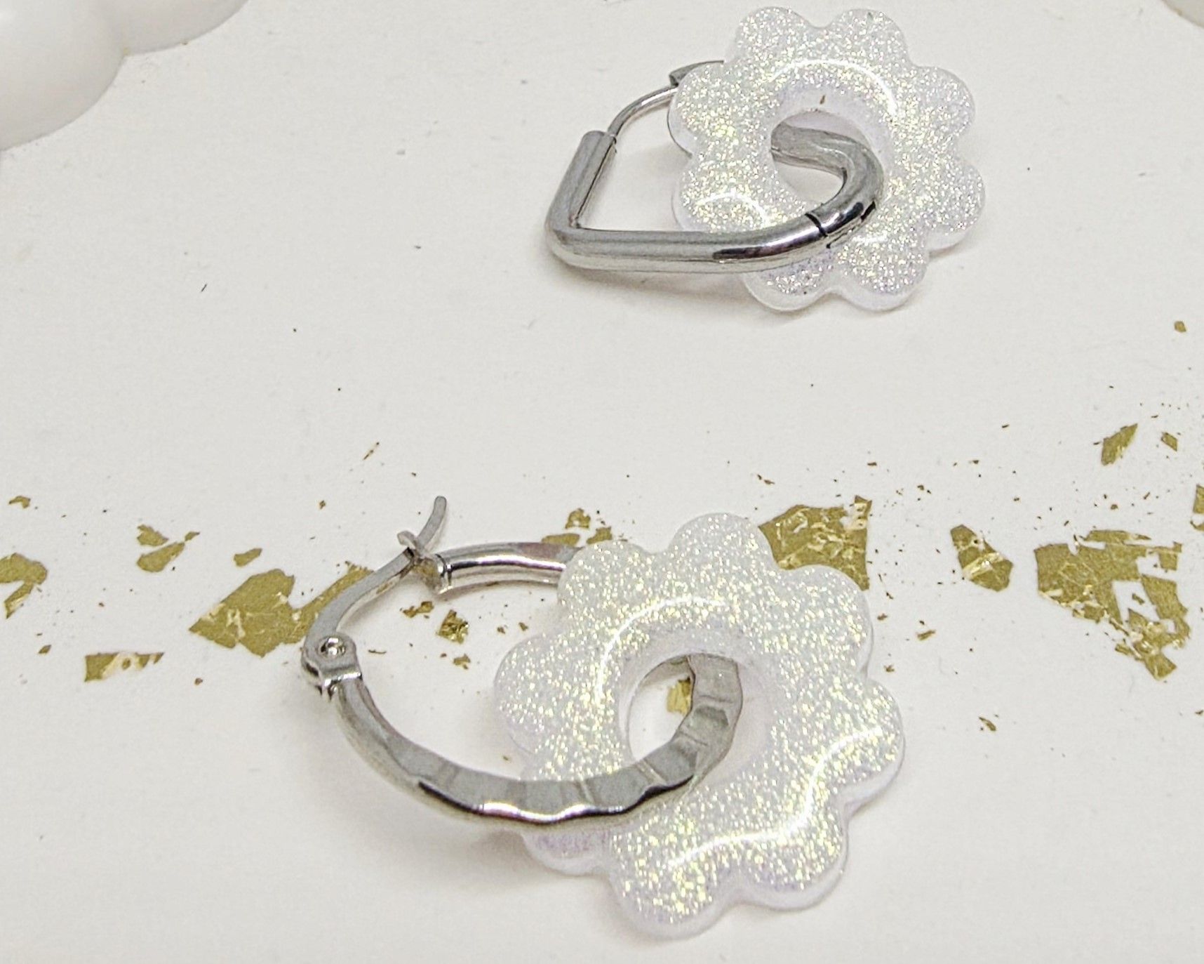 Lot de 2 Pampilles fleur 8 pétales en résine époxy de couleur blanche opaque et irisée. Vendues sans les créoles (différents modèles possibles) qui peuvent être commandées séparément.