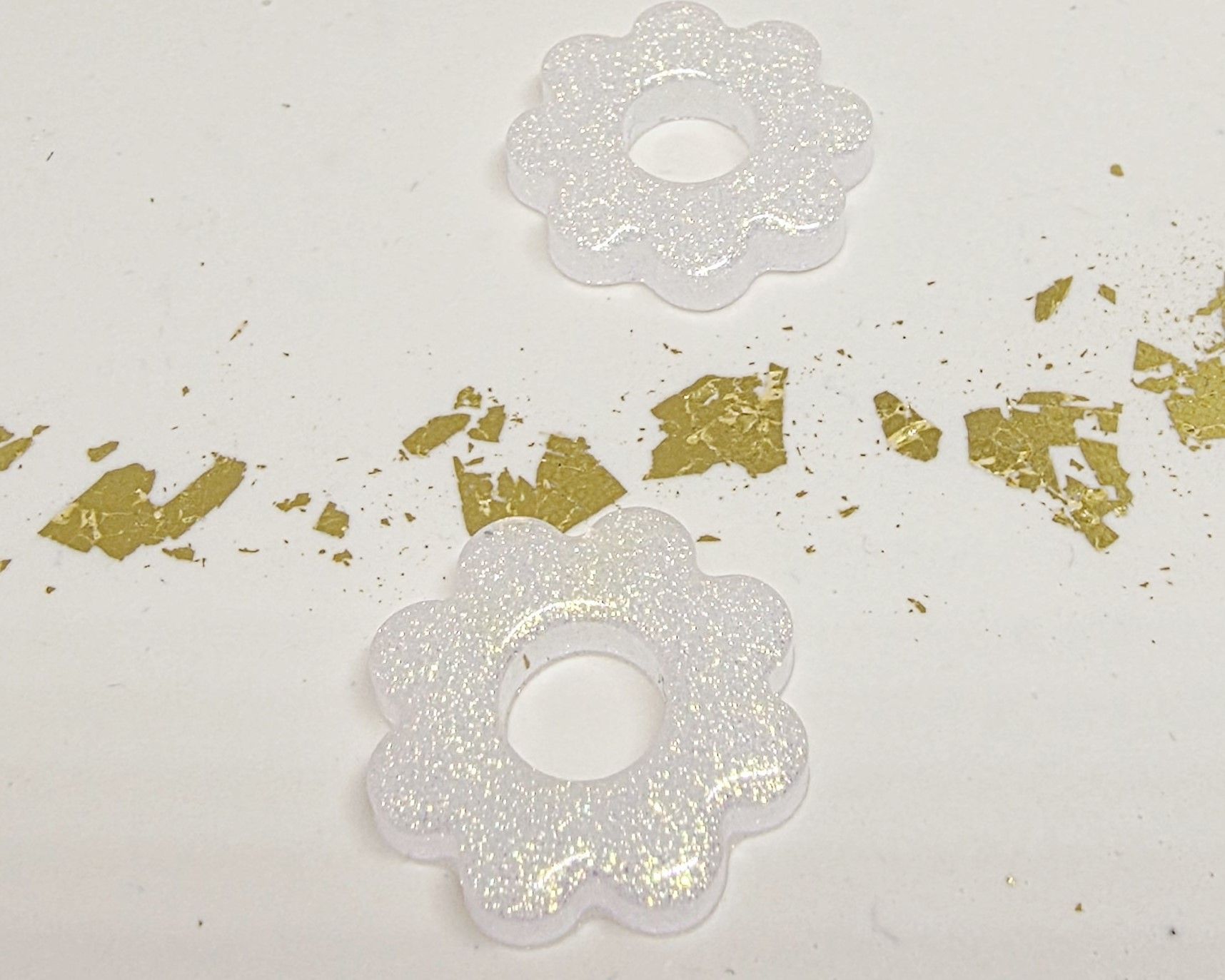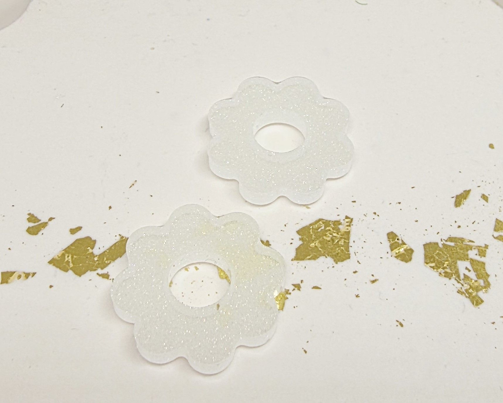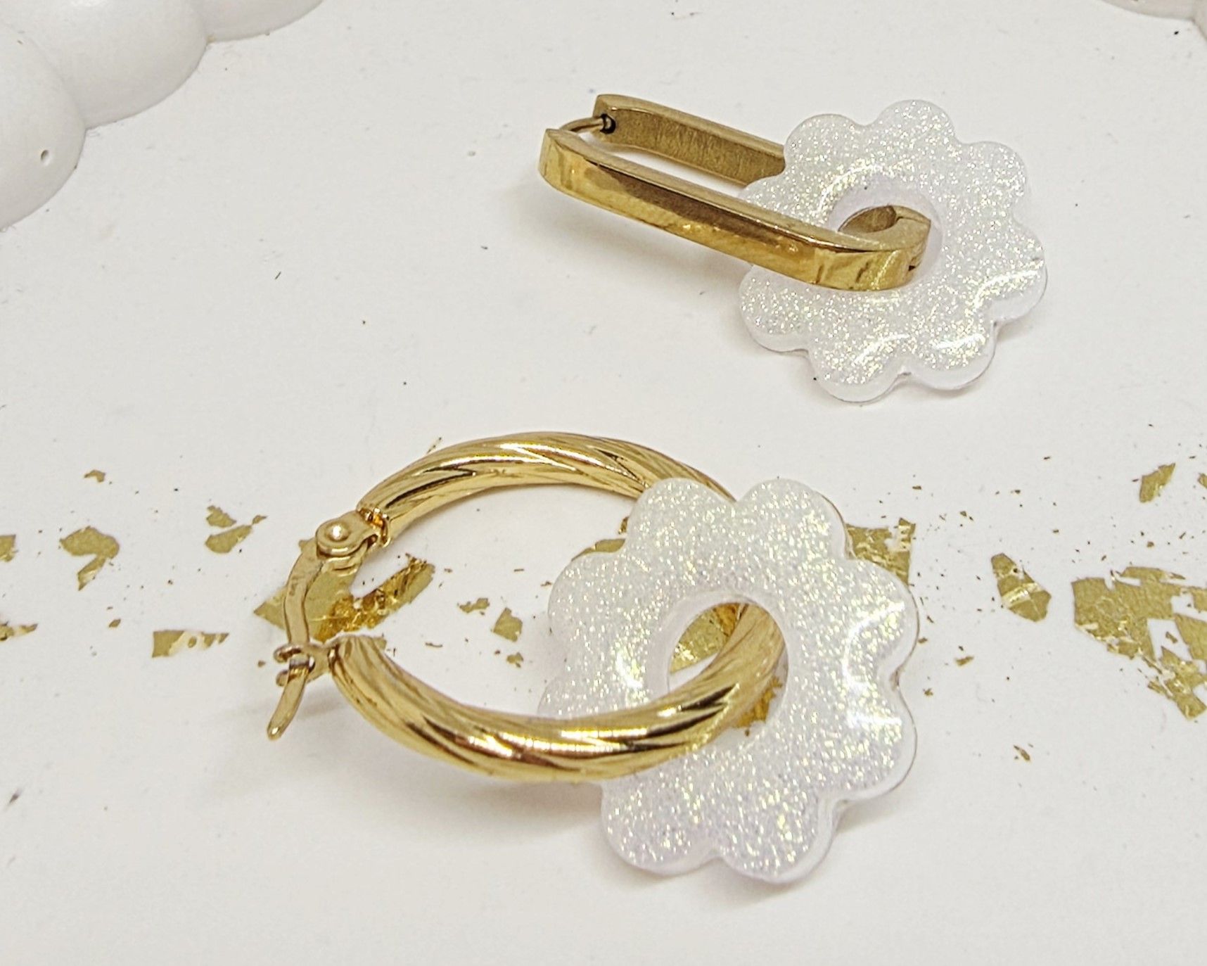 Lot de 2 Pampilles fleur 8 pétales en résine époxy de couleur blanche opaque et irisée. Vendues sans les créoles (différents modèles possibles) qui peuvent être commandées séparément.
