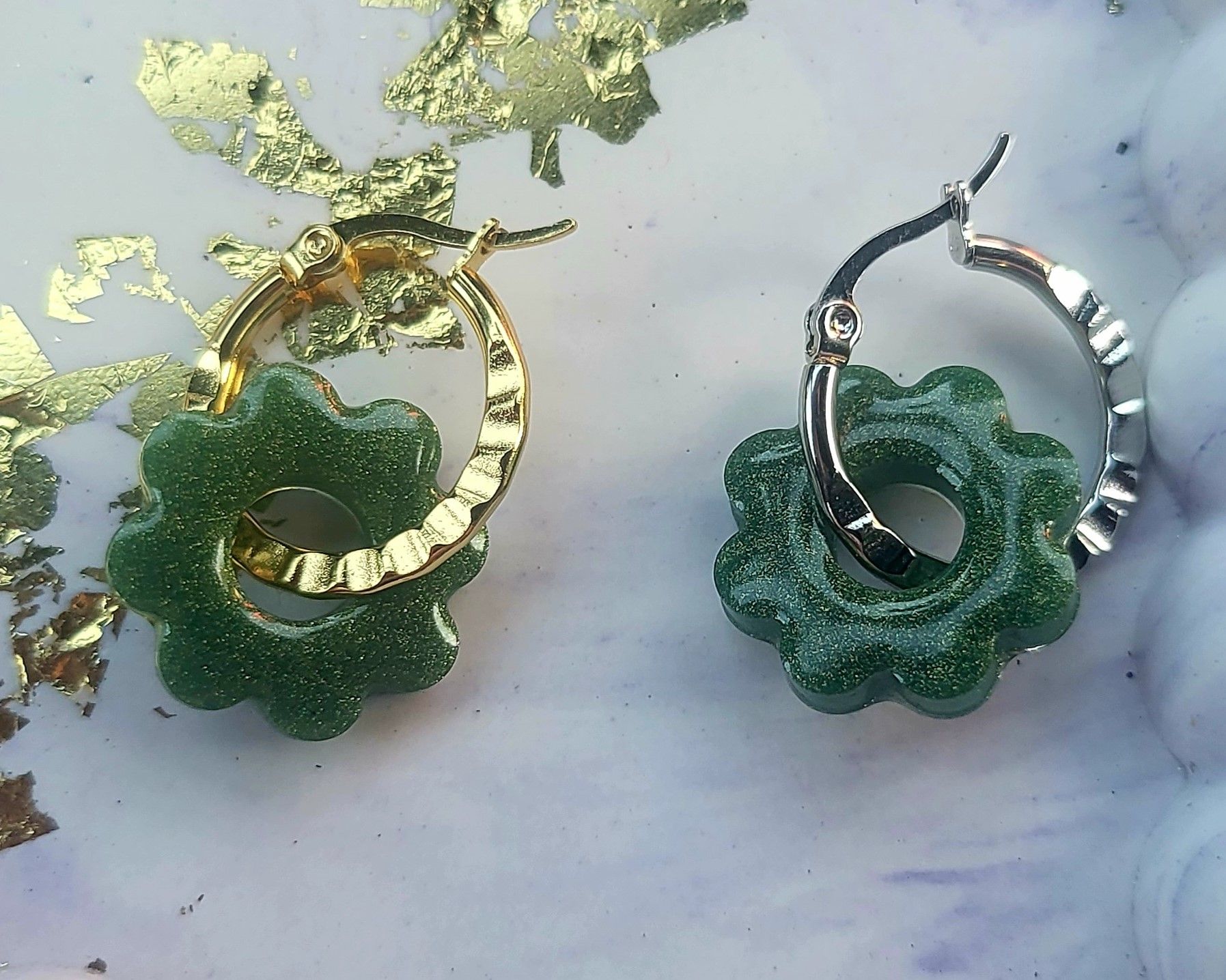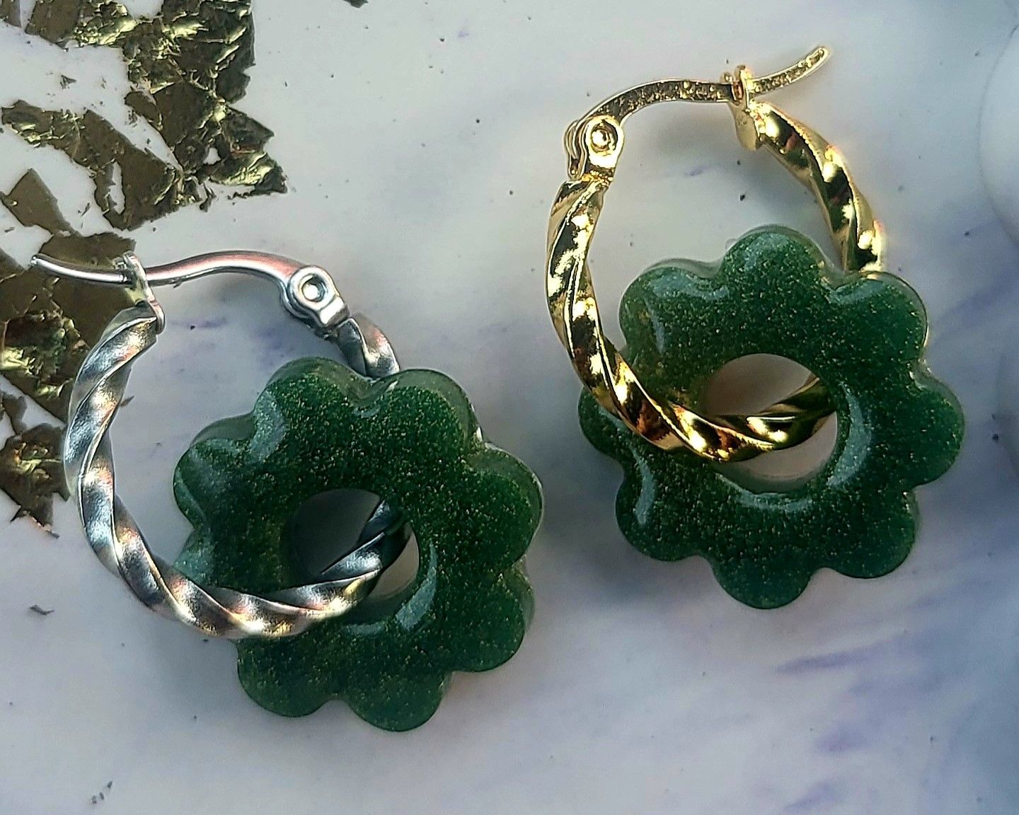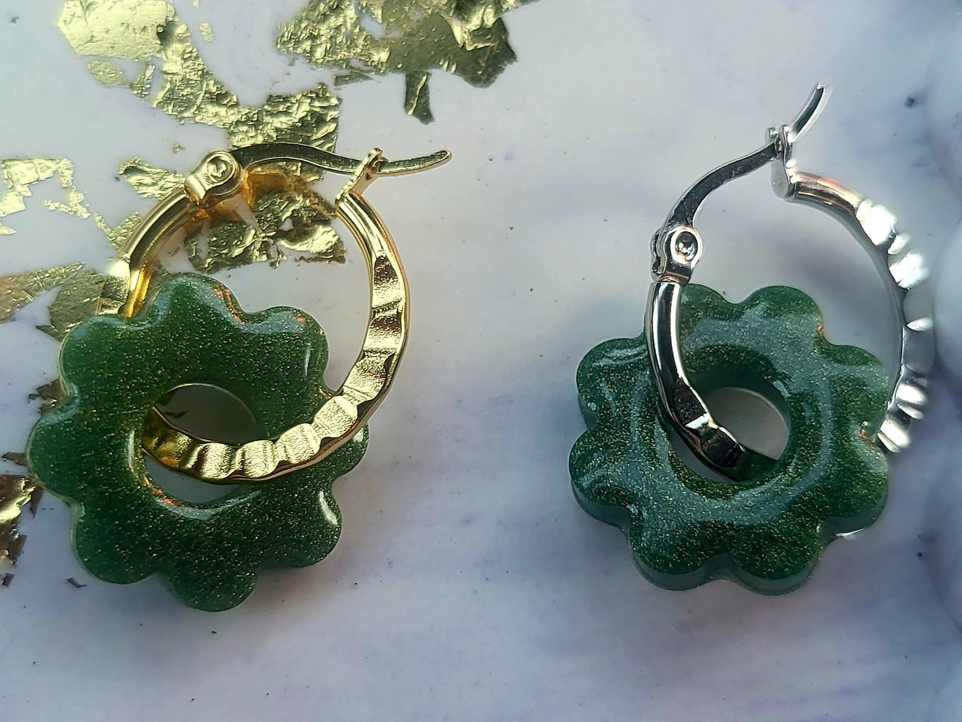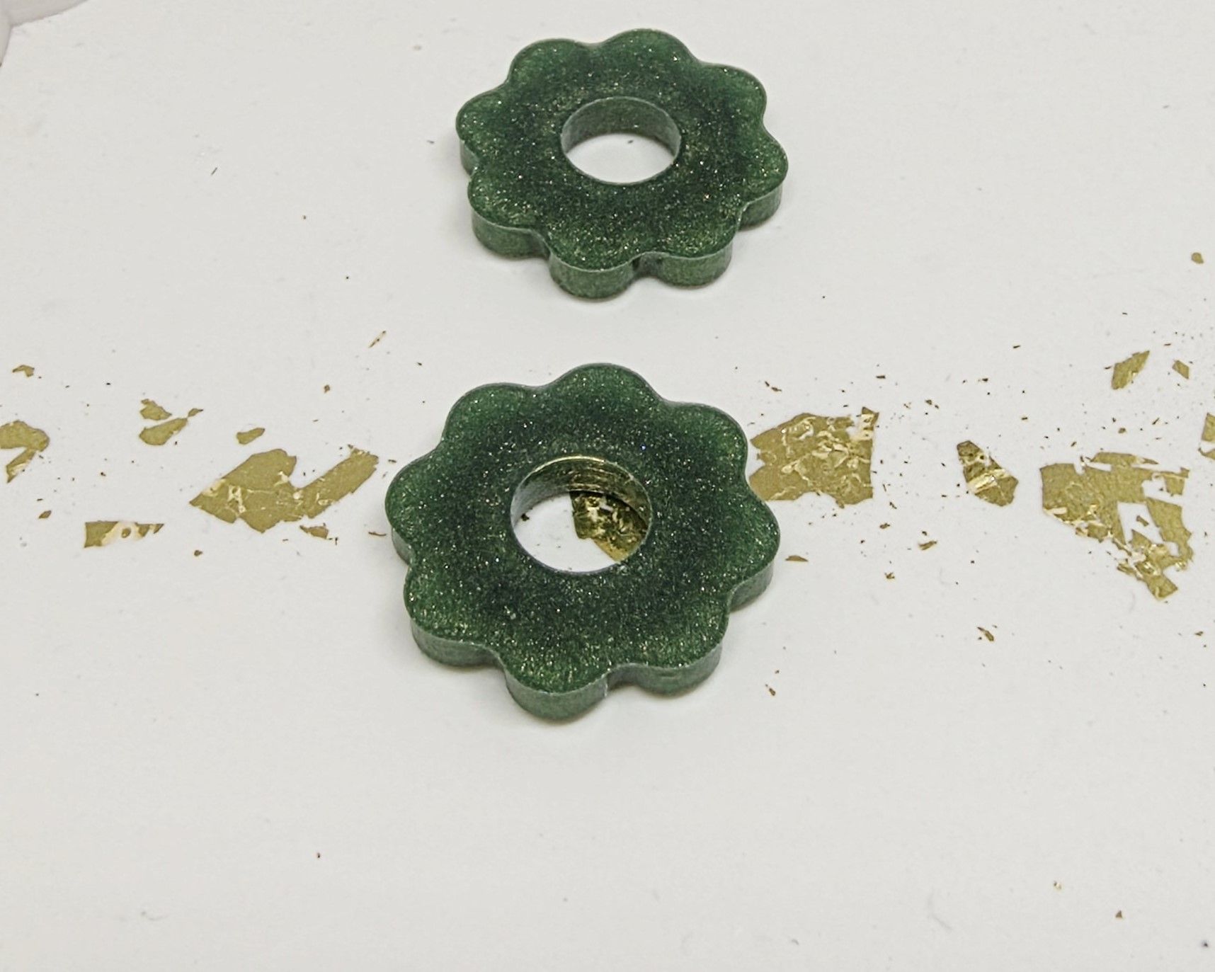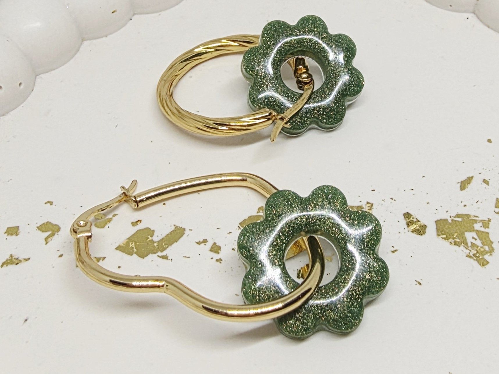 Lot de 2 Pampilles fleur 8 pétales en résine époxy de couleur verte irisée. Vendues sans les créoles (différents modèles possibles) qui peuvent être commandées séparément.