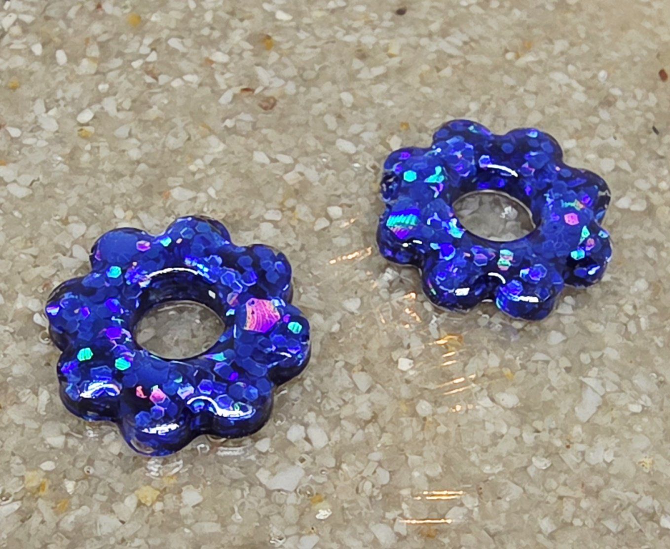 Lot de 2 Pampilles en forme de fleurs en résine époxy avec incrustation de paillettes bleues (différentes nuances disponible). Vendues sans les créoles (différents modèles possibles) qui peuvent être commandées séparément.