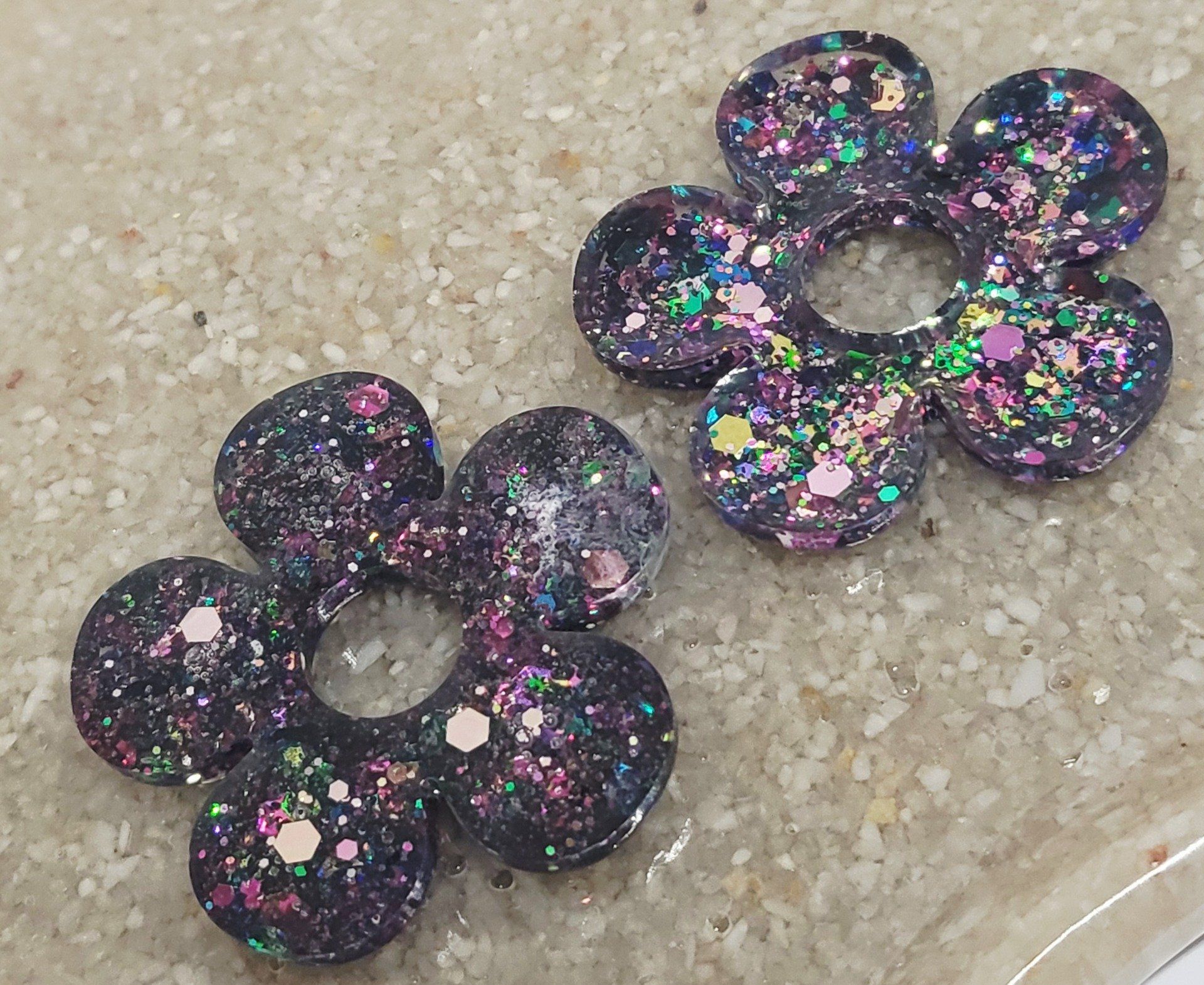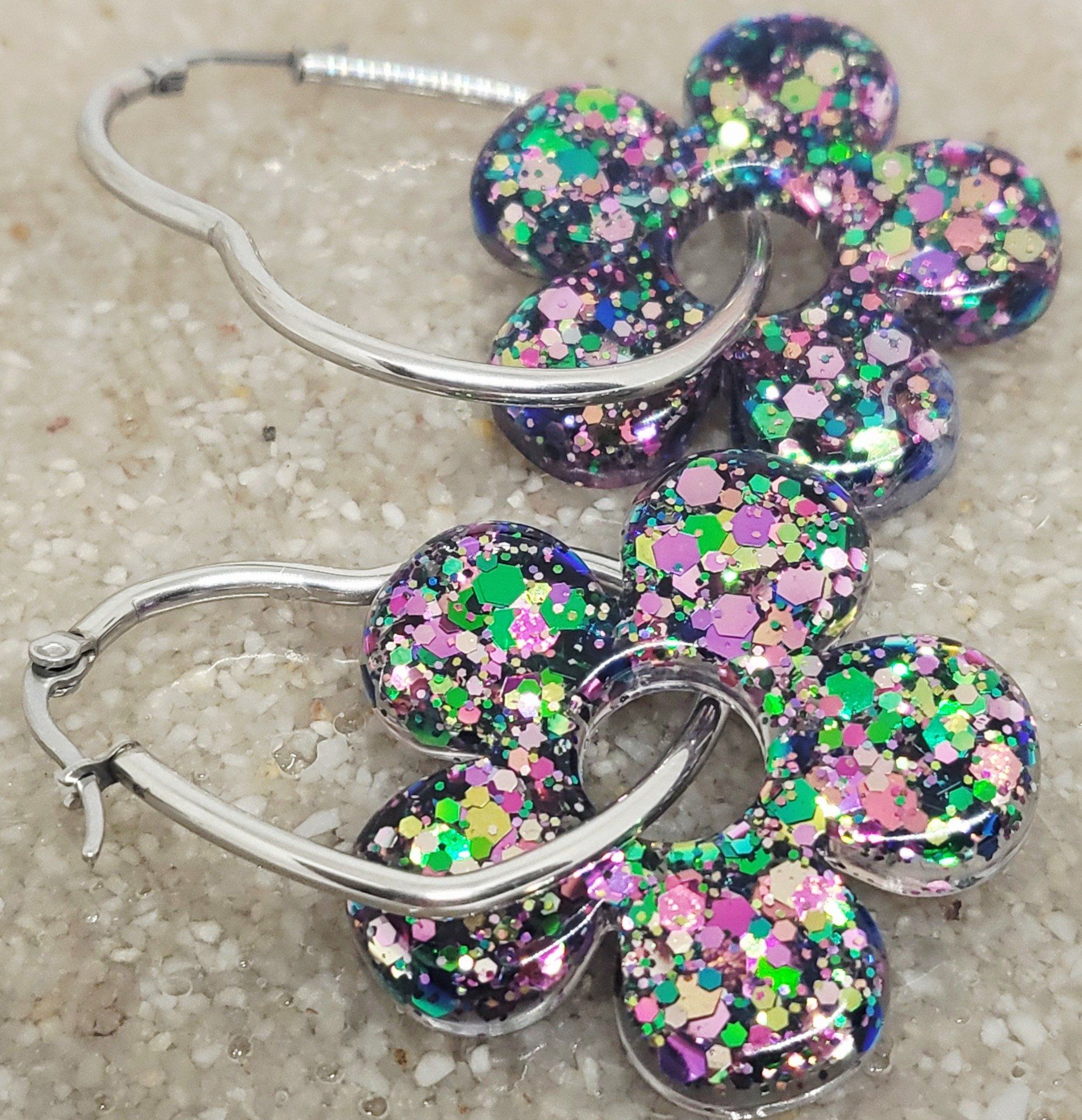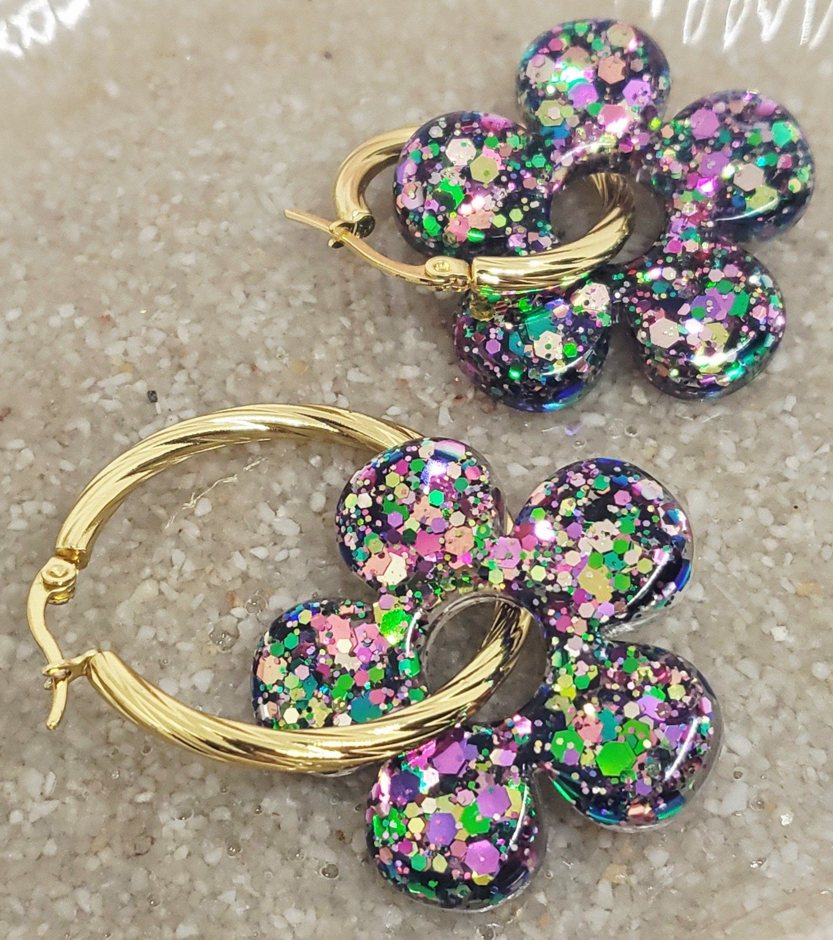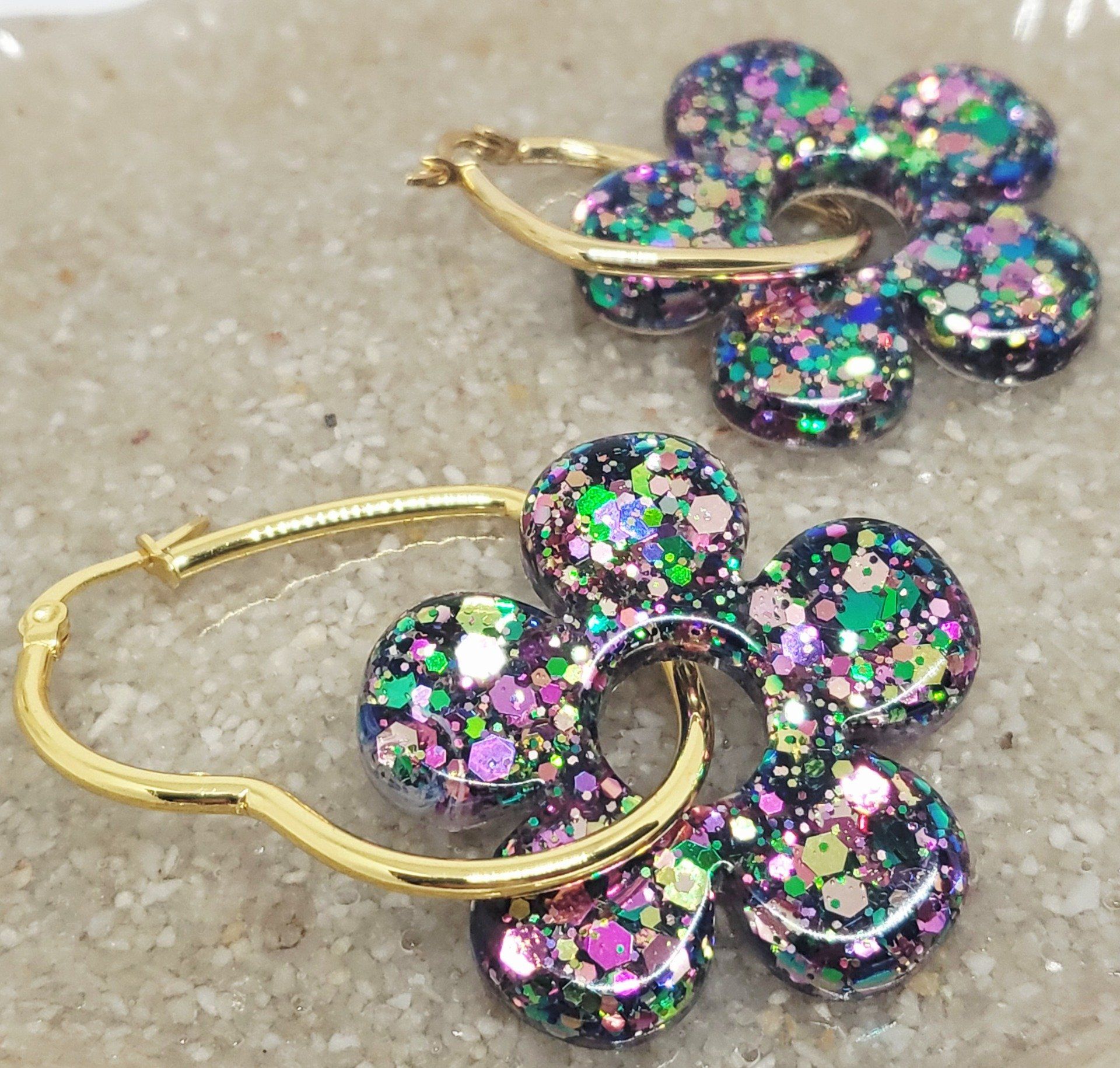 Lot de 2 Pampilles, modèle Aria, réalisées en résine époxy avec des incrustations de paillettes multicolores, compatibles avec les créoles dont la taille est supérieure à 20 mm.