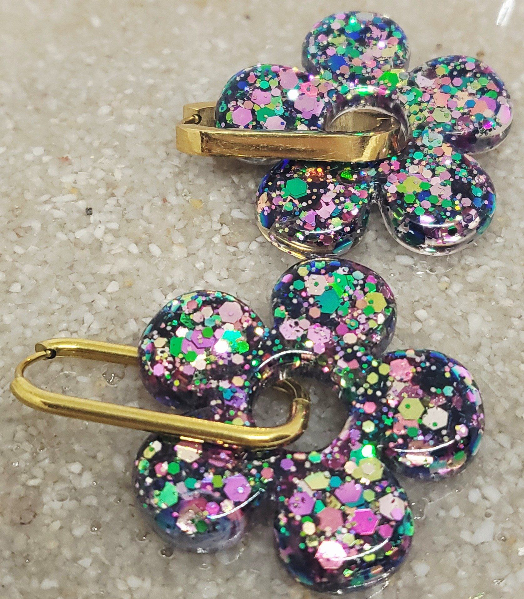 – Résine époxy avec des incrustations de paillettes multicolores aux reflets changeants.