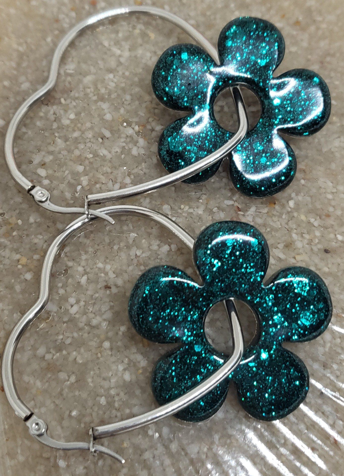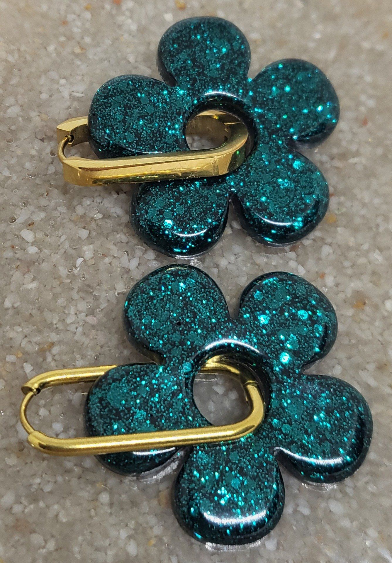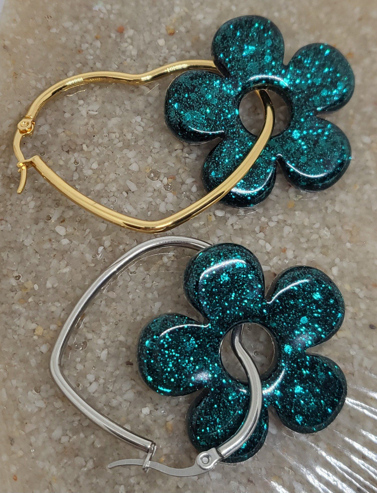 Lot de 2 Pampilles, modèles Aria, réalisées en résine époxy avec des incrustations de paillettes vertes émeraude, compatibles avec les créoles dont la taille est supérieure à 20 mm.
