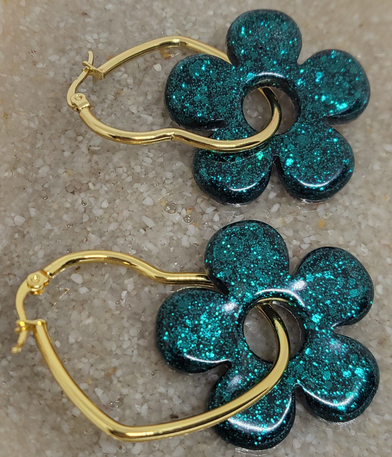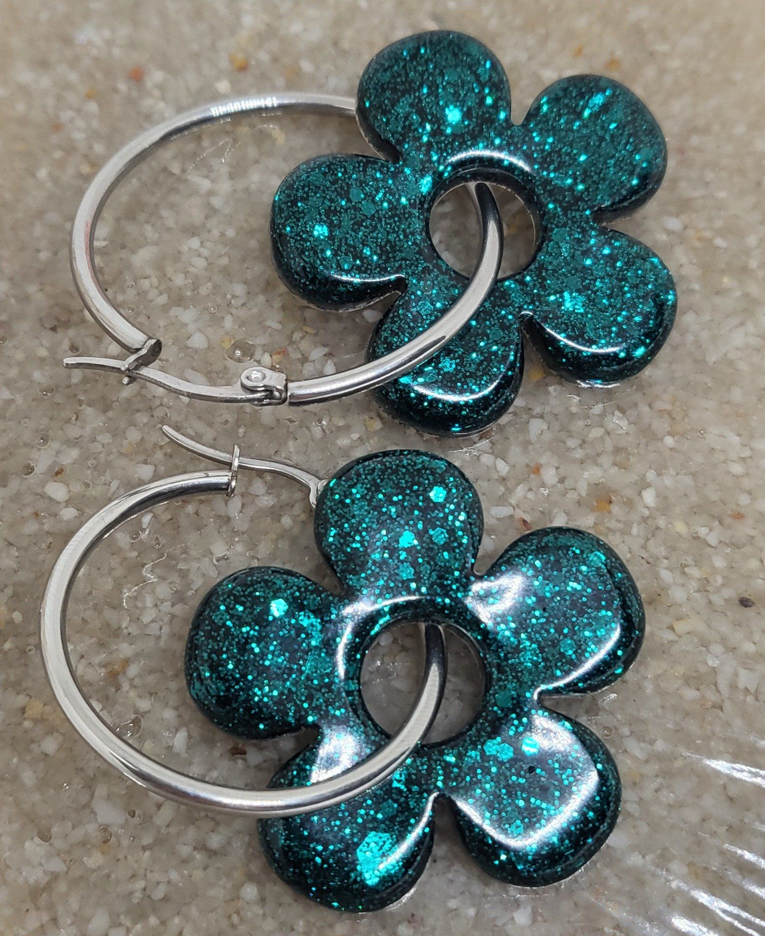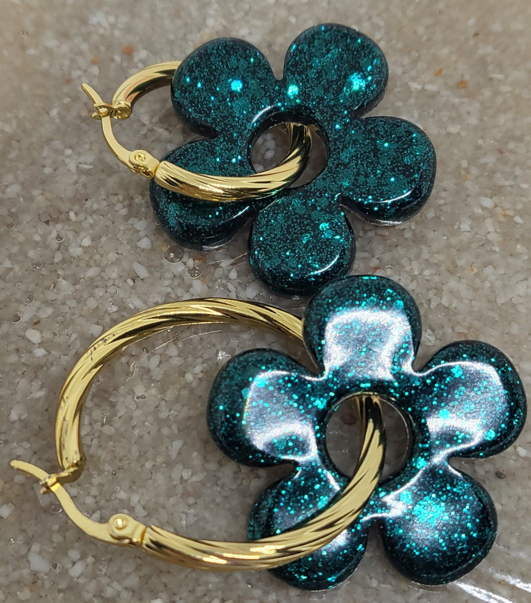 Lot de 2 Pampilles, modèles Aria, réalisées en résine époxy avec des incrustations de paillettes vertes émeraude, compatibles avec les créoles dont la taille est supérieure à 20 mm.