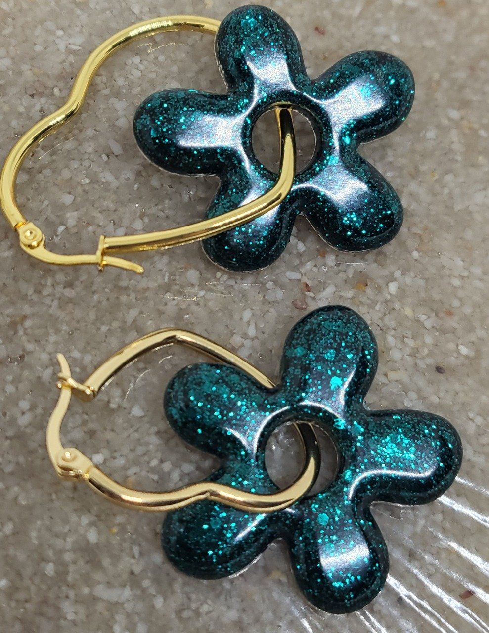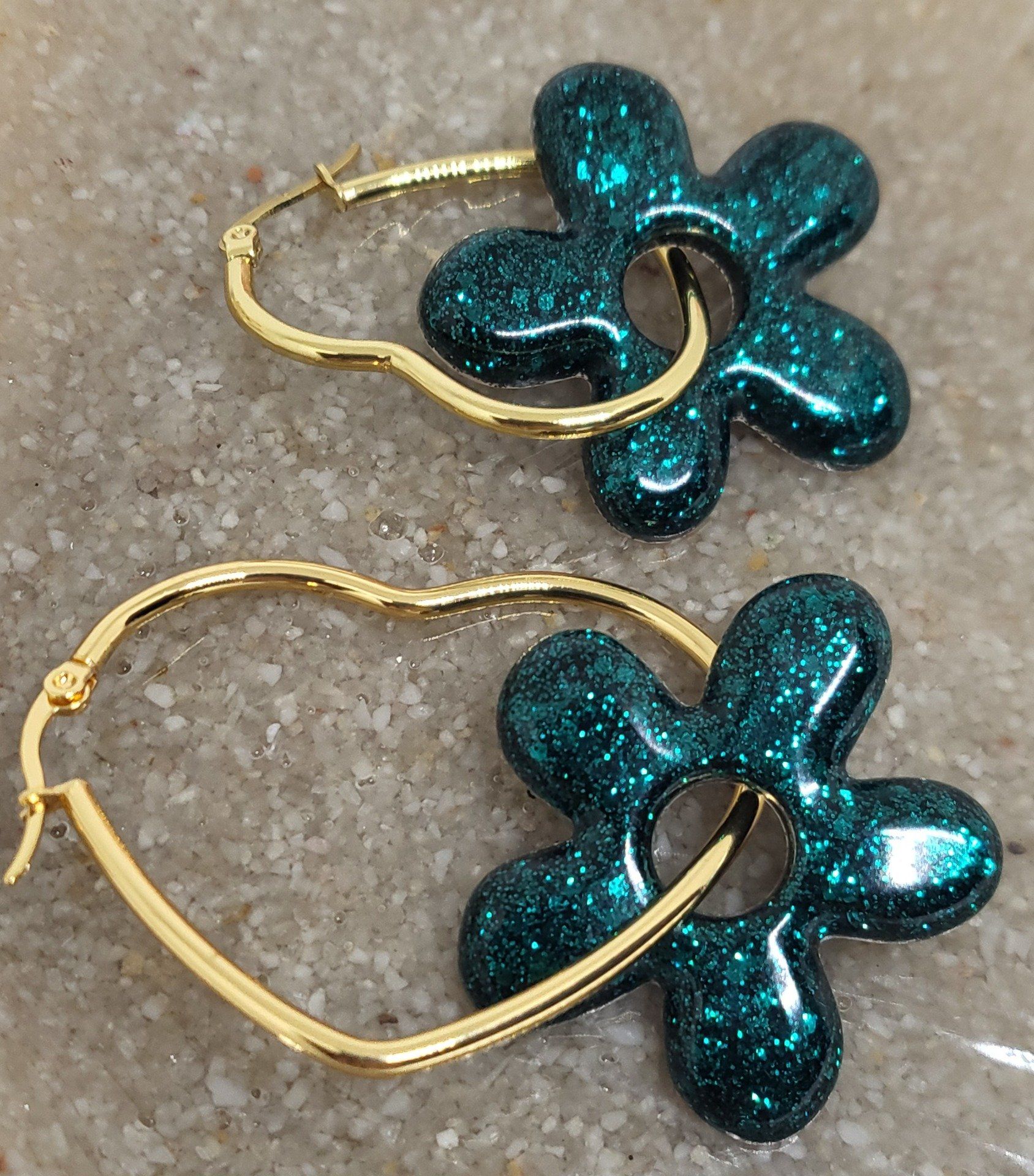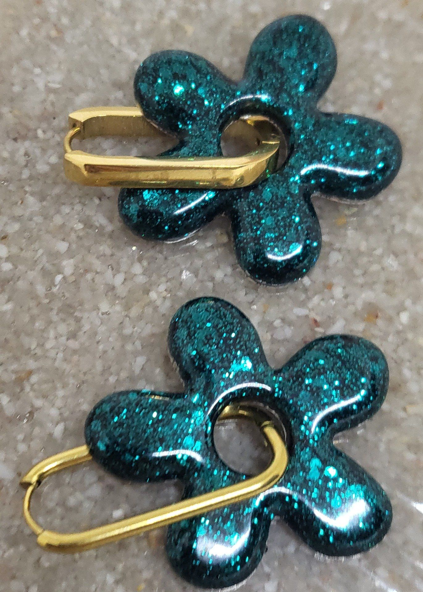 Lot de 2 Pampilles, modèles Athéna, réalisées en résine époxy avec des paillettes vertes émeraude, compatibles avec les créoles dont la taille est supérieure à 20 mm.