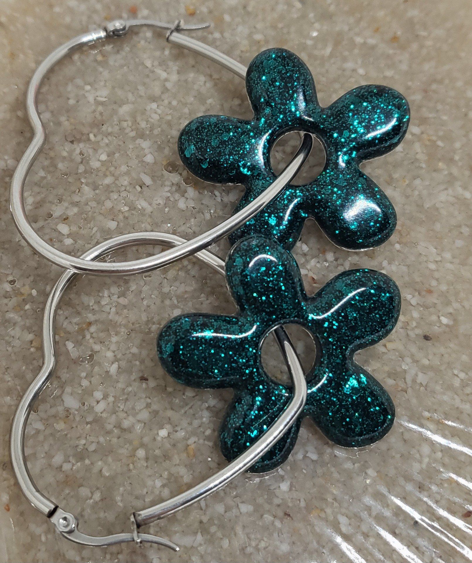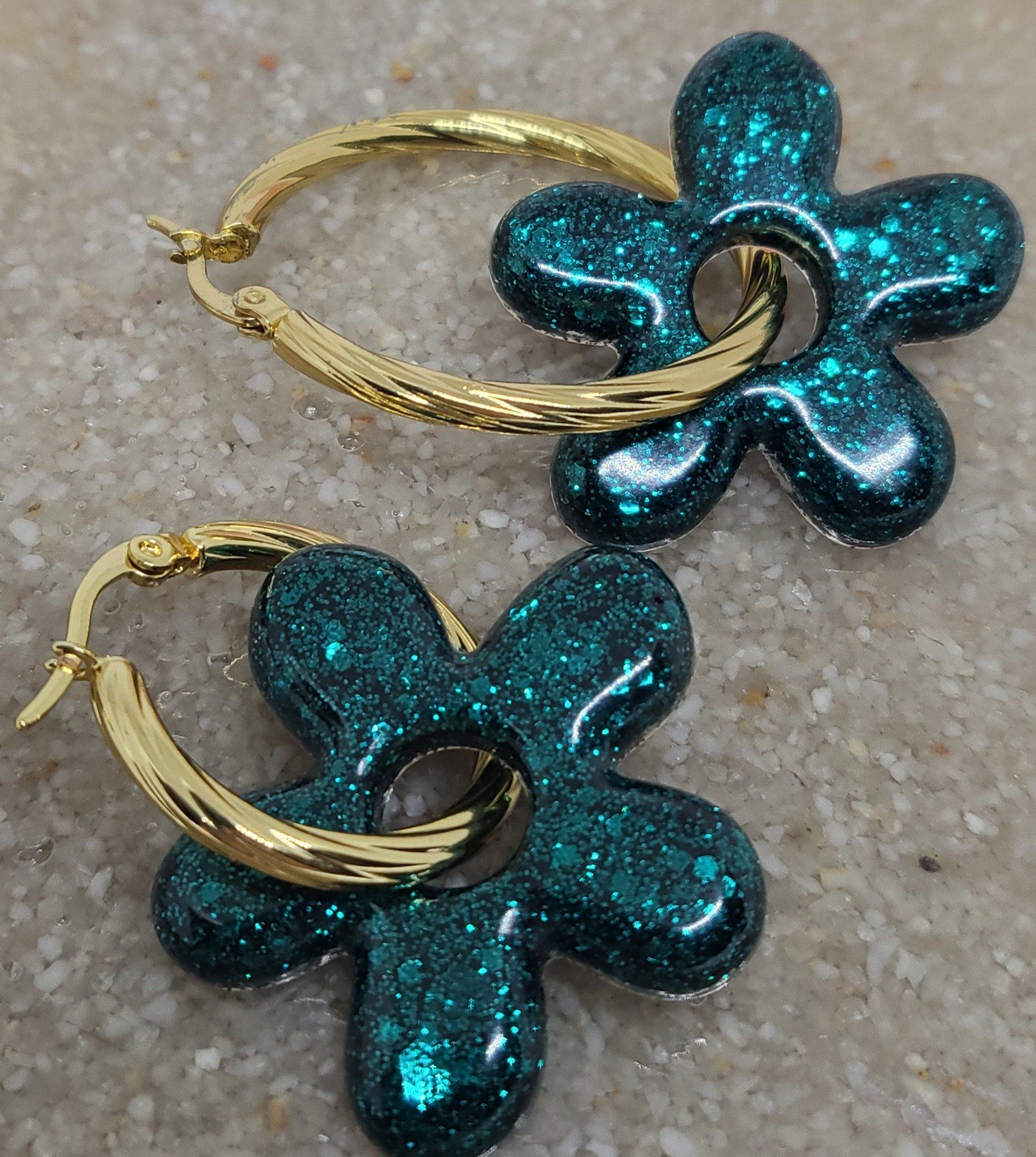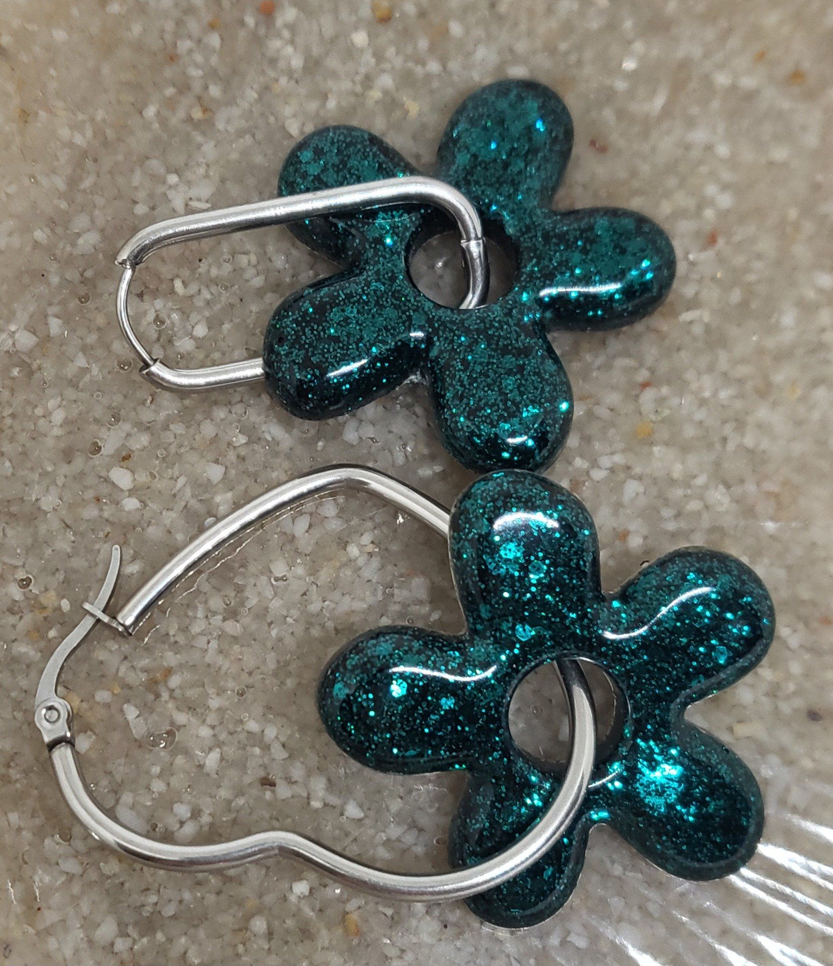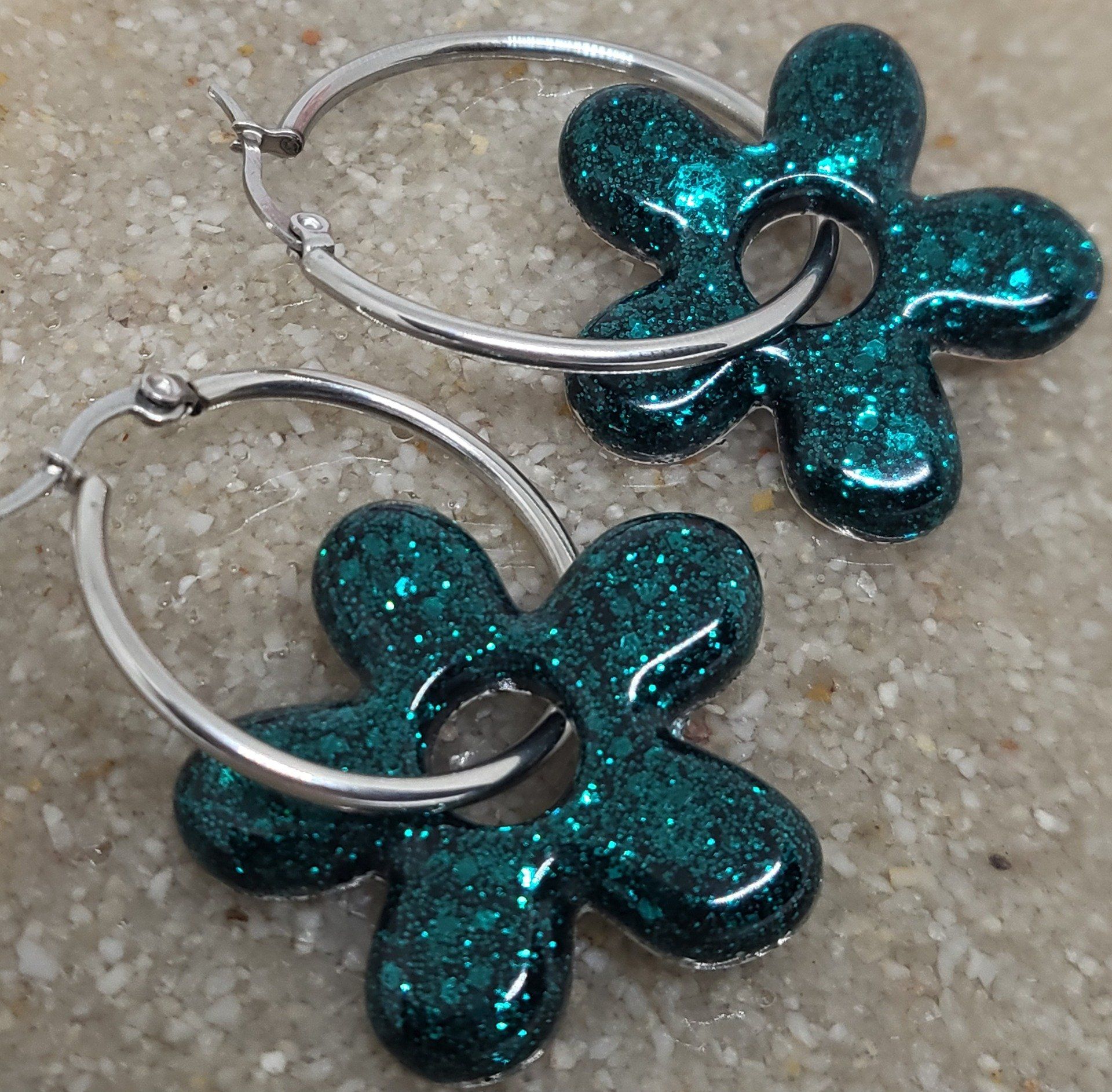 Lot de 2 Pampilles, modèles Athéna, réalisées en résine époxy avec des paillettes vertes émeraude, compatibles avec les créoles dont la taille est supérieure à 20 mm.