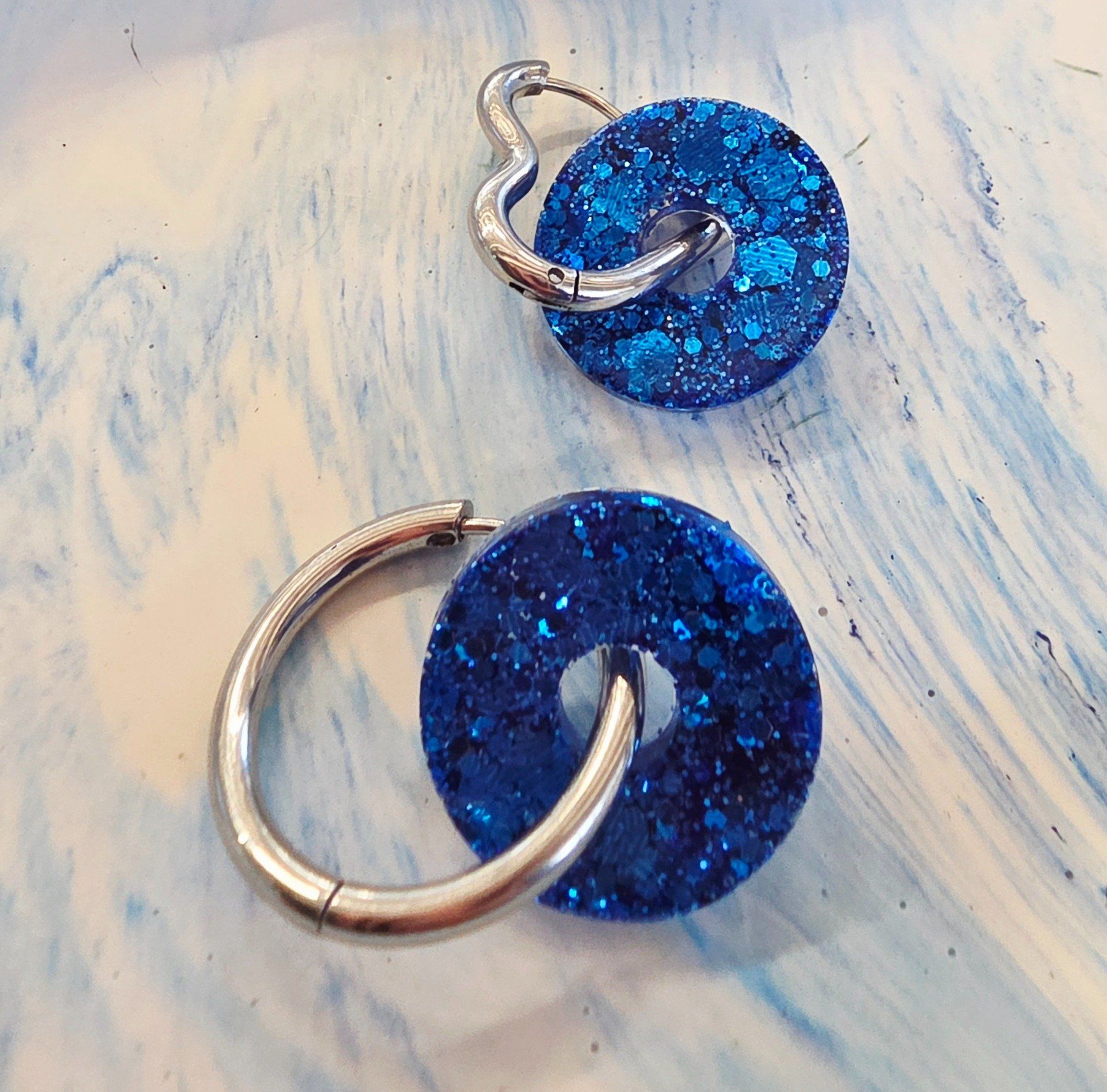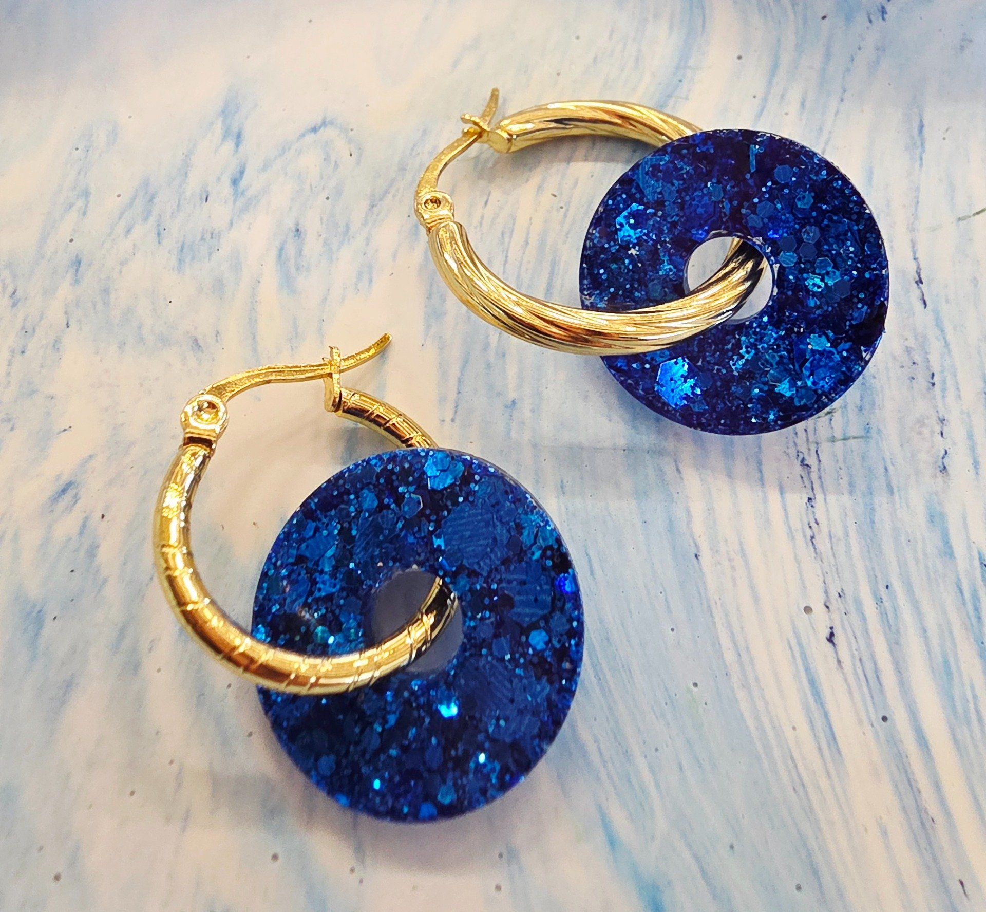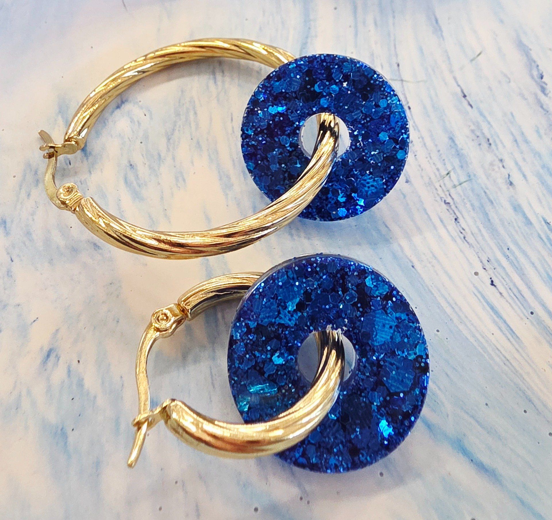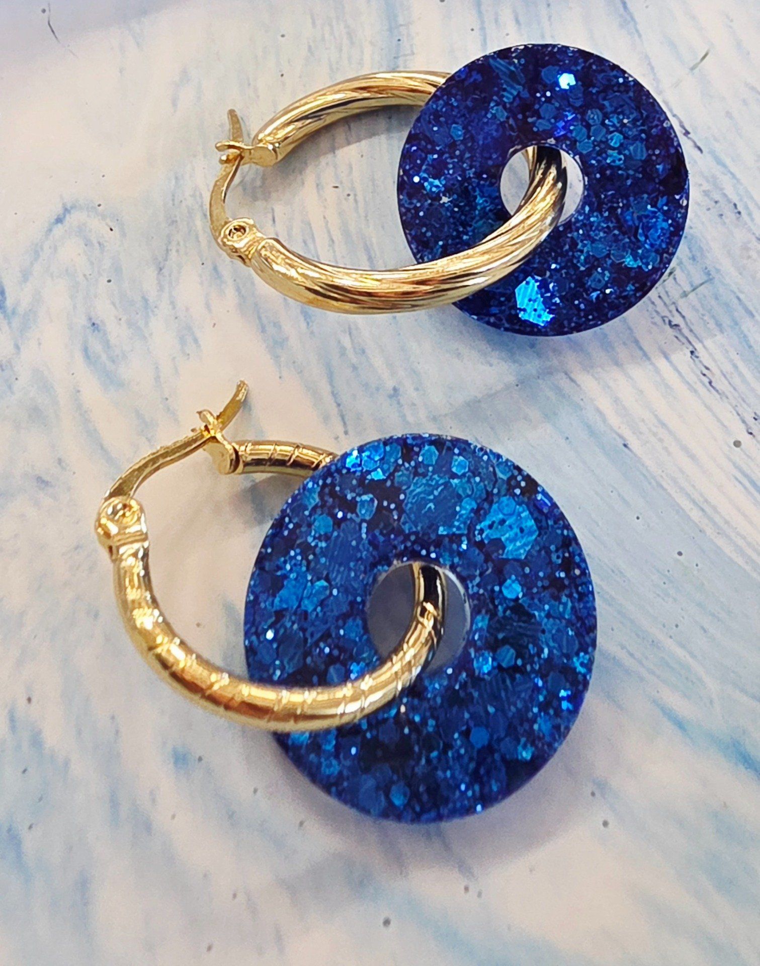 Lot de 2 Pampilles, en forme ronde, en résine époxy avec des incrustations de paillettes bleues, compatibles avec les créoles vendues sur le site.