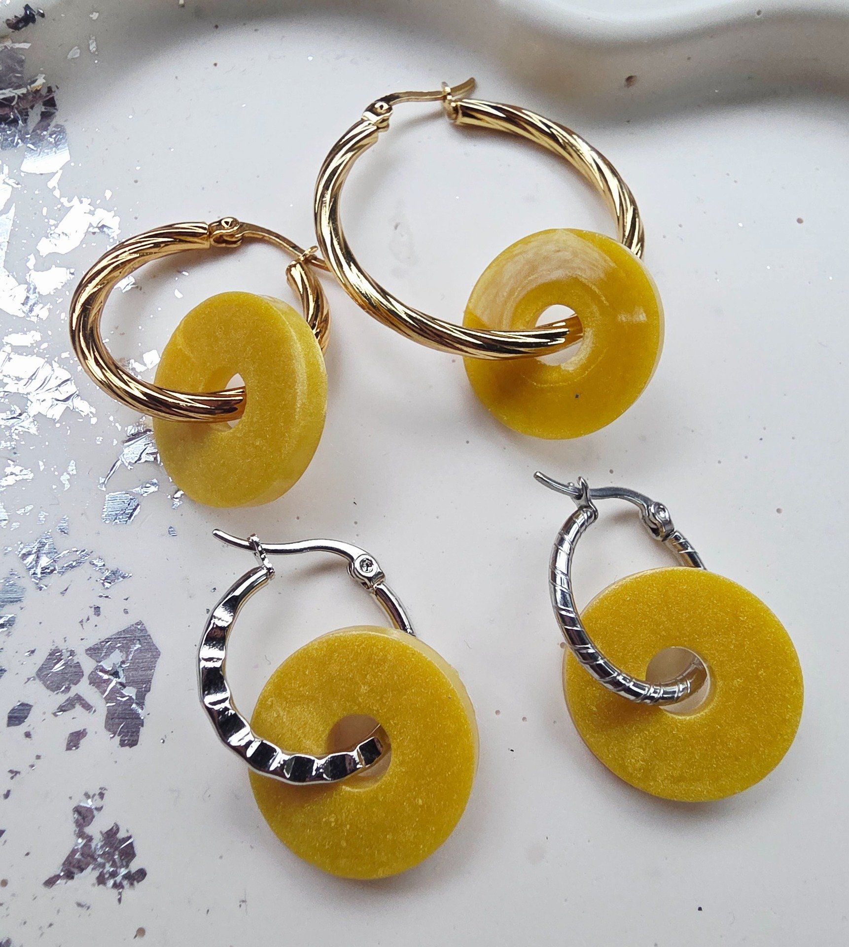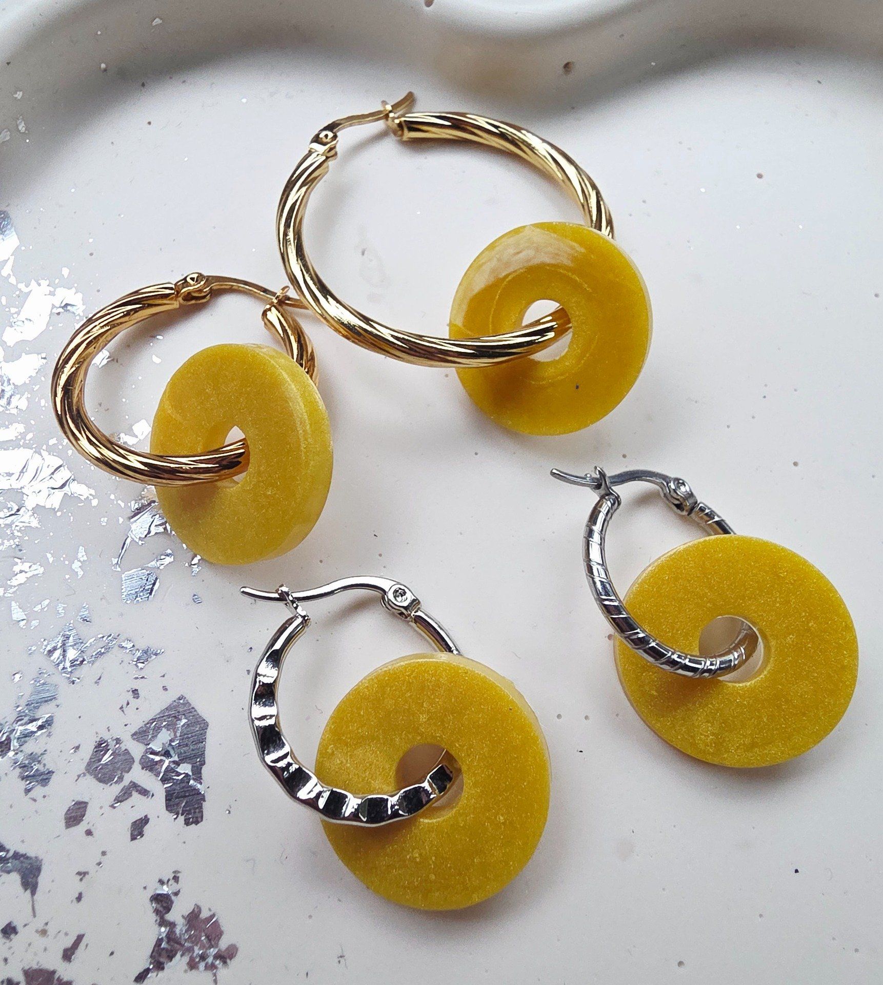 Lot de 2 Pampilles, en forme ronde, en résine époxy jaune moutarde opaque , compatibles avec les créoles vendues sur le site. Vendues sans créoles.