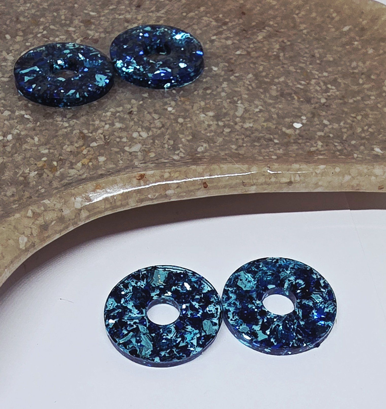 Lot de 2 Pampilles, en forme ronde, en résine époxy translucide bleue avec des incrustations de feuilles de 2 bleues différents, compatibles avec les créoles vendues sur le site. Vendues sans créoles.